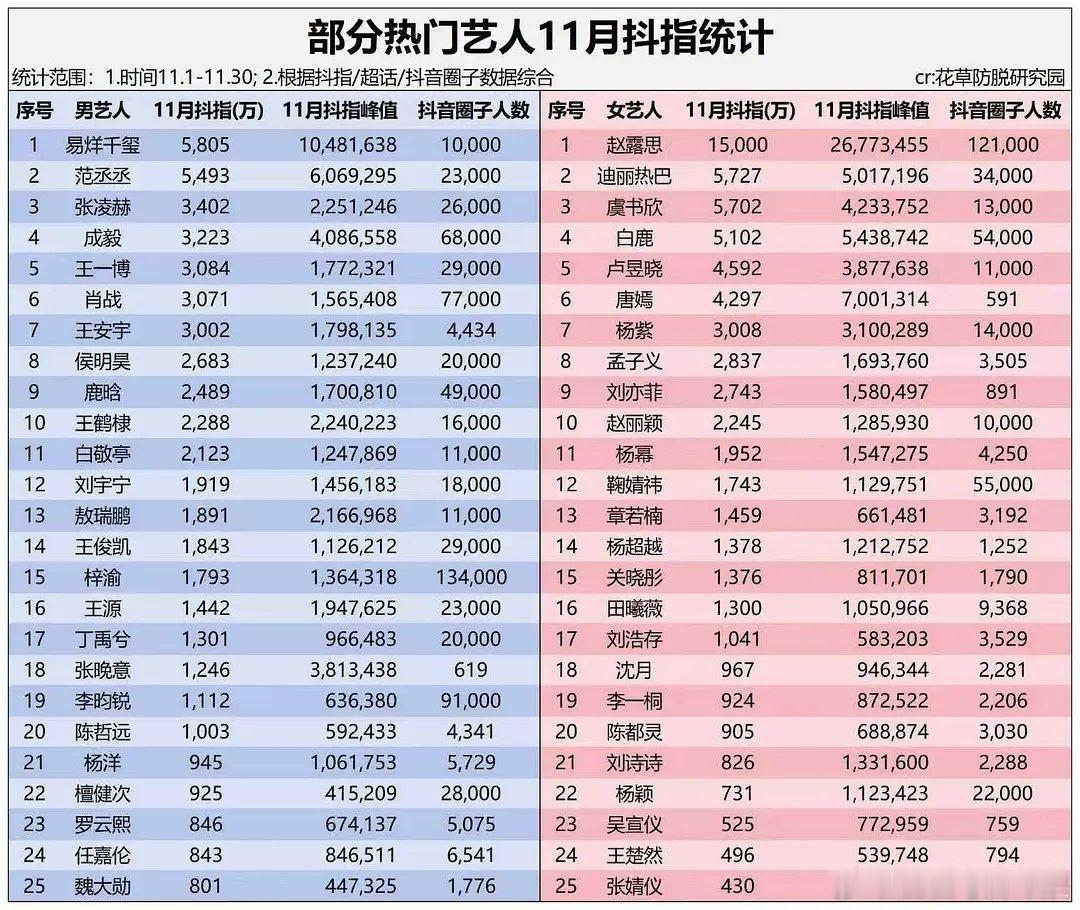11月部分艺人抖指统计表:男星第一易烊千玺,女星第一赵露思!