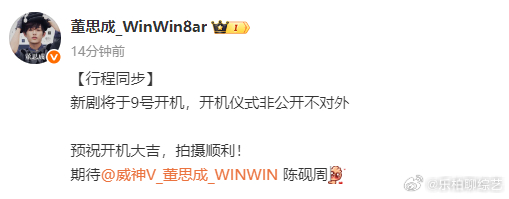 杨超越董思成新剧开机仪式非公开 杨超越董思成新剧《今天是太阳雨》开机仪式非公开,并且在6号开拍,期待一下WINWIN 陈砚周 杨超越董思成新剧6号开拍