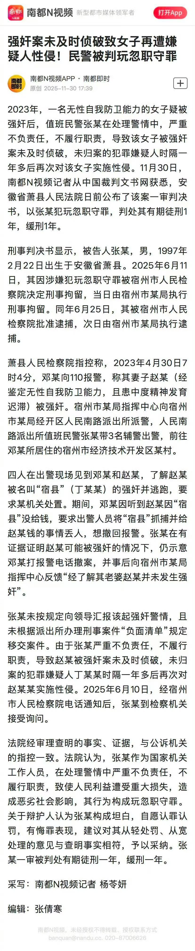 #民警玩忽职守致女子再被性侵# 【强奸案未及时侦破致女子再遭嫌疑人性侵!民警被判玩忽职守罪】2023年,一名无性自我防卫能力的女子疑被强奸后,值班民警张某在处理警情中,严重不负责任,不履行职责,导致该女子被强奸案未及时侦破,未归案的犯罪嫌疑人时隔一年多后再次对该女子实施性侵。11月30日,南都N视频记者从中国裁判文书网获悉,安徽省萧县人民法院日前公布了该案一审判决书,以张某犯玩忽职守罪,判处其有期徒刑1年,缓刑1年。南都N视频