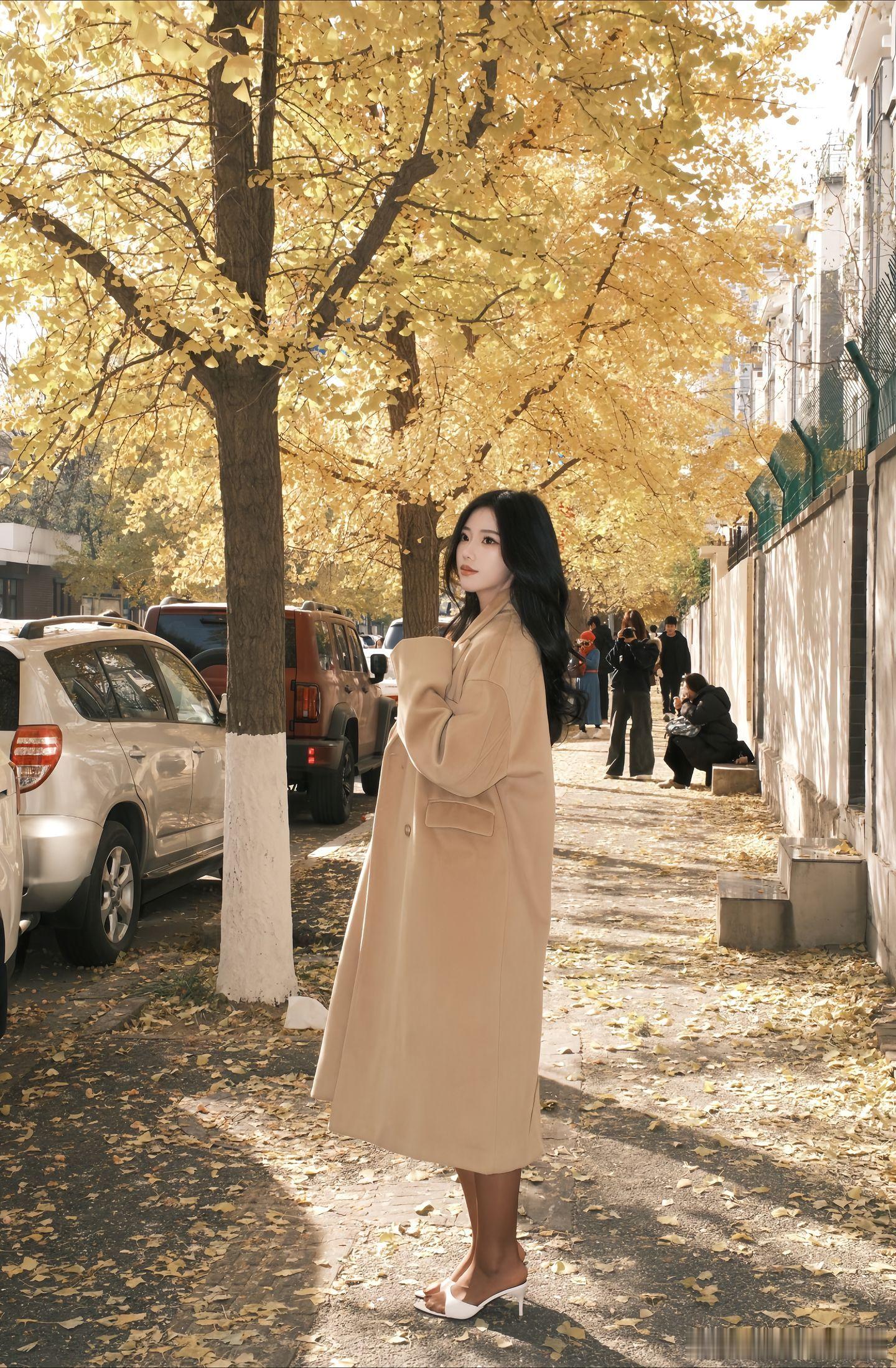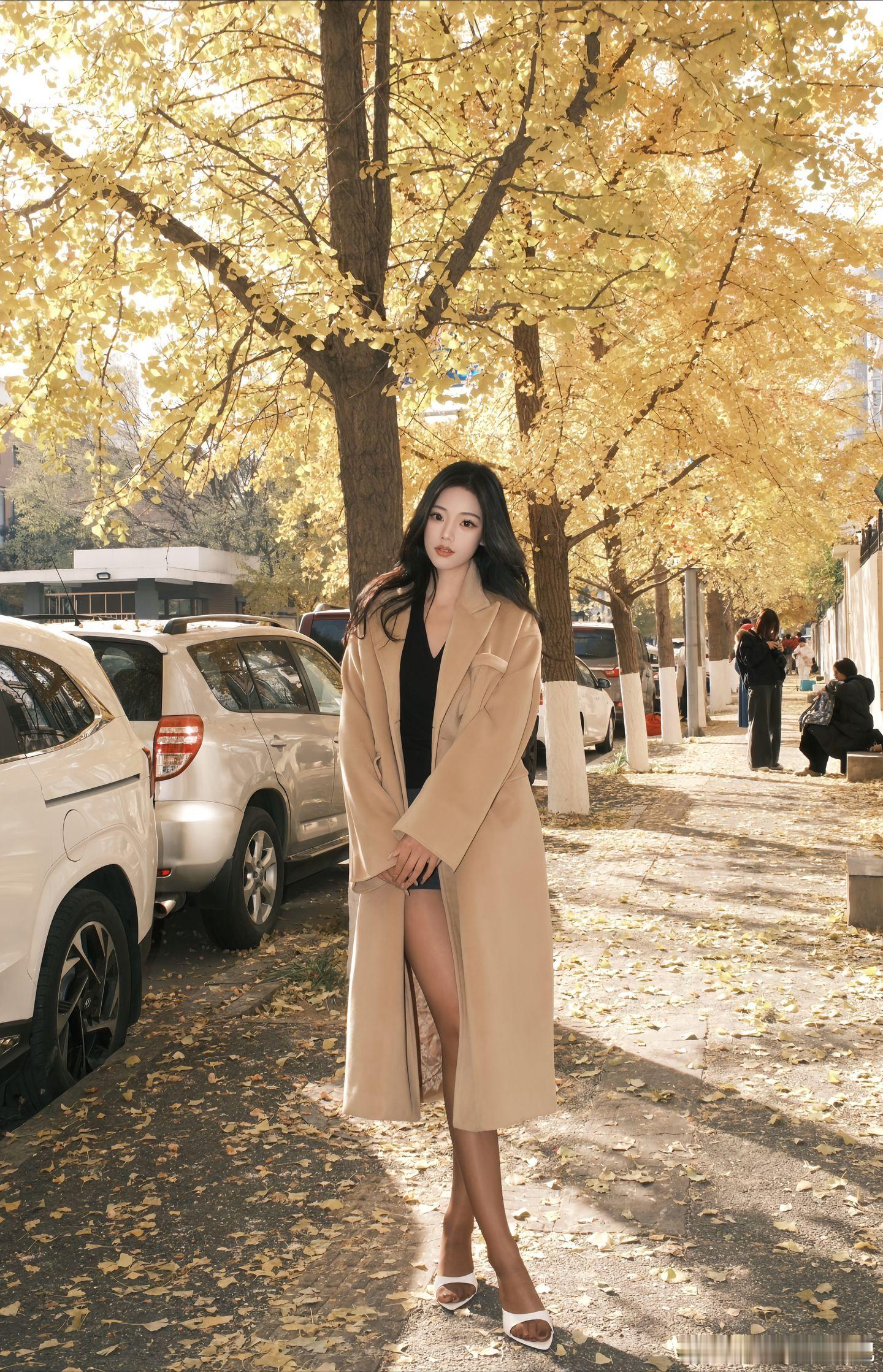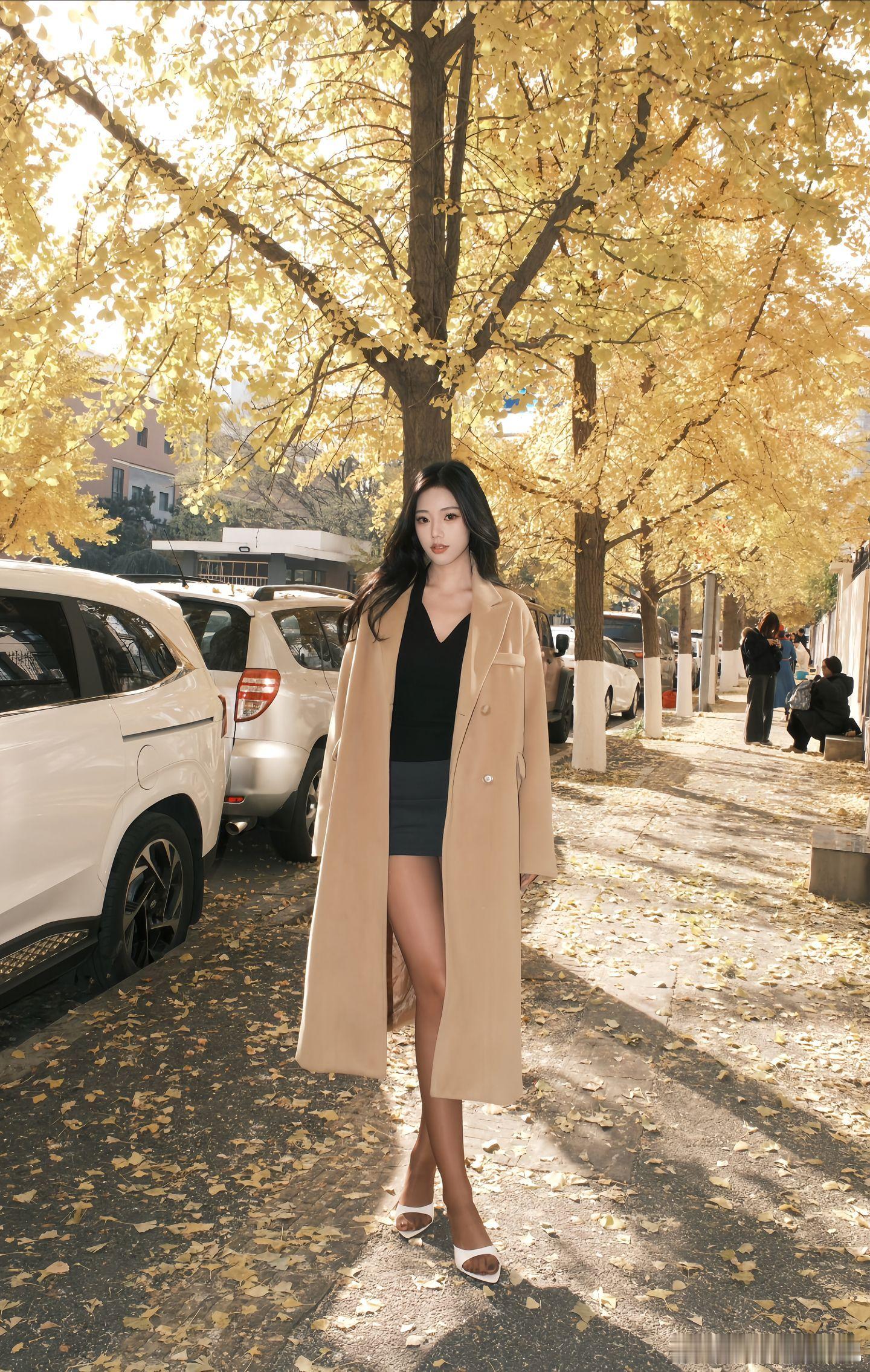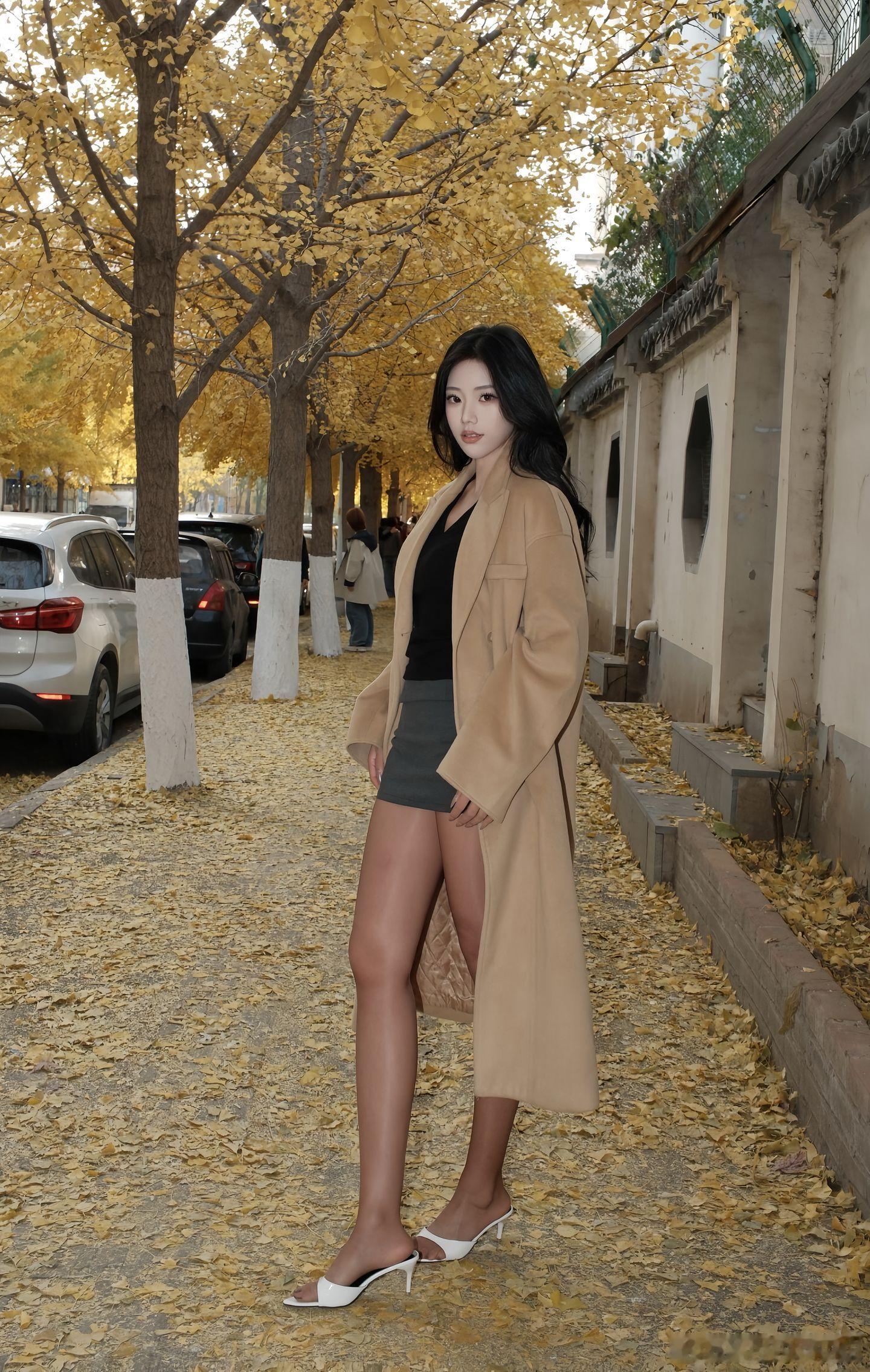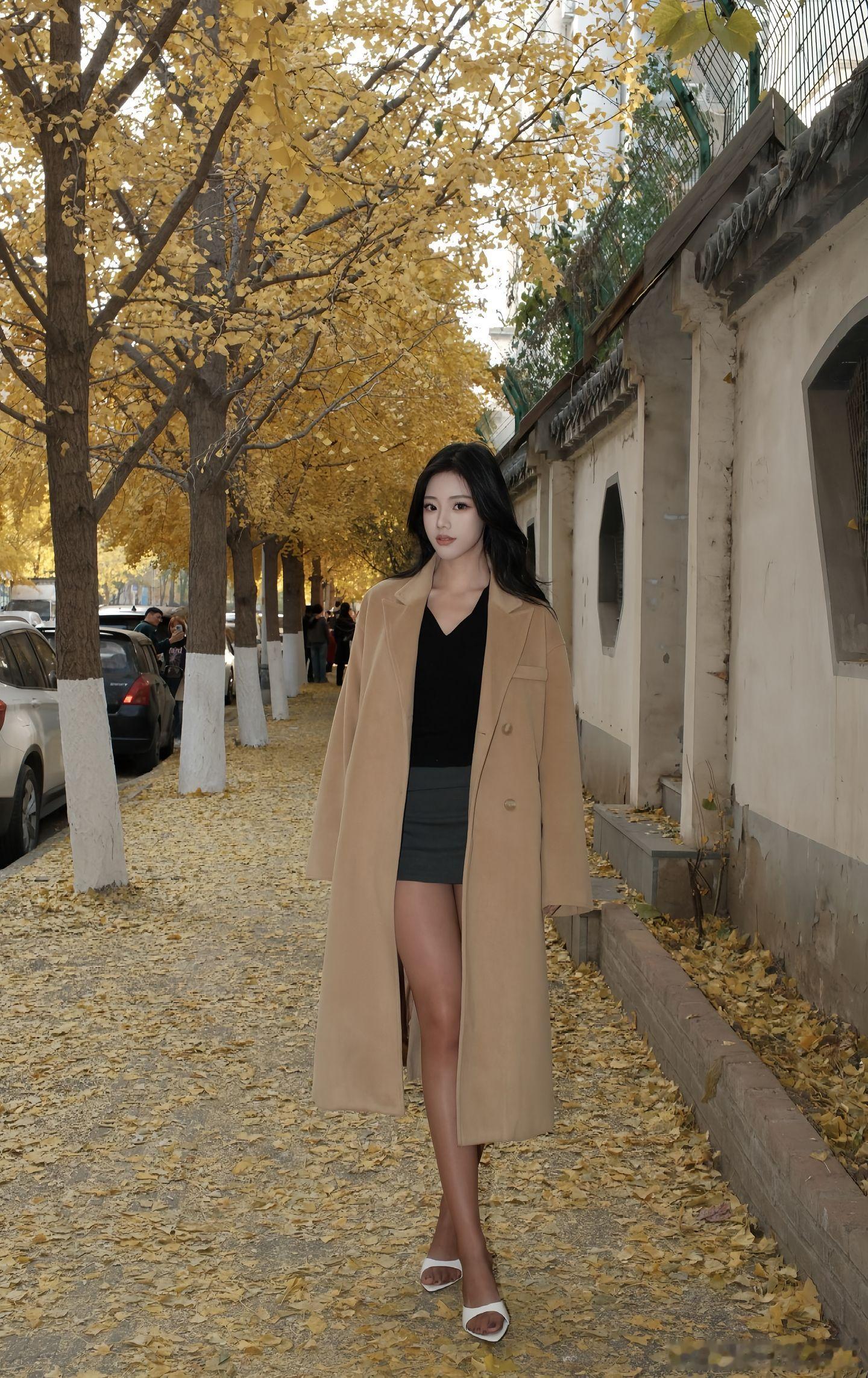 美女穿搭写真 长风衣,黑短裙美女绘梦长廊