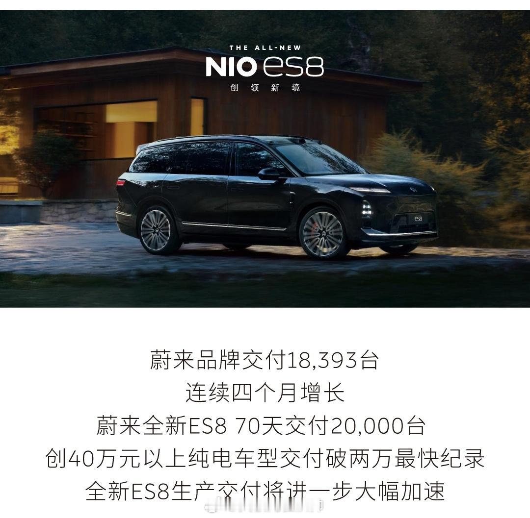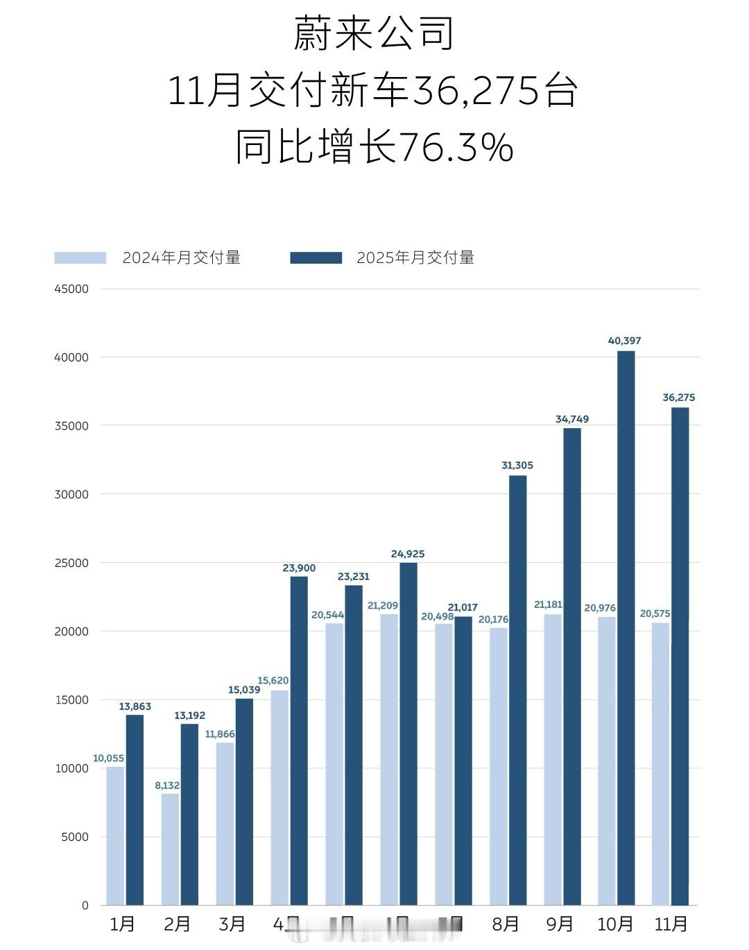 蔚来或将在12月份达成第100万台新车交付?蔚来公司11月交付新车36,275台,同比增长76.3%,其中:蔚来品牌交付新车18,393台;乐道品牌交付新车11,794台;firefly萤火虫品牌交付新车6,088台。截至目前,蔚来公司已累计交付新车949,457台,距离交付100万台的里程碑仅差5万出头,鉴于蔚来ES8的订单持续增长,蔚来公司极有可能在12月份达成第100万台新车交付。蔚来第100万辆新车交付蔚来汽车