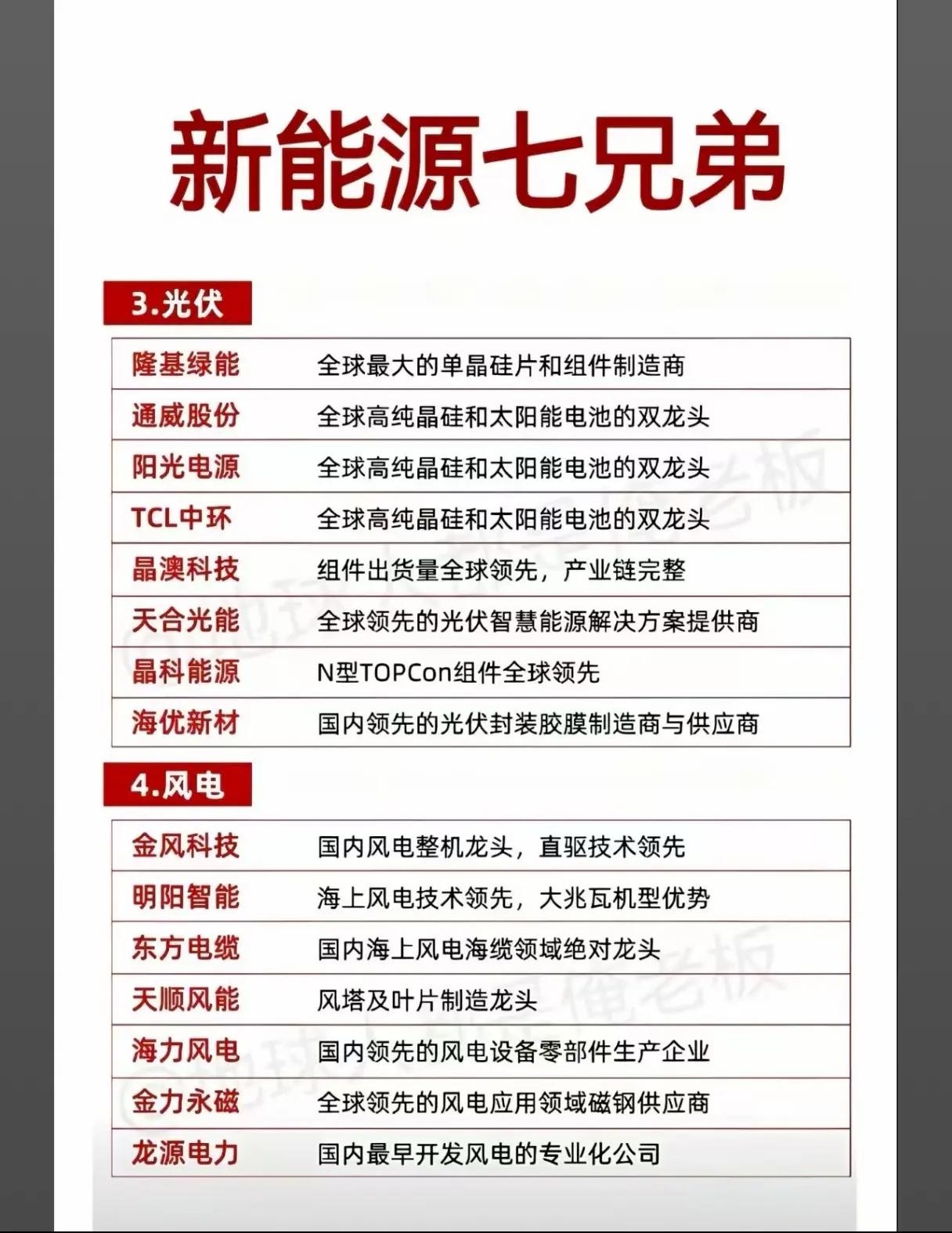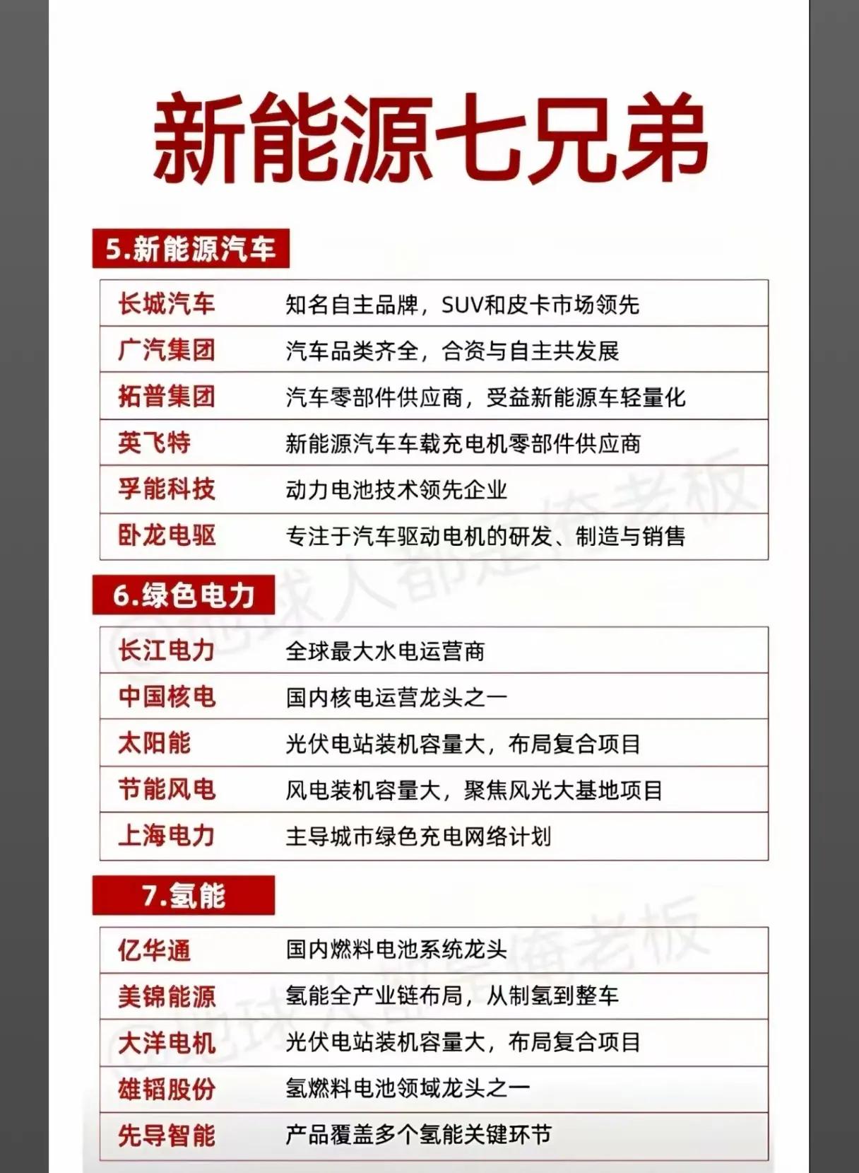 “华为深耕十大核心科技方向”和“新能源七兄弟”两大主题: 一、华为深耕十大核心科技方向 华为在十大核心科技领域的布局及相关合作企业,具体如下: 1. 华为5G&6G:涉及中兴通讯、烽火通信、武汉凡谷、春兴精工、大富科技、通宇通讯等企业。 2. 华为海思:包括深圳华强、世纪鼎利、好上好、东方中科、力源信息、优博讯、兴森科技、中电港等企业。 3. 华为鸿蒙:涵盖软通动力、润和软件、恒为科技、常山北明、九联科技、诚迈科技、科蓝软件、科创达等企业。 4. 华为鲲鹏:关联中国长城、拓维信息、广电运通、高新发展、超图软件(原文“超图然间”可能为笔误)、麒麟信安、东方通信、拓尔思等企业。 5. 华为手机:包含华映科技、日久光电(“日久光日”可能为笔误)、科森科技、精研科技、大富科技、宜安科技、凯盛科技(“凯盛科”可能为笔误)、欧菲光等企业。 6. 华为服务器:涉及拓维信息、昆仑万维、意华股份、同方股份(“同方股”可能为笔误)、慧博云通、铭普光磁、强瑞技术、恒为科技等企业。 7. 华为工业互联:包括工业富联、用友网络、宝信软件、赛意信息、东土科技、东方国信等企业。 8. 华为花瓣支付:涵盖新晨科技、中科金财、蜂助手、天源迪科、华峰超纤、拉卡拉等企业。 9. 华为液冷快充:涉及恒华科技、宝馨科技、永贵电器、英可瑞、利和兴等企业。 10. 华为欧拉:包括天源迪科、超图软件、东方国信、宇信科技、卓易信息、中国软件、创意信息、景嘉微等企业。 二、新能源七兄弟 新能源领域的四大细分方向(锂电池、储能、光伏、风电、新能源汽车、绿色电力、氢能)列举了代表性企业及其行业地位: 1. 锂电池:全球动力电池绝对龙头宁德时代(技术领先);新能源汽车与电池双龙头比亚迪(产业链完整);锂电池多元化布局的亿纬锂能(覆盖动力与储能);全球湿法隔膜龙头恩捷股份;人造石墨负极材料龙头璞泰来;全球电解液龙头天赐材料;高端锂电池设备制造龙头先导智能;锂电池生产及检测设备企业精测电子。 2. 储能:户用储能龙头派能科技(海外市场占比高);储能变流器领域代表企业固德威;抽水蓄能电站装机容量大的南网储能(布局多种储能技术);全球丰富经验的储能设备及系统解决方案供应商阳光电源;全球便携储能领域领军企业华宝新能;布局储能产品的昱能科技。 3. 光伏:全球最大单晶硅片和组件制造商隆基绿能;全球高纯晶硅和太阳能电池双龙头通威股份、阳光电源、TCL中环;组件出货量全球领先的晶澳科技(产业链完整);全球领先光伏智慧能源解决方案提供商天合光能;N型TOPCon组件全球领先的晶科能源;国内领先光伏封装胶膜制造商海优新材。 4. 风电:国内风电整机龙头金风科技(直驱技术领先);海上风电技术领先、大兆瓦机型优势的明阳智能;国内海上风电海缆领域绝对龙头东方电缆;风塔及叶片制造龙头天顺风能;国内领先风电设备零部件生产企业海力风电;全球领先风电应用领域磁钢供应商金力永磁;国内最早开发风电的专业化公司龙源电力。 5. 新能源汽车:知名自主品牌(SUV和皮卡市场领先)的长城汽车;汽车品类齐全(合资与自主共发展)的广汽集团;受益新能源车轻量化的汽车零部件供应商拓普集团;新能源汽车车载充电机零部件供应商英飞特;动力电池技术领先企业孚能科技;专注汽车驱动电机研发制造的卧龙电驱。 6. 绿色电力:全球最大水电运营商长江电力;国内核电运营龙头之一中国核电;光伏电站装机容量大且布局复合项目的太阳能;风电装机容量大且聚焦风光大基地项目的节能风电;主导城市绿色充电网络计划的上海电力。 7. 氢能:国内燃料电池系统龙头亿华通;氢能全产业链布局(从制氢到整车)的美锦能源;光伏电站装机容量大且布局复合项目的大洋电机(原文描述可能有误);氢燃料电池领域龙头之一雄韬股份;产品覆盖多个氢能关键环节的先导智能。