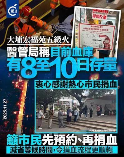 大埔宏福苑五级火,全港「一方有难八方支援」,香港市民发挥互助互爱精神,捐衫捐充电宝,有商户捐出物资,有食肆提供免费餐饮等,发扬「狮子山精神」。不少市民自发捐血,多间捐血站及流动捐血车大排长龙,有捐血站表示已满额,各方暖心支援令人感动。 不过,高Sir当日已向医管局辖下香港红十字会输血服务中心查询,他们衷心感谢各位热心市民前来捐血,目前中心血库约有8至10日存量,血库水平稳定。 作为一位已捐血近60次的恆常捐血者,高sir见今天中心也大排长龙,希望也作出了呼吁,之前网上疯传的讯息不是真确,据我了解,现在中心血库非常充足,所以市民毋须一窝蜂前往捐血,大家可于圣诞节及新年等大时大节捐血,帮助真正有需要人。