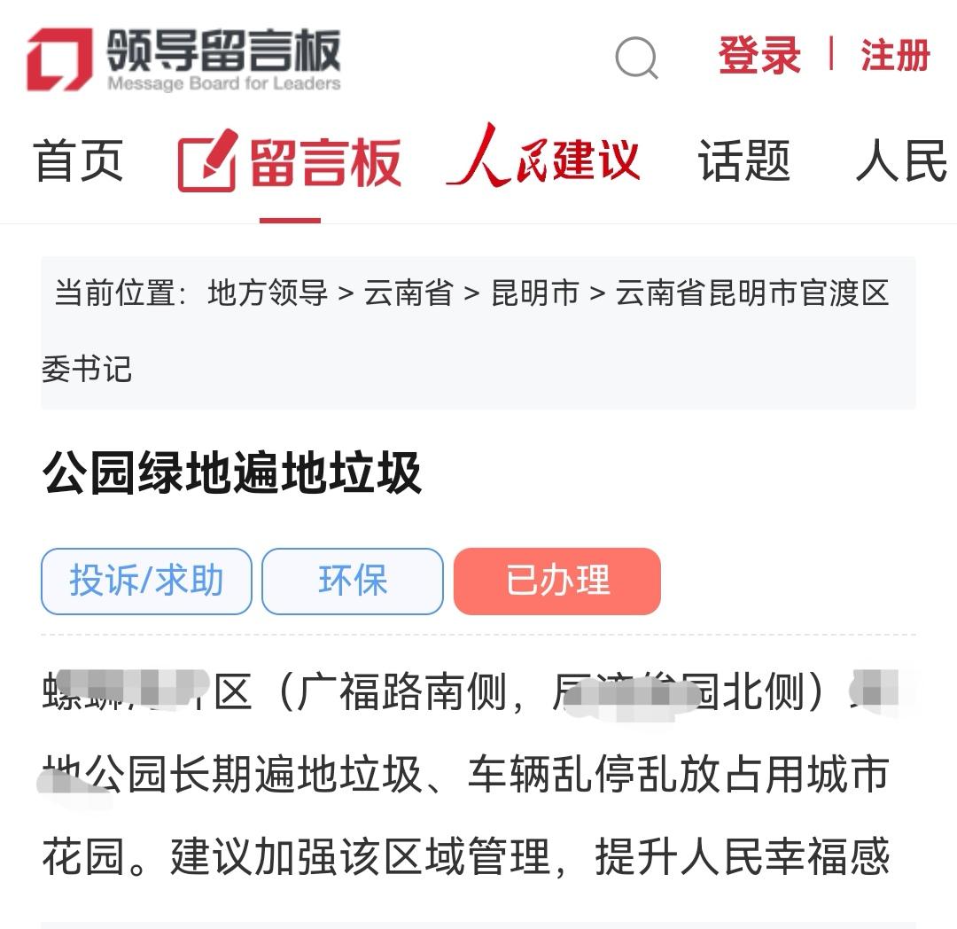 昆明网民向官渡区领导留言反映:公园绿地遍地垃圾 螺蛳湾片区(广福路南侧,辰XX园北侧)XX公园长期遍地垃圾、车辆乱停乱放占用城市花园。建议加强该区域管理,提升人民幸福感 2025-11-28 19:00 昆明市官渡区综合行政执法局官方回复 网民同志:您好! 您通过人民网领导留言板的留言已收悉,经昆明市官渡区综合行政执法局认真调查处理,现将有关情况回复如下: 昆明市官渡区综合行政执法局已督促官渡区环卫一体化项目单位XX公司工作人员及时对XX公园内垃圾进行清理,同时加强日常管理养护,目前已完成该区域垃圾清理工作。 下一步,昆明市官渡区综合行政执法局将加强绿化管理养护保洁工作,确保环境卫生干净整洁,为市民提供良好的市容环境。 另关于您反映的车辆违停问题,由交警部门进行管理处罚,交警部门属于垂直管理部门,建议您向昆明市公安局(昆明市交警支队)反映此问题。 感谢您的理解与支持,顺祝身体健康、生活愉快! 垃圾