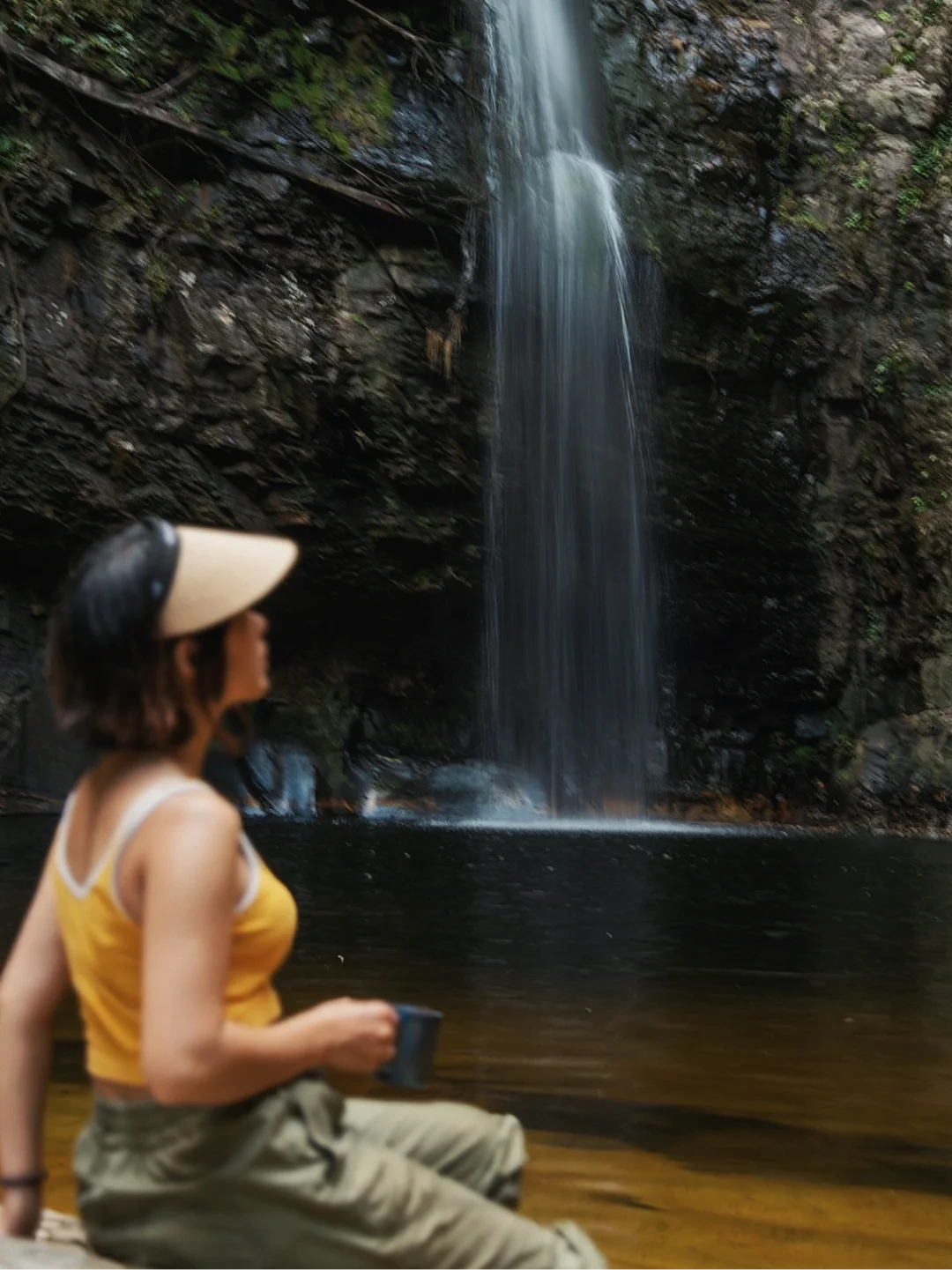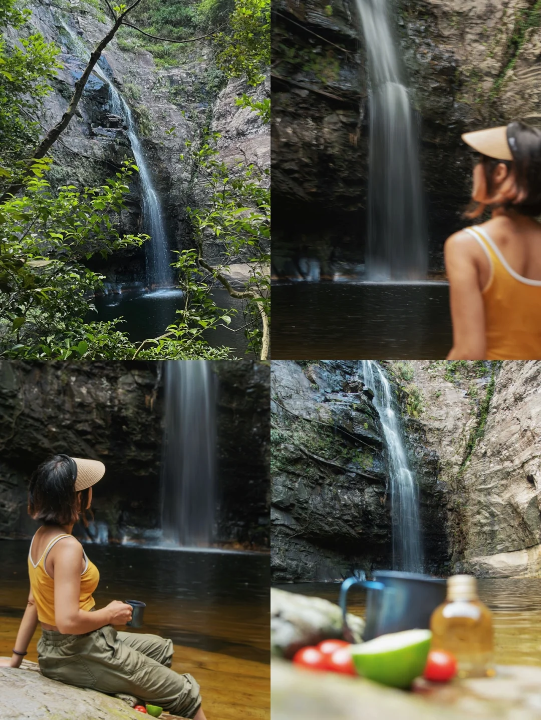 4️⃣瀑布潭底颜色为金色,俯瞰是心型形状,可以游泳潜水,可简单野餐,不建议露营