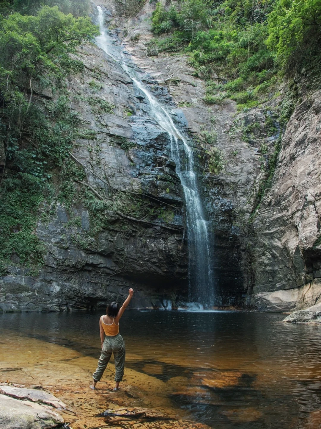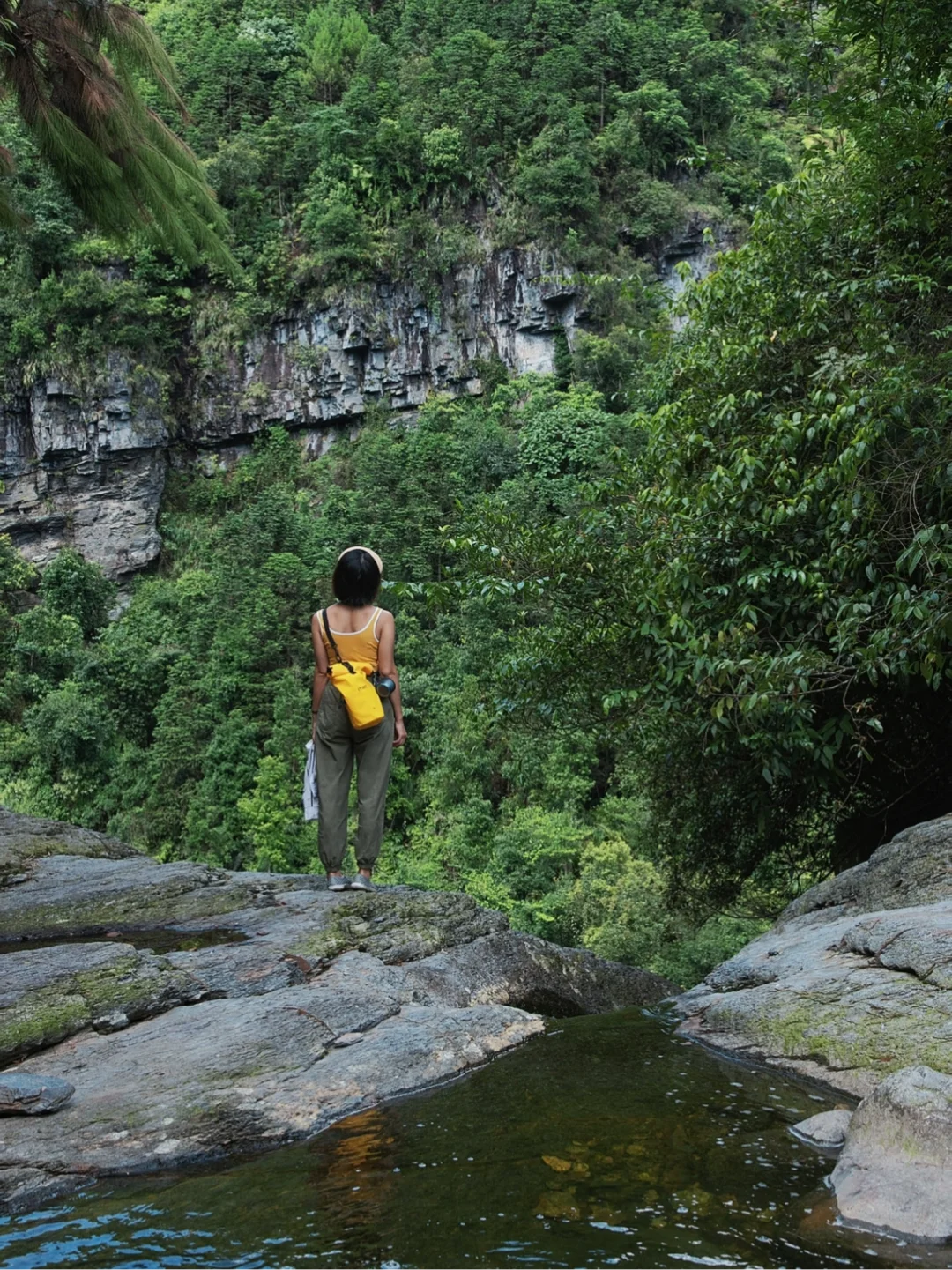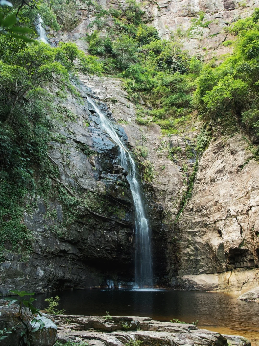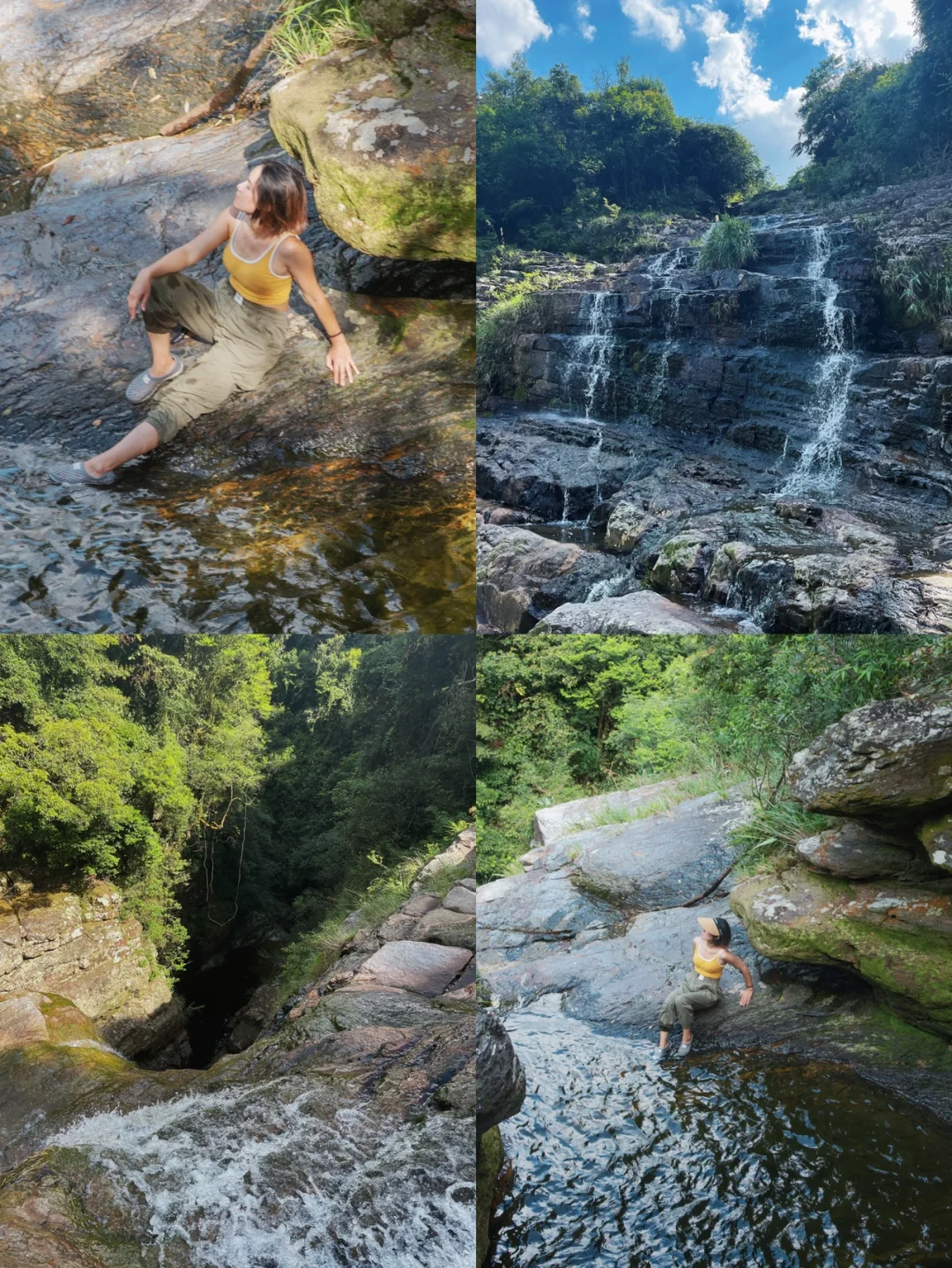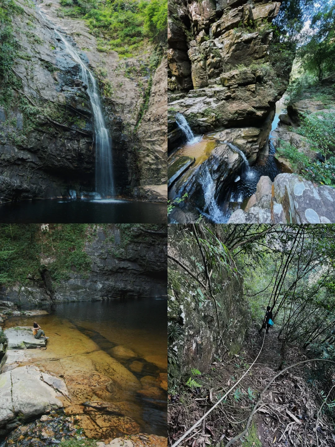 3️⃣下到瀑布底部,难度不大,瀑布底是狭长的潭子,可以潜水游泳。切勿靠近试探下六女瀑布,石壁湿滑非常危险