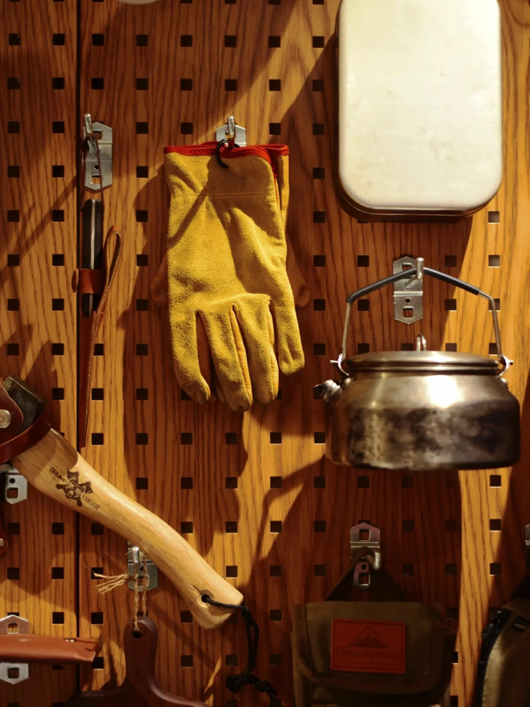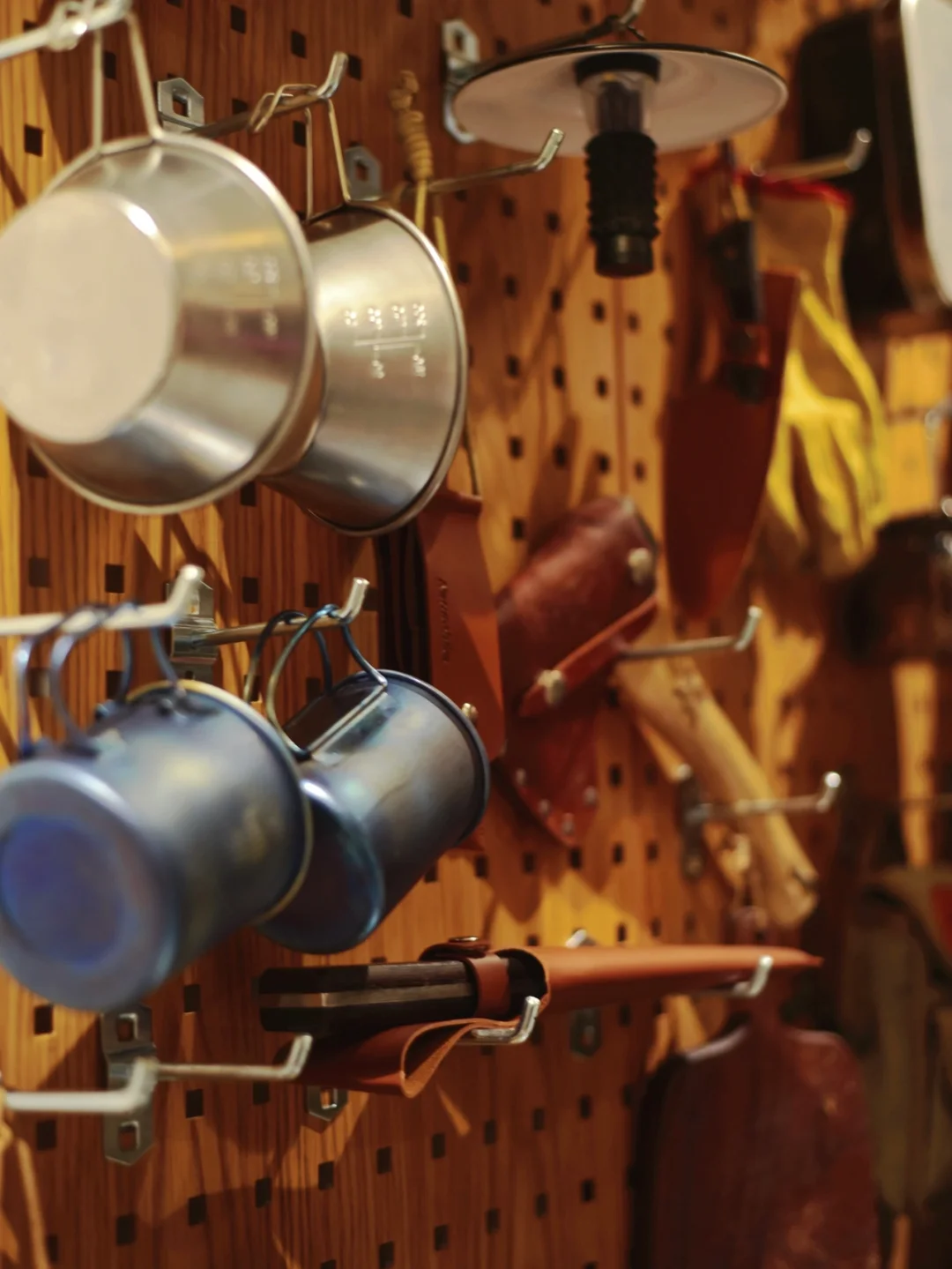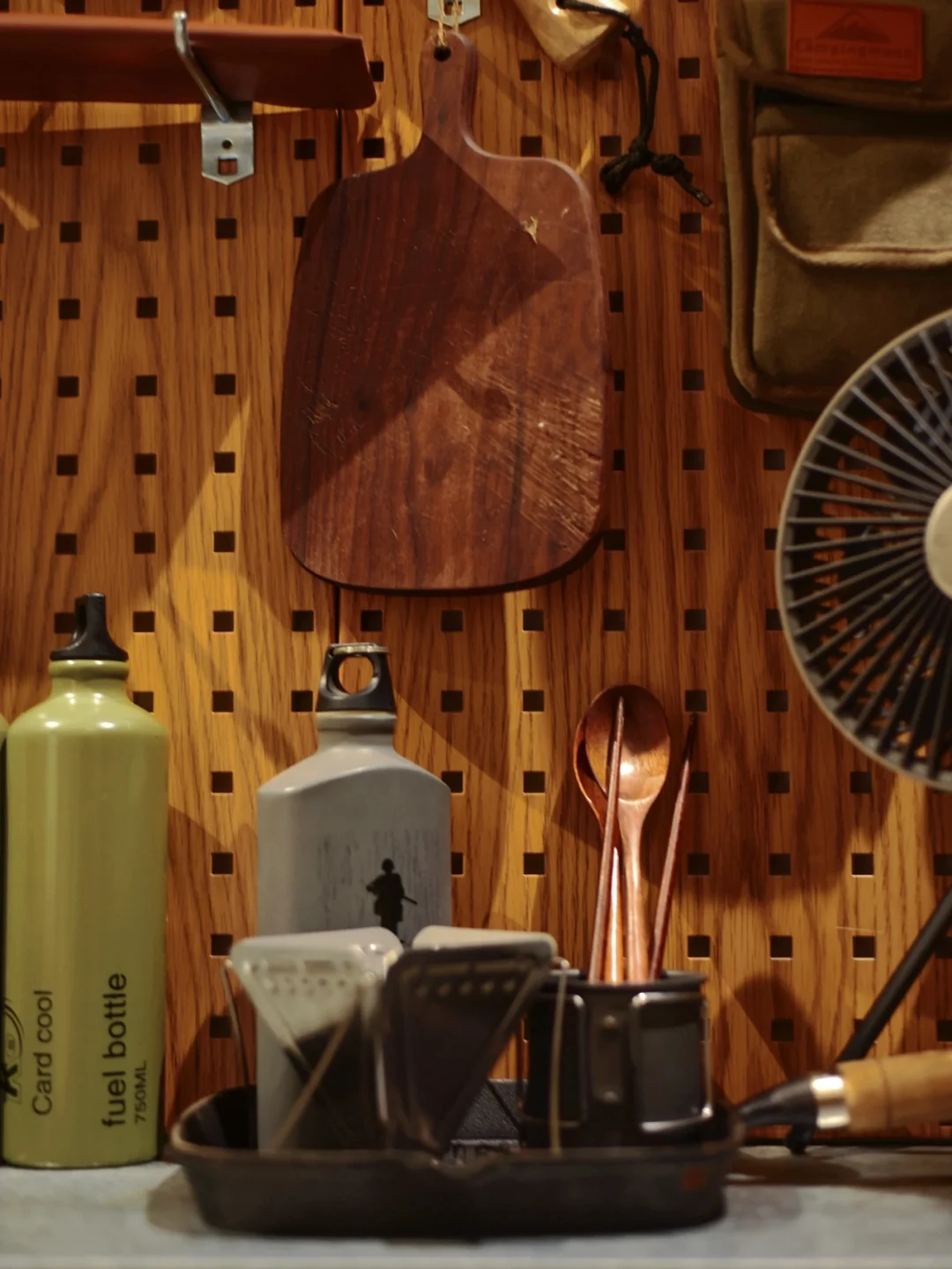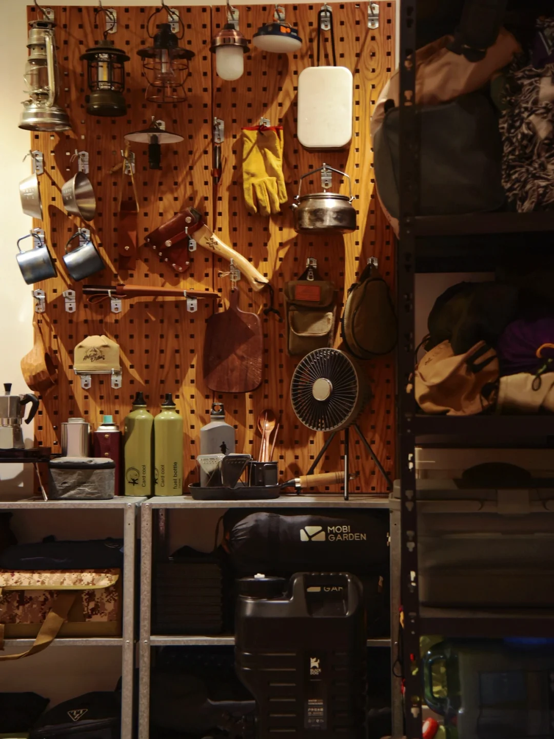 1️⃣ 易遗漏小物件装备区使用洞洞板:可放置易遗漏的露营⛺️小物件。当露营⛺️装备日益争增多的时候,很容易找不到比较重要的小物件,上墙还蛮有必要。