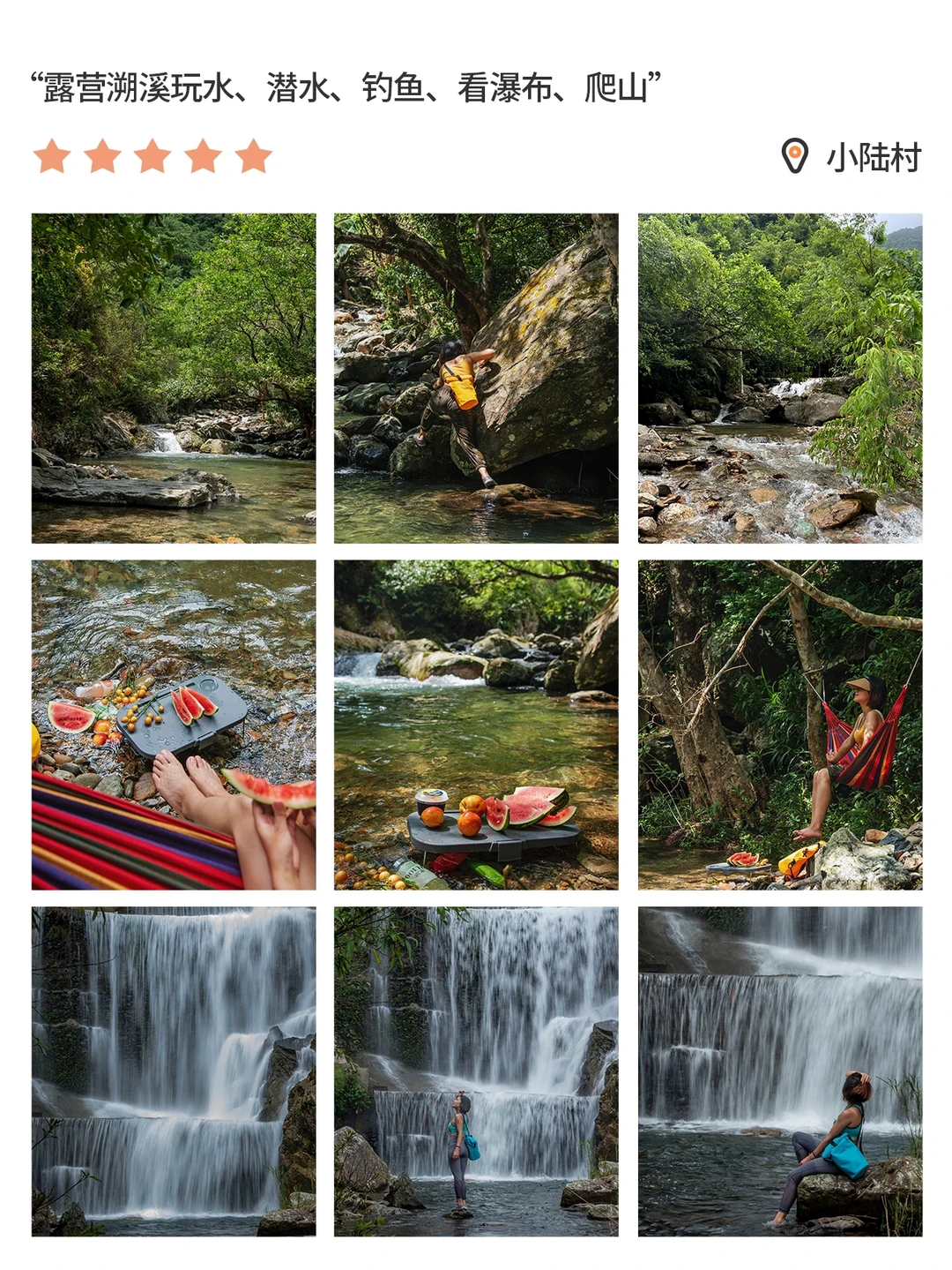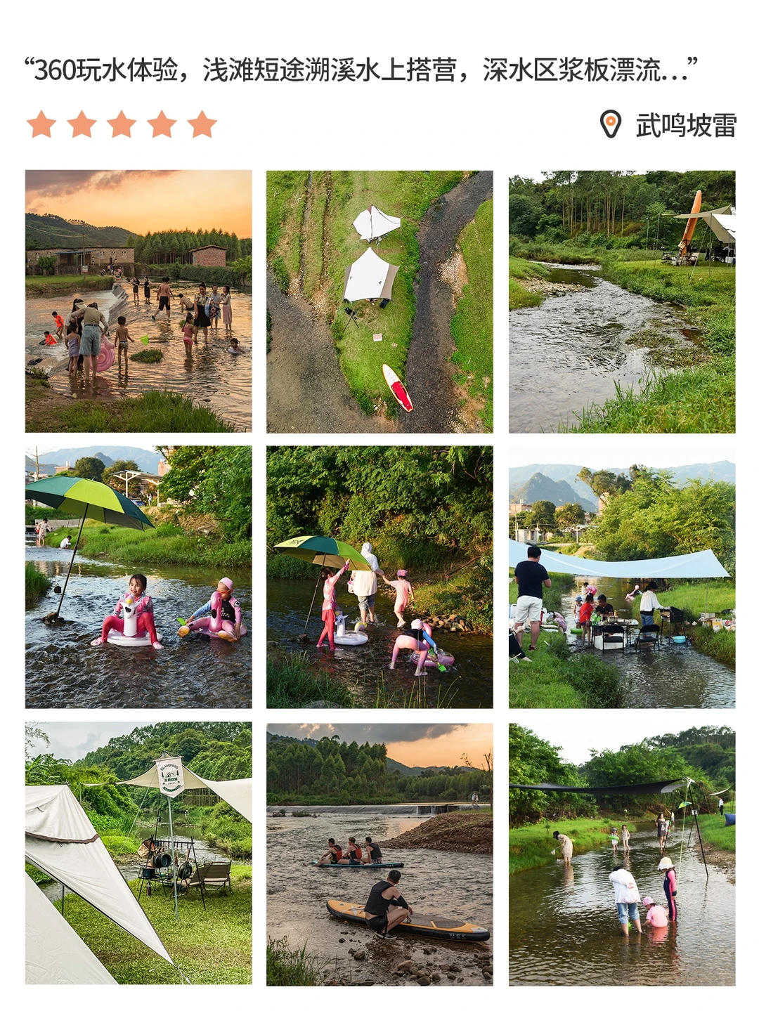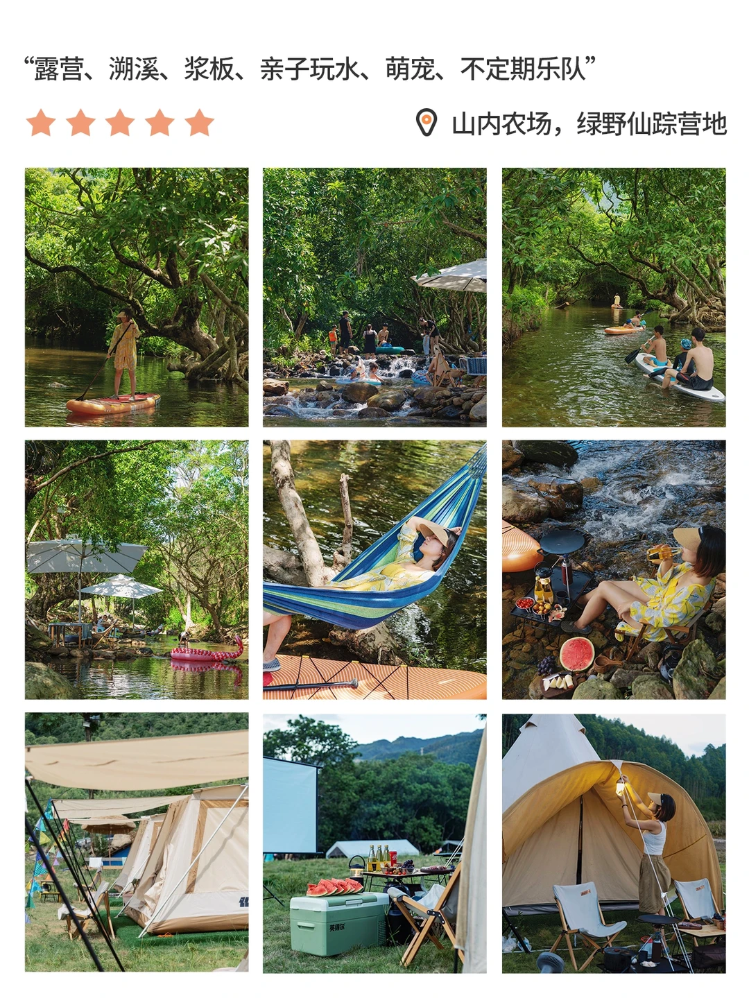 📒:收费,超大草坪,360度环形水域,可过夜露营、短途溯溪、玩水、游泳、桨板、看星空、水上搭营;有厕有热水淋雨