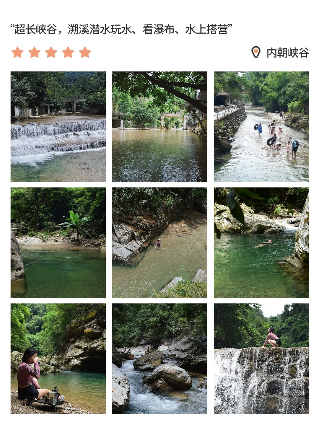 📒:收费,外面河床宽浅平,可以水上搭营,有水滑梯,有泳池,可吃饭可住宿可洗澡。峡谷里面很深,每走一小段就能看到水潭,可游泳潜水野餐,景色宜人。溯溪大概走5h↔️可到龙母浣纱瀑布。