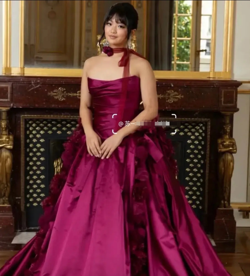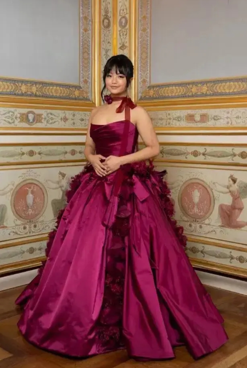 比亚迪总裁王传福的女儿,穿酒红色公主裙出席,她身材好丰满、长相挺一般!