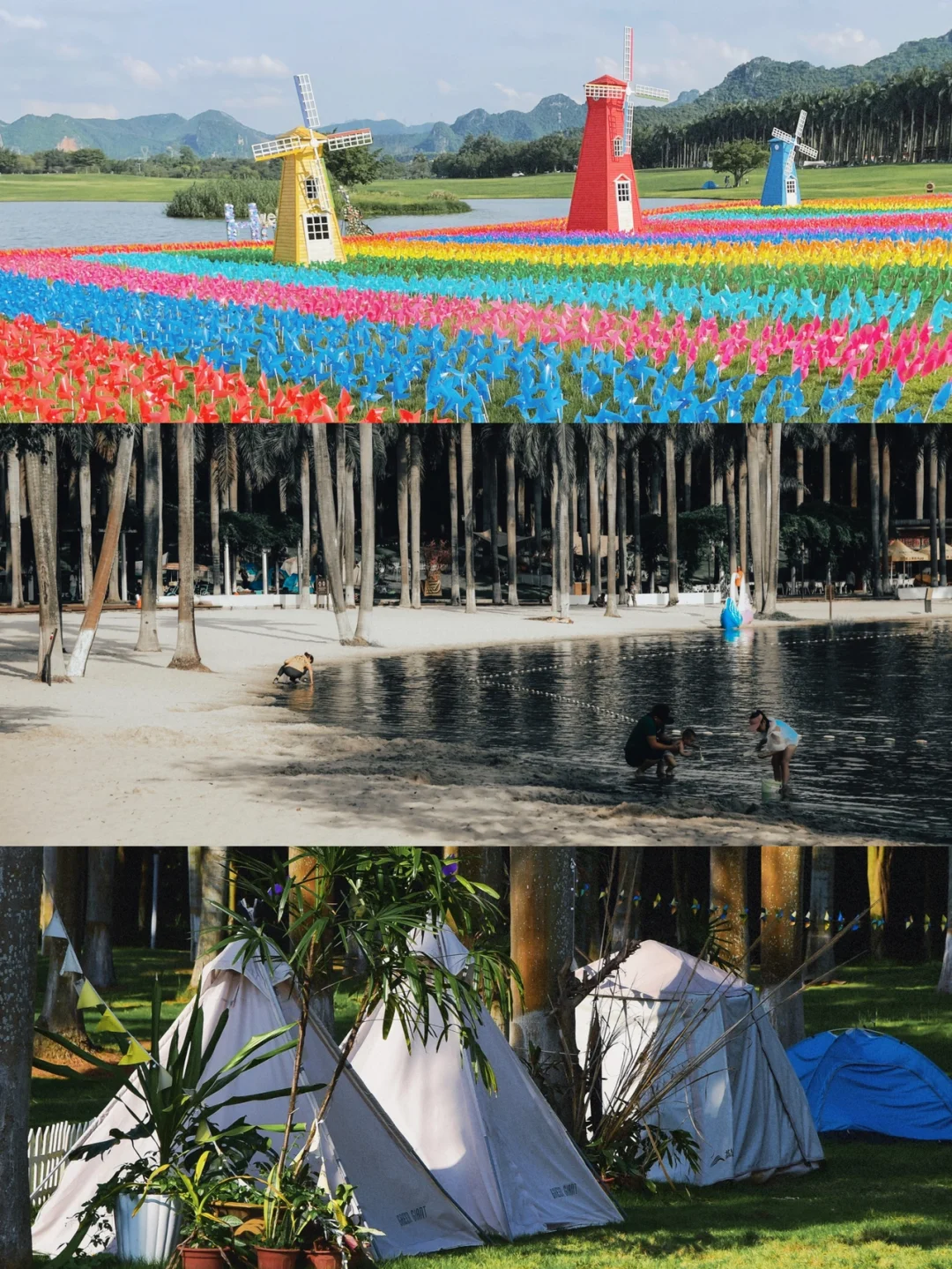 这里有椰树林、沙滩、风雨桥、花山栈道、水杉绿道、莲花池…景区不定期会布置不同的打卡区,最近我们去是荷兰风车主题