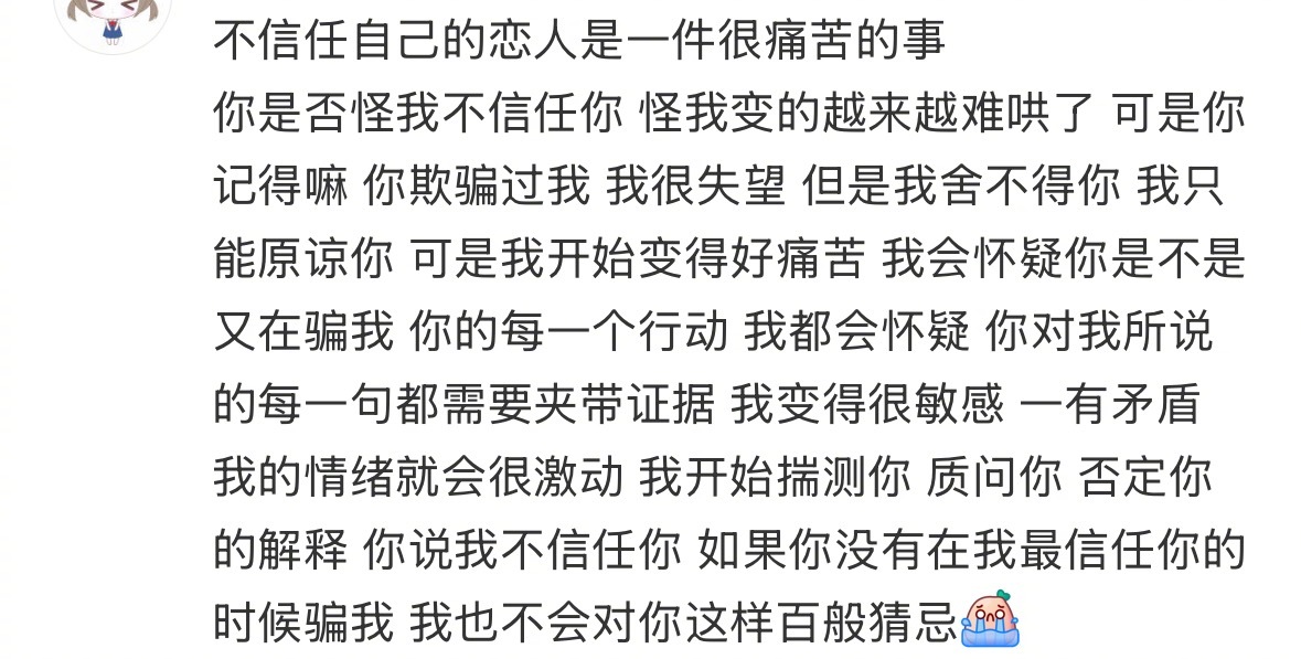 我认为情侣之间信任基本就是不去做让对方不安的事而不是让对方感到不安后说服对方信