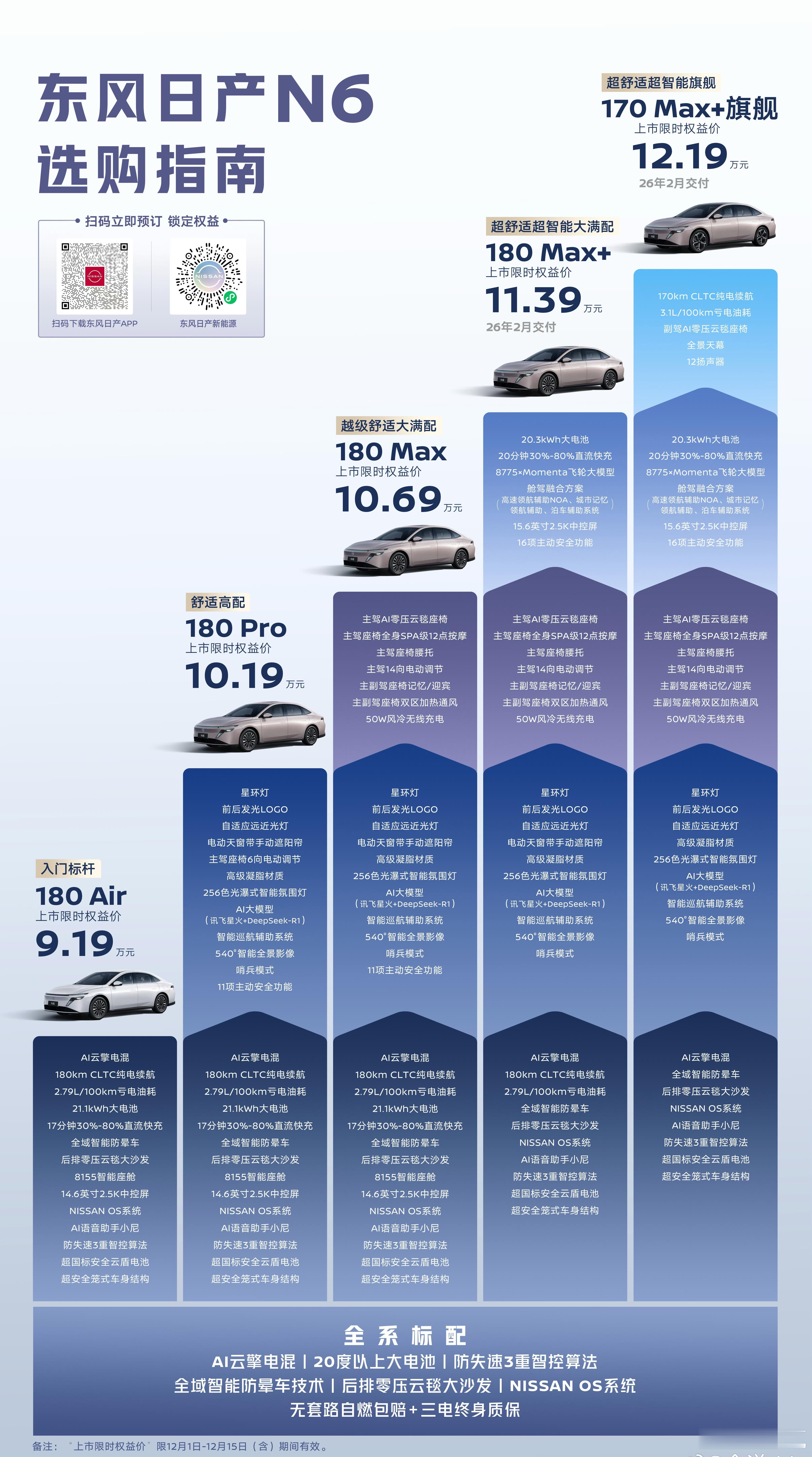 日产N6价格来了,9.19万起步,顶配12.19万。冰箱沙发、momenta AI大模型、SPA极12点座椅按摩、星环灯、NISSAN OS系统等等。颜值高,配置全,价格低,看以后谁敢说开日产老派大电池超舒适插混N6售9.19万起东风日产N6