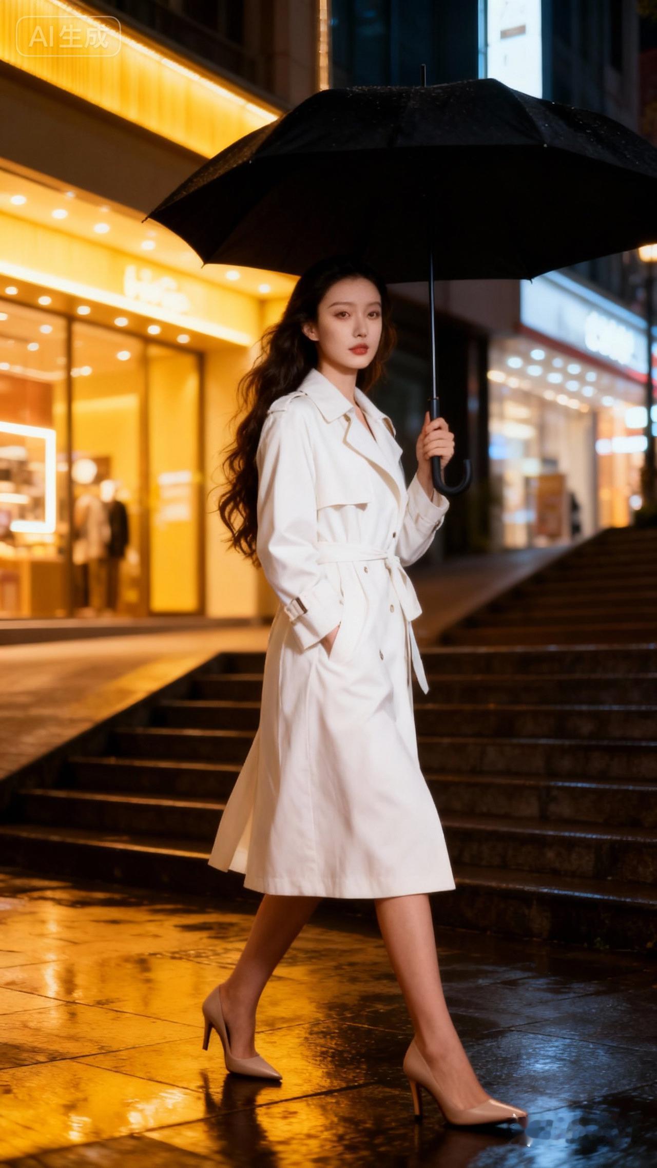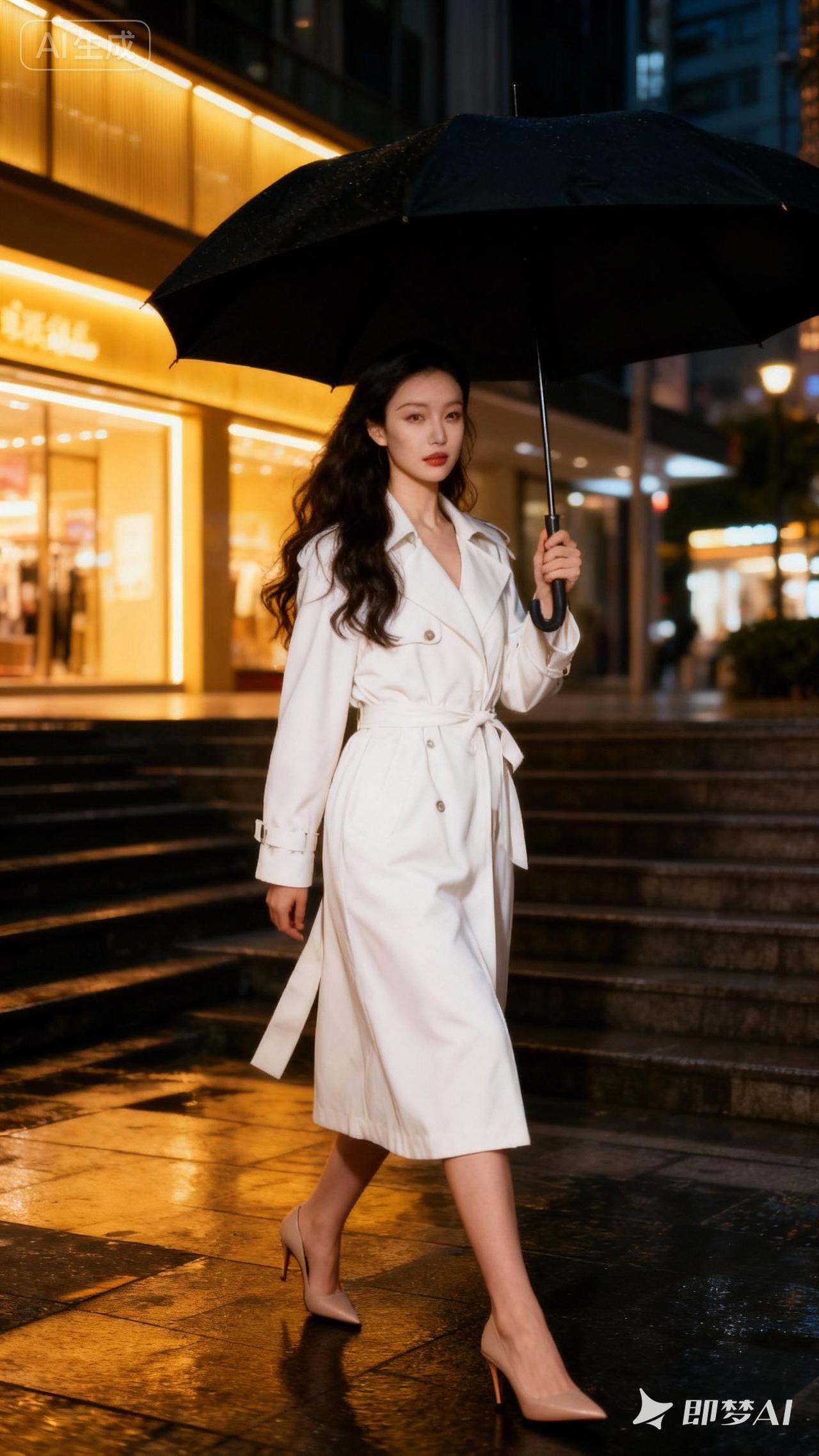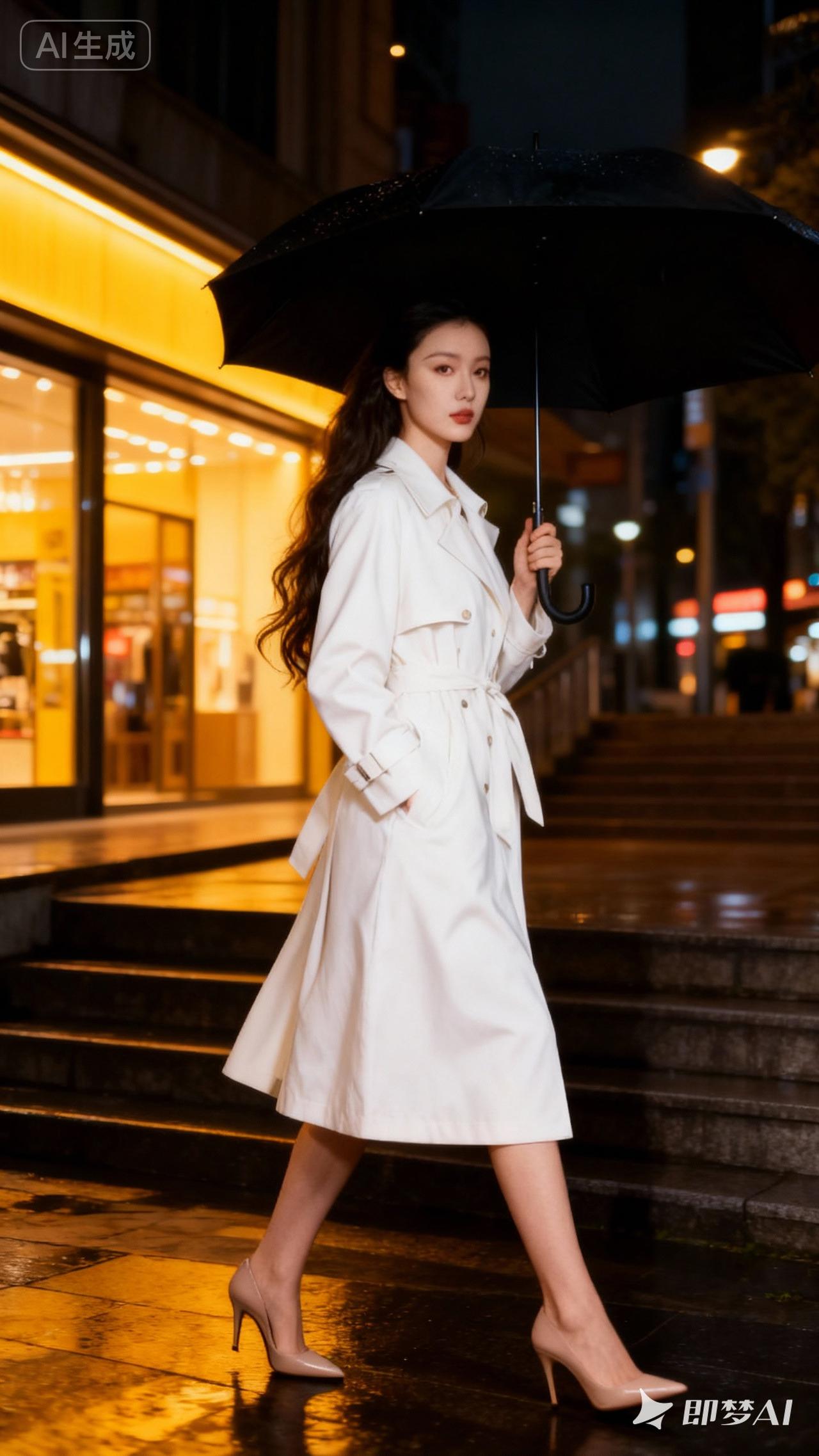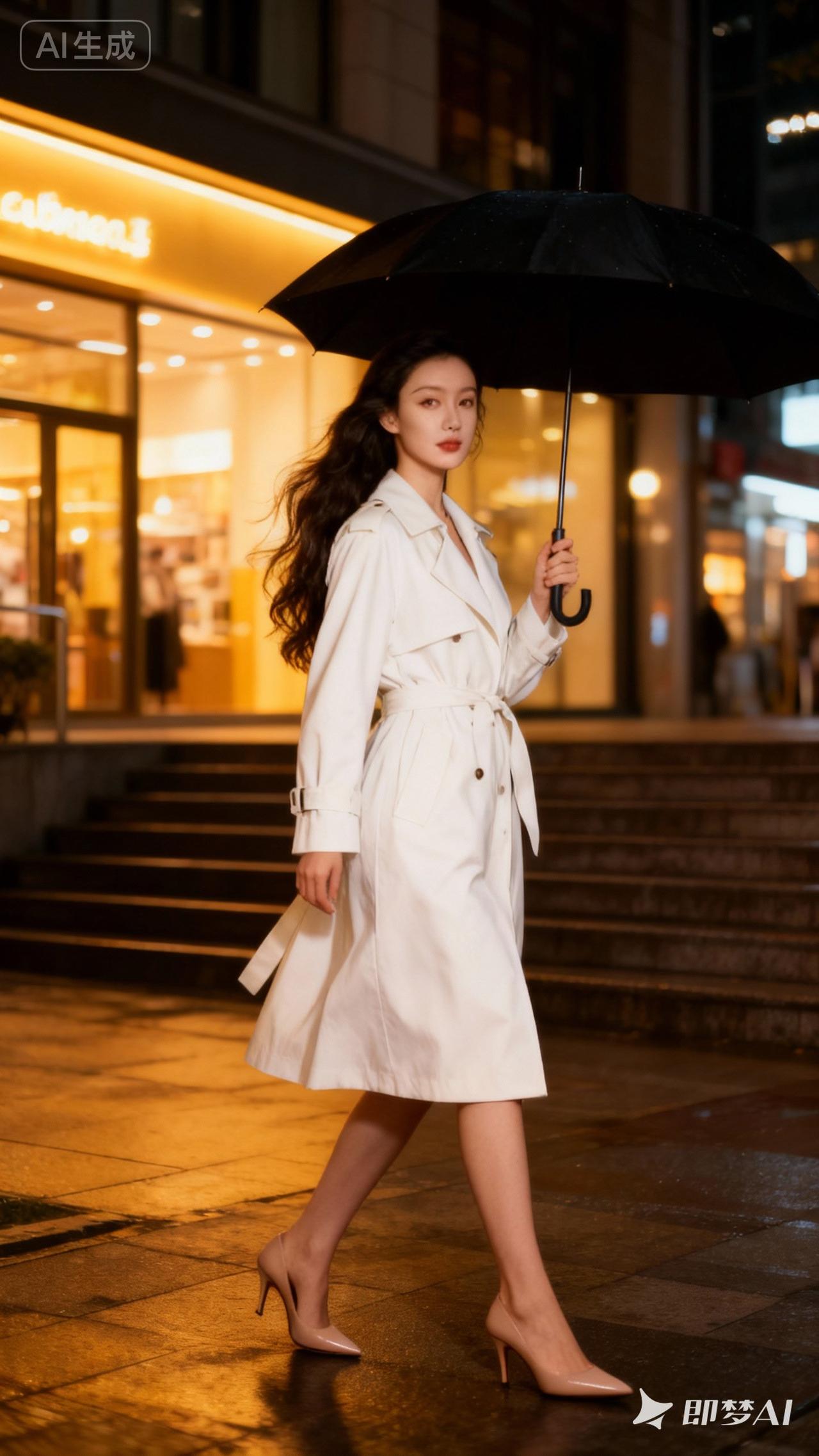 雨夜漫步,优雅白衣,撑伞漫步在都市街头。