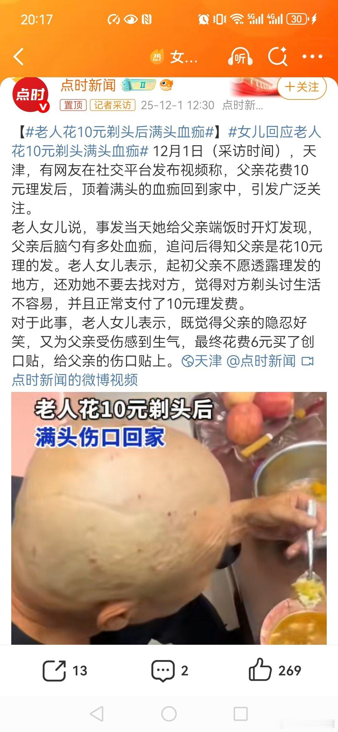 【老人花10元剃头后满头血痂】女儿回应老人花10元剃头满头血痂 老人的头确实不好理,特别是要理这种光头的,老人头皮不紧实不光滑,手艺稍微差点就这样了。所以现在年轻理发师都不给剃头。以后都没人给剃头了。当然这就是我们的父辈,善良,从不给别人添麻烦。老人家也是善良的,