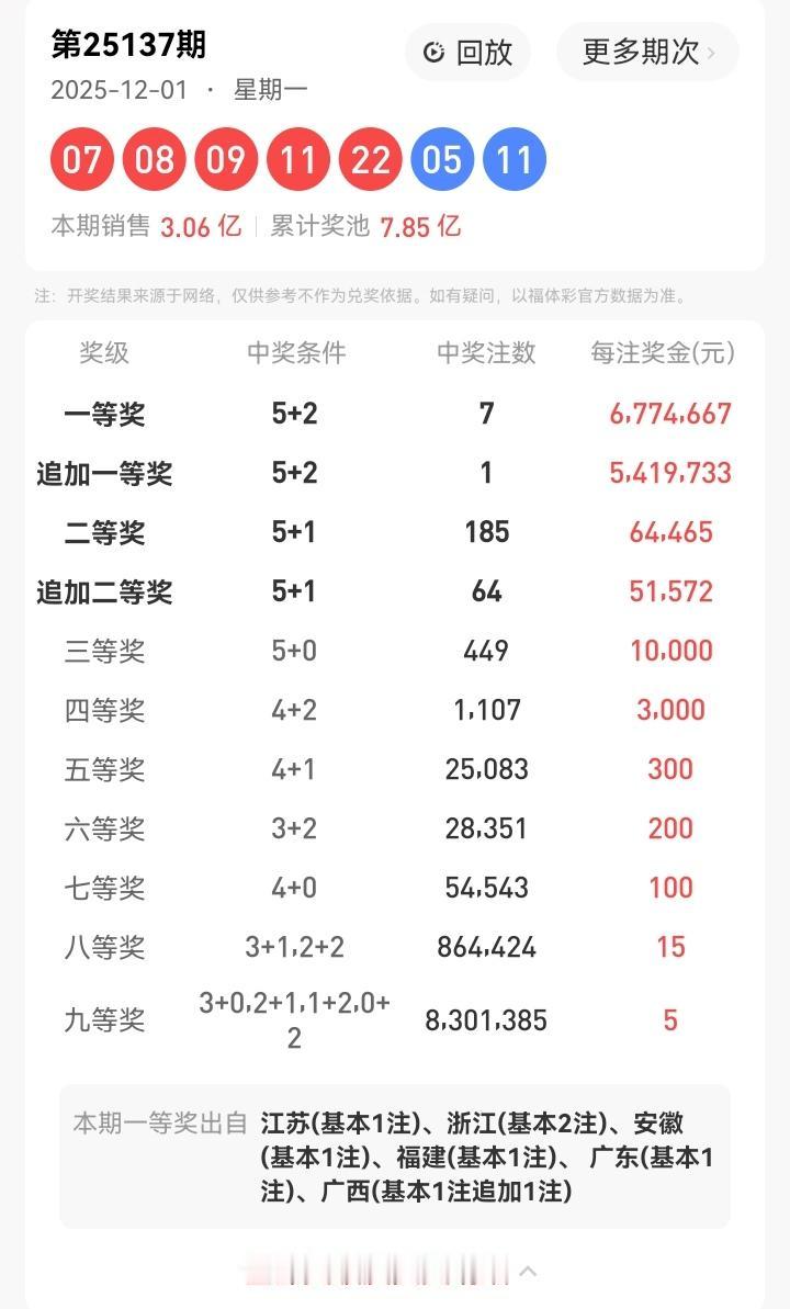 12月1号星期一,大乐透开奖号码揭晓:07、08、09、11、22—05、11。本期大乐透开奖号码前区红球开出了两枚重号07、11号,开出了一组三连号07、08、09号,后区蓝球开出了奇数组合05、11号其中11号是枚重号。 本期大乐透开奖号码前区红球小号居多,开出三连号,有一定难度。一等奖开出7注,单注奖金677万元,追加一等奖开出1注,单注奖金541万多元。一等奖中奖分布:江苏安徽福建广东各中得一注基本一等奖,广西中得一注追加一等奖,浙江中得两注基本一等奖。
