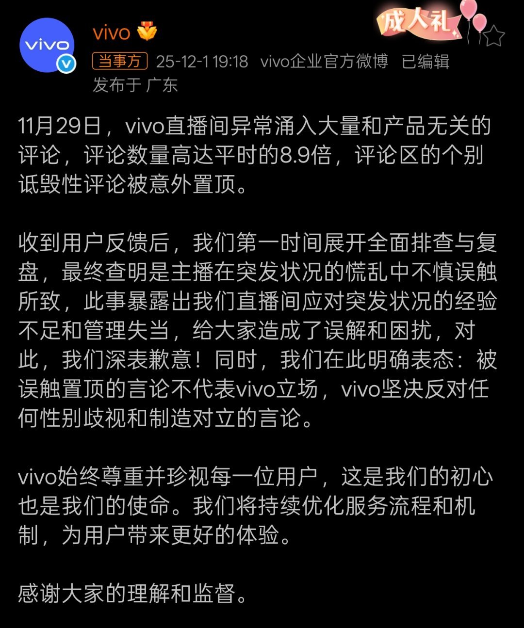 昨天开始这个事情就一直在发酵,而且速度非常惊人。这背后真的不知道又是谁在搞事了。这波也是莫名其妙就被冲了,真的很可怕。因为之前那啥带货过蓝厂所以就去冲,这些人也真的是,无语。一开始可能是针对某些人,而之后直播间这个误触导致的问题,估计就还有另外一波针对蓝厂的了。不过这波也是说明了直播间存在的漏洞问题,蓝厂应该很快会整改出来了。vivo回应直播间风波