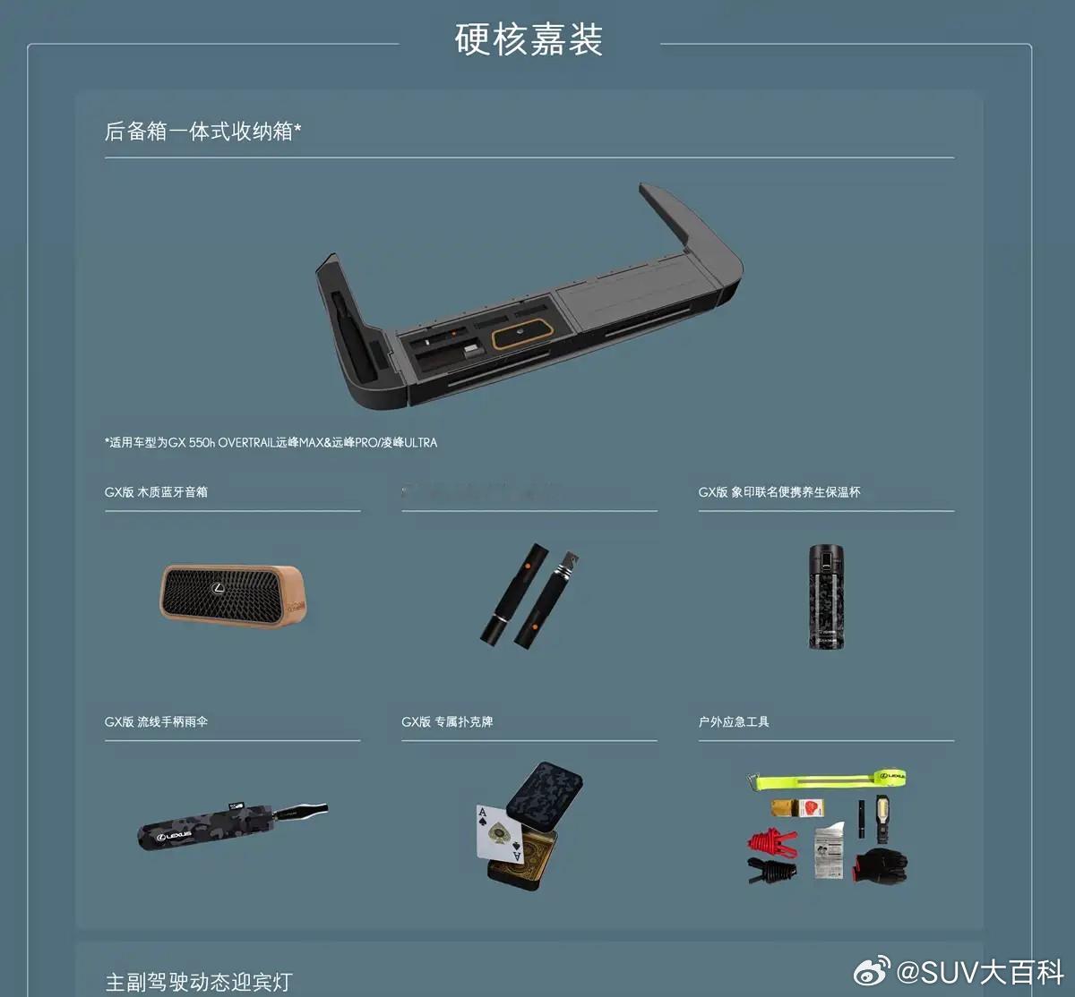 新款雷克萨斯GX 正式上市,全系4款车型,售价77.8-89.98万元,并提供硬核嘉装、畅行无忧、致友同享三项购车礼遇,其中硬核嘉装包括木质蓝牙音箱、后备厢一体式收纳箱、应急手电筒、前排动态迎宾灯等装备配置方面,14英寸中控屏升级车机系统,整合Cloud Navi导航、智能语音助手、手机互联等功能,还将提供64色氛围灯、LSS+3.0驾驶辅助等功能动力依旧搭载2.4T+P2电机的混动系统,峰值输出282马力+54马力,匹配8AT变速箱+全时四驱,再加上离地间隙提升25.4mm,以及OVERTAIL独享的电子动态悬架系统E-KDSS,可根据路况和驾驶模式,电控断开防倾杆,提升悬架行程和通过性SUV大百科大v聊车