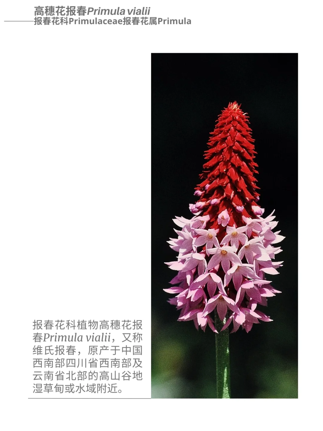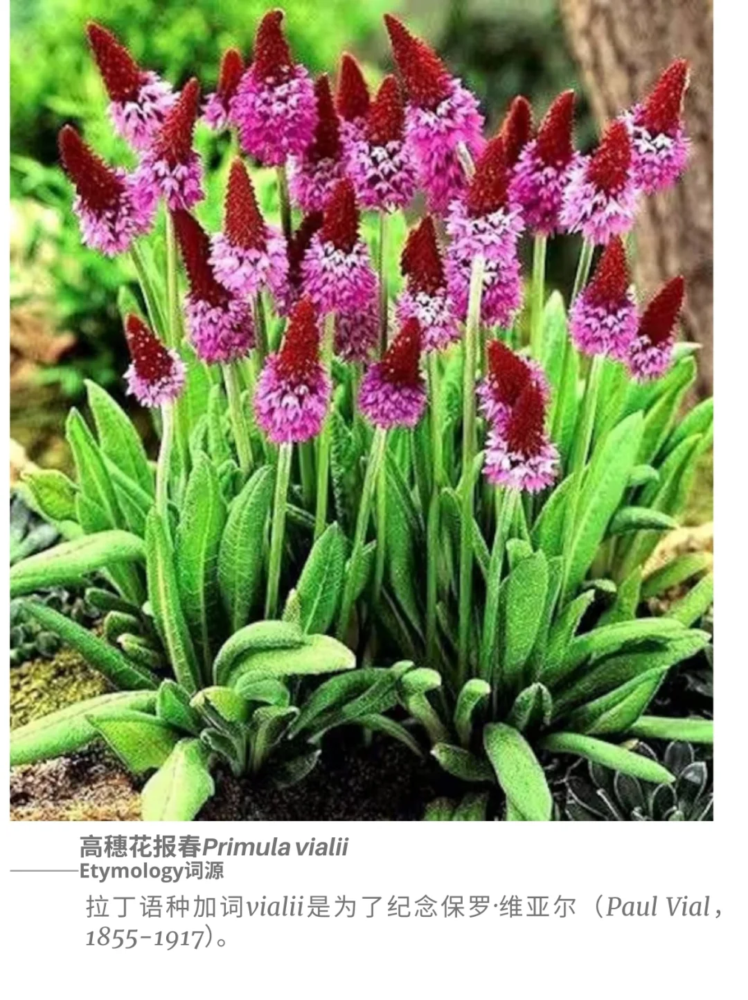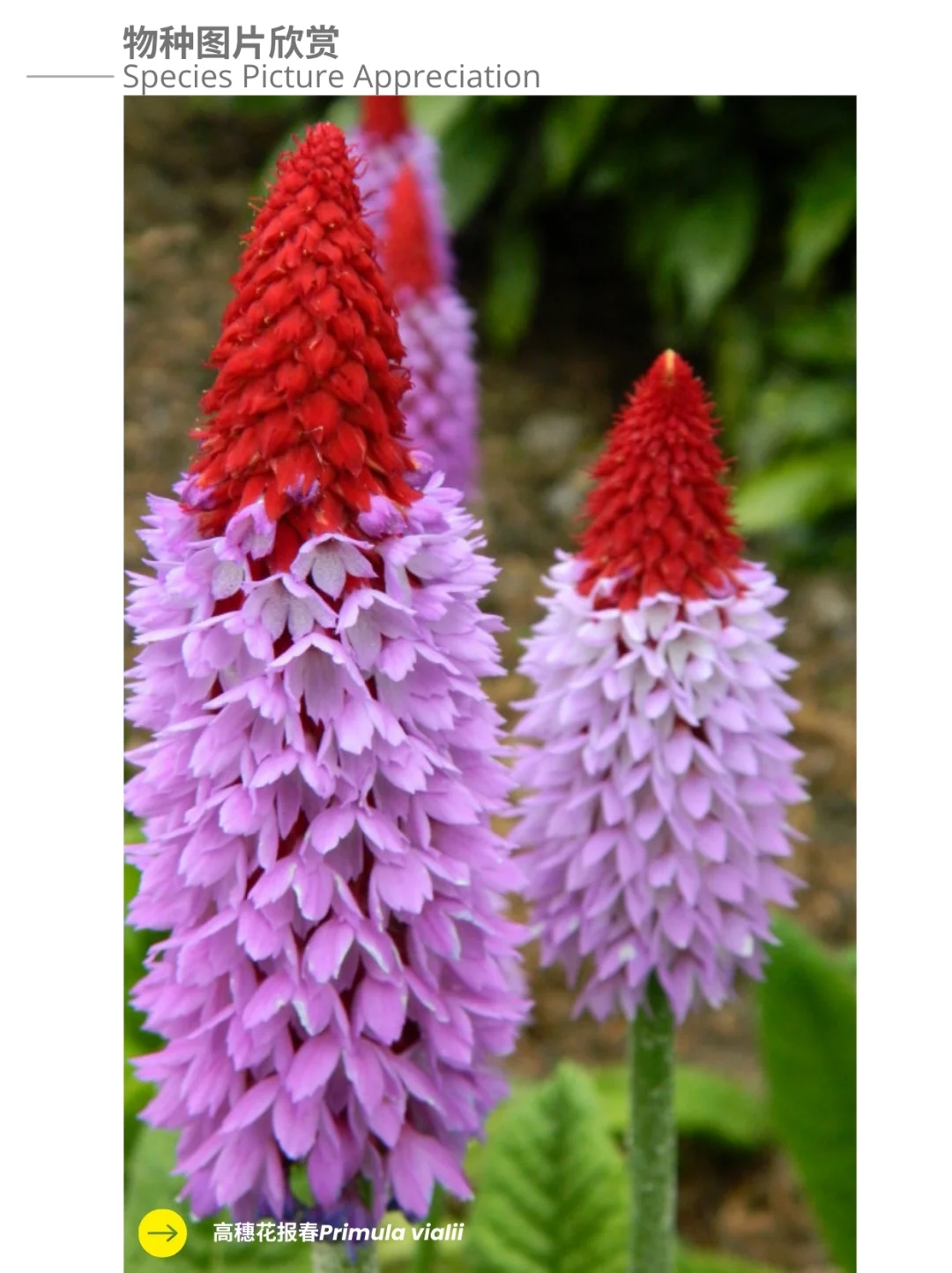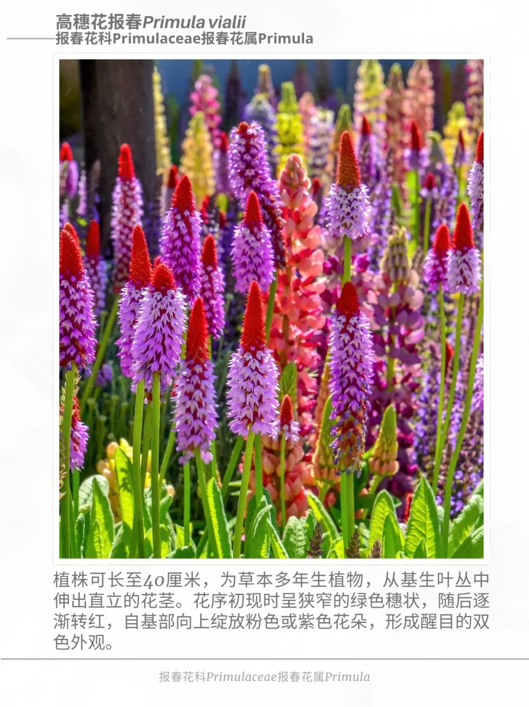 报春花科 报春花属 Primula vialii 维氏报春 四川省 云南省 多年生植物 英国皇家园艺学会 花园优异奖 Primula 报春花科植物高穗花报春Primula vialii,又称维氏报春,原产于中国西南部四川省西南部及云南省北部的高山谷地湿草甸或水域附近。