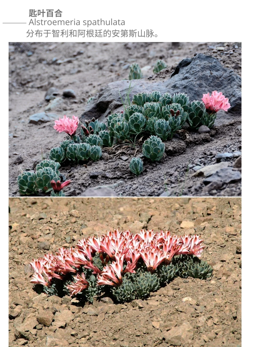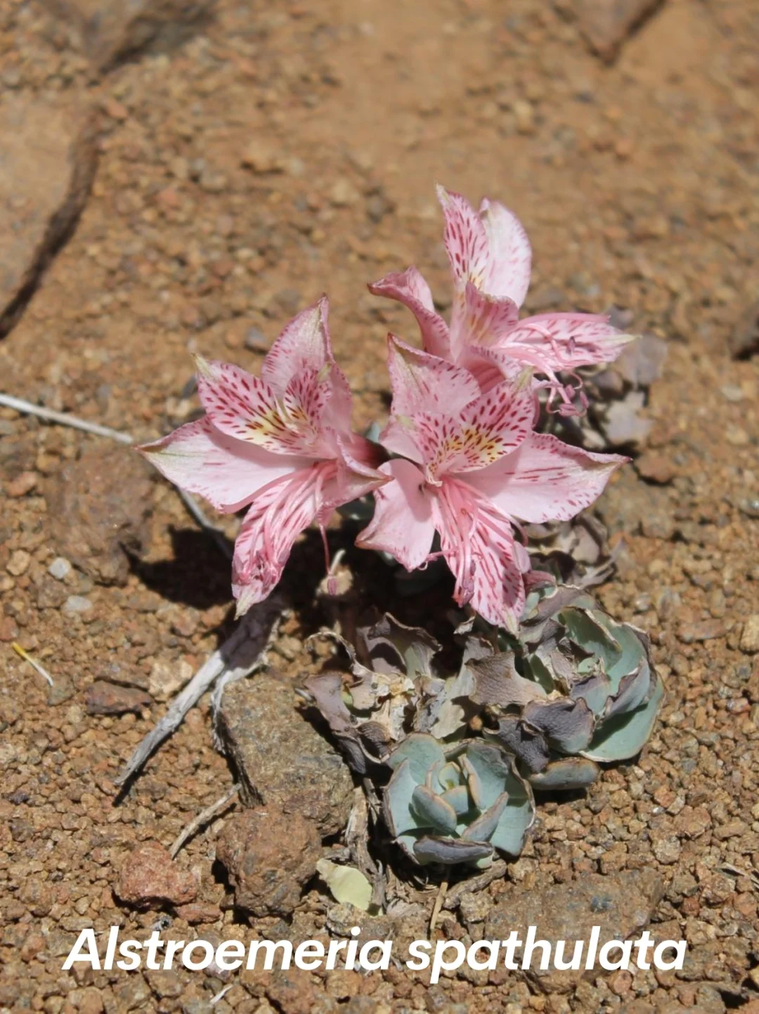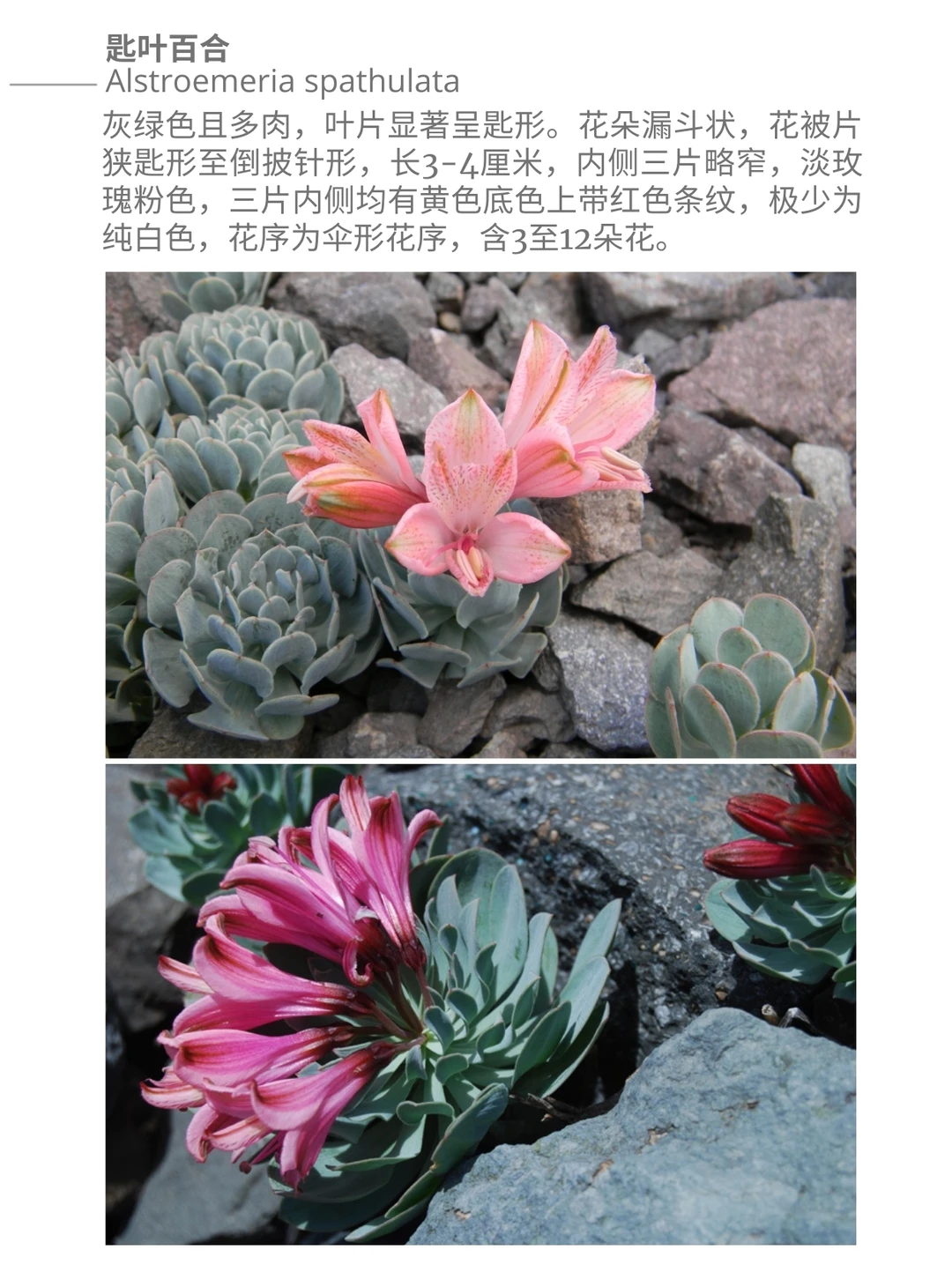 灰绿色且多肉,叶片显著呈匙形。花朵漏斗状,花被片狭匙形至倒披针形,长3-4厘米,内侧三片略窄,淡玫瑰粉色,三片内侧均有黄色底色上带红色条纹,极少为纯白色,花序为伞形花序,含3至12朵花。分布于智利和阿根廷,生长于中央山脉的碎石坡地,海拔1500-3300米。A. spathulata的无性枝条形成特征性的肉质灰绿色莲座状叶丛,与景天属植物相似。在温室栽培条件下,该植物极易出现异常伸长,枝条软弱下垂并沿地面蔓延,且不開花。另一方面,该植物在苏格兰东部一个避风的斜坡上,完全露天且无任何保护措施的情况下,仍能完美生长并开花。