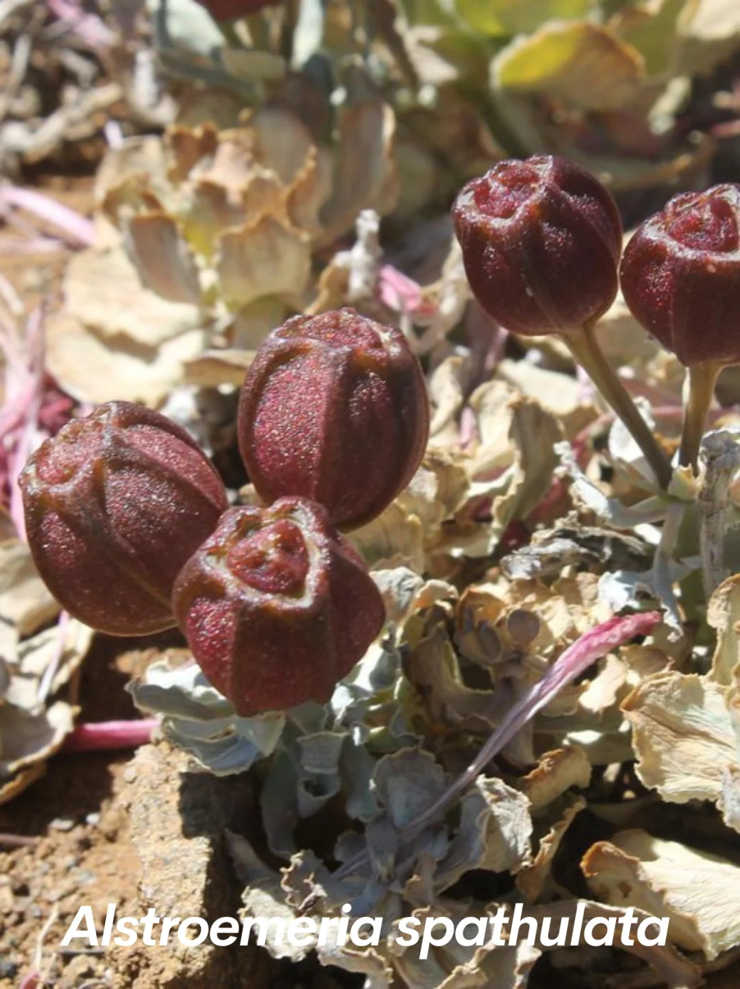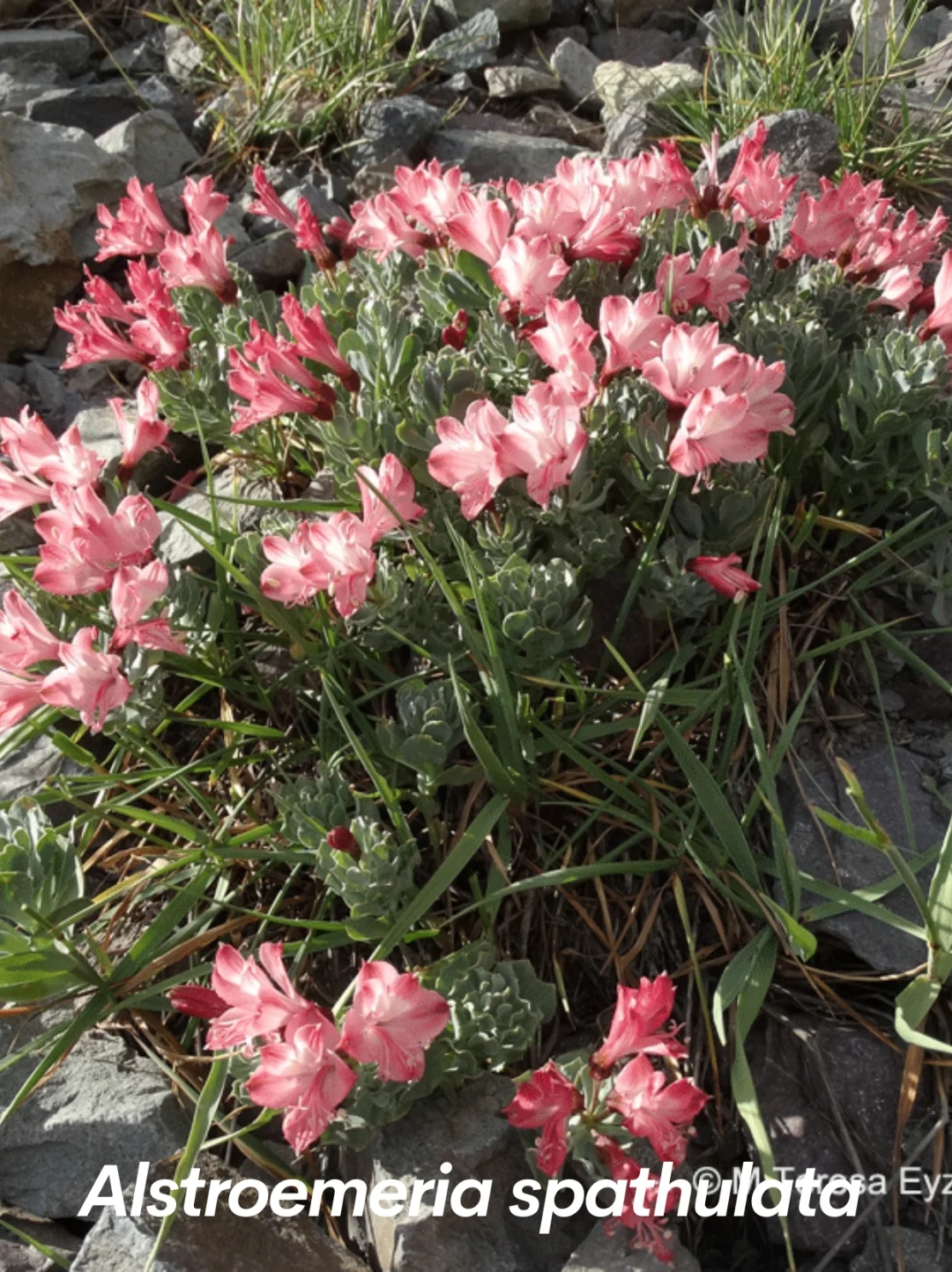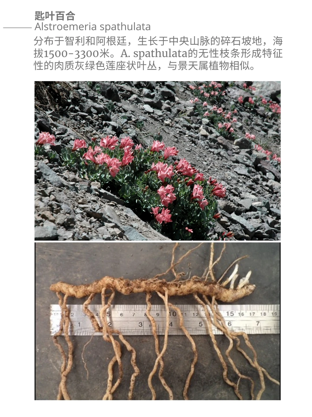 灰绿色且多肉,叶片显著呈匙形。花朵漏斗状,花被片狭匙形至倒披针形,长3-4厘米,内侧三片略窄,淡玫瑰粉色,三片内侧均有黄色底色上带红色条纹,极少为纯白色,花序为伞形花序,含3至12朵花。分布于智利和阿根廷,生长于中央山脉的碎石坡地,海拔1500-3300米。A. spathulata的无性枝条形成特征性的肉质灰绿色莲座状叶丛,与景天属植物相似。在温室栽培条件下,该植物极易出现异常伸长,枝条软弱下垂并沿地面蔓延,且不開花。另一方面,该植物在苏格兰东部一个避风的斜坡上,完全露天且无任何保护措施的情况下,仍能完美生长并开花。