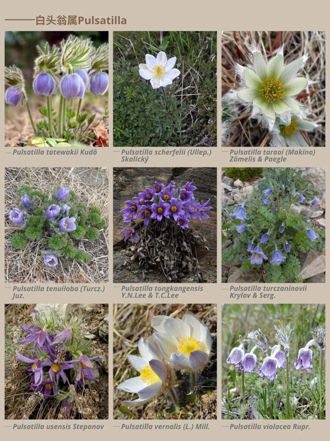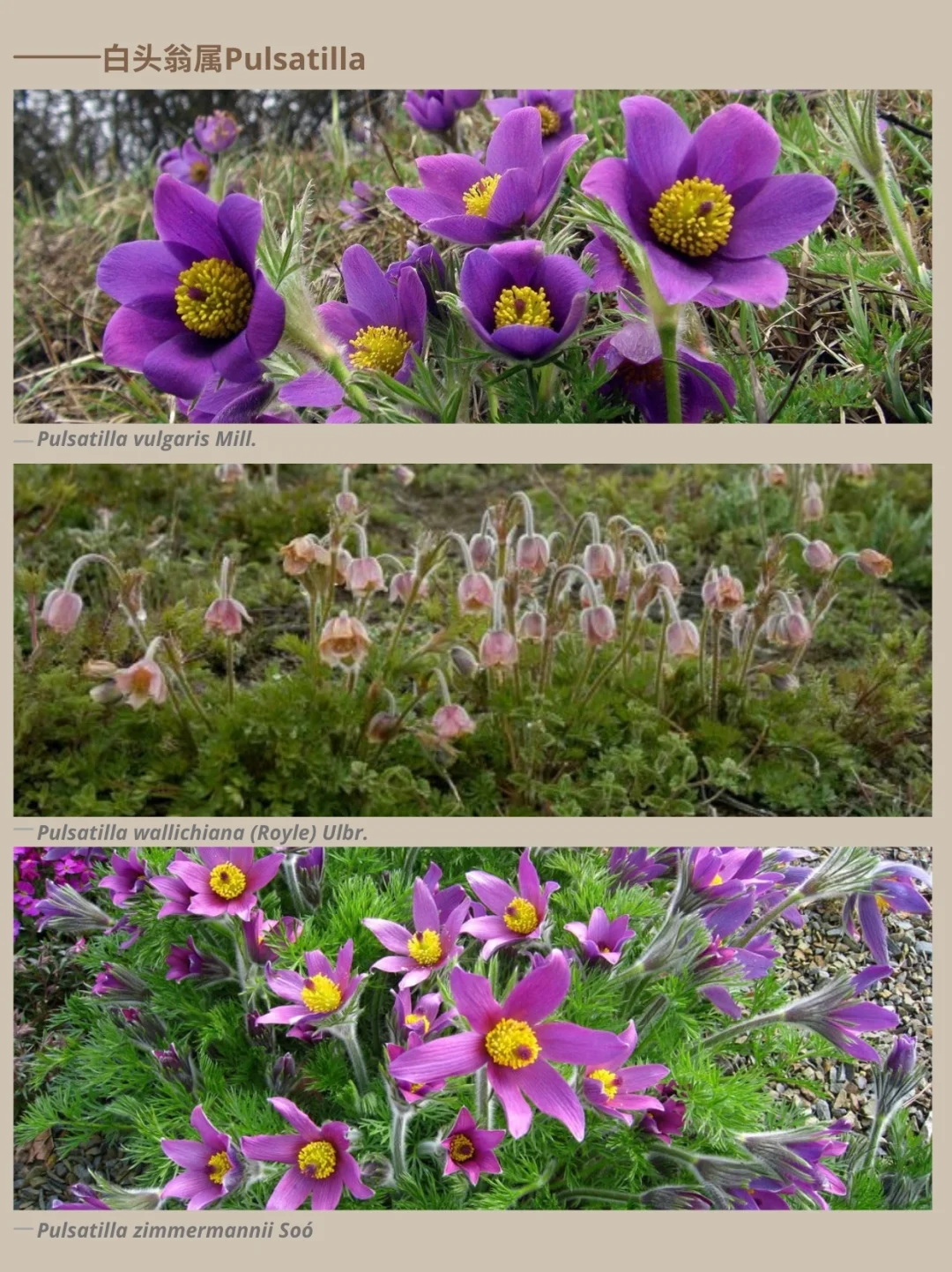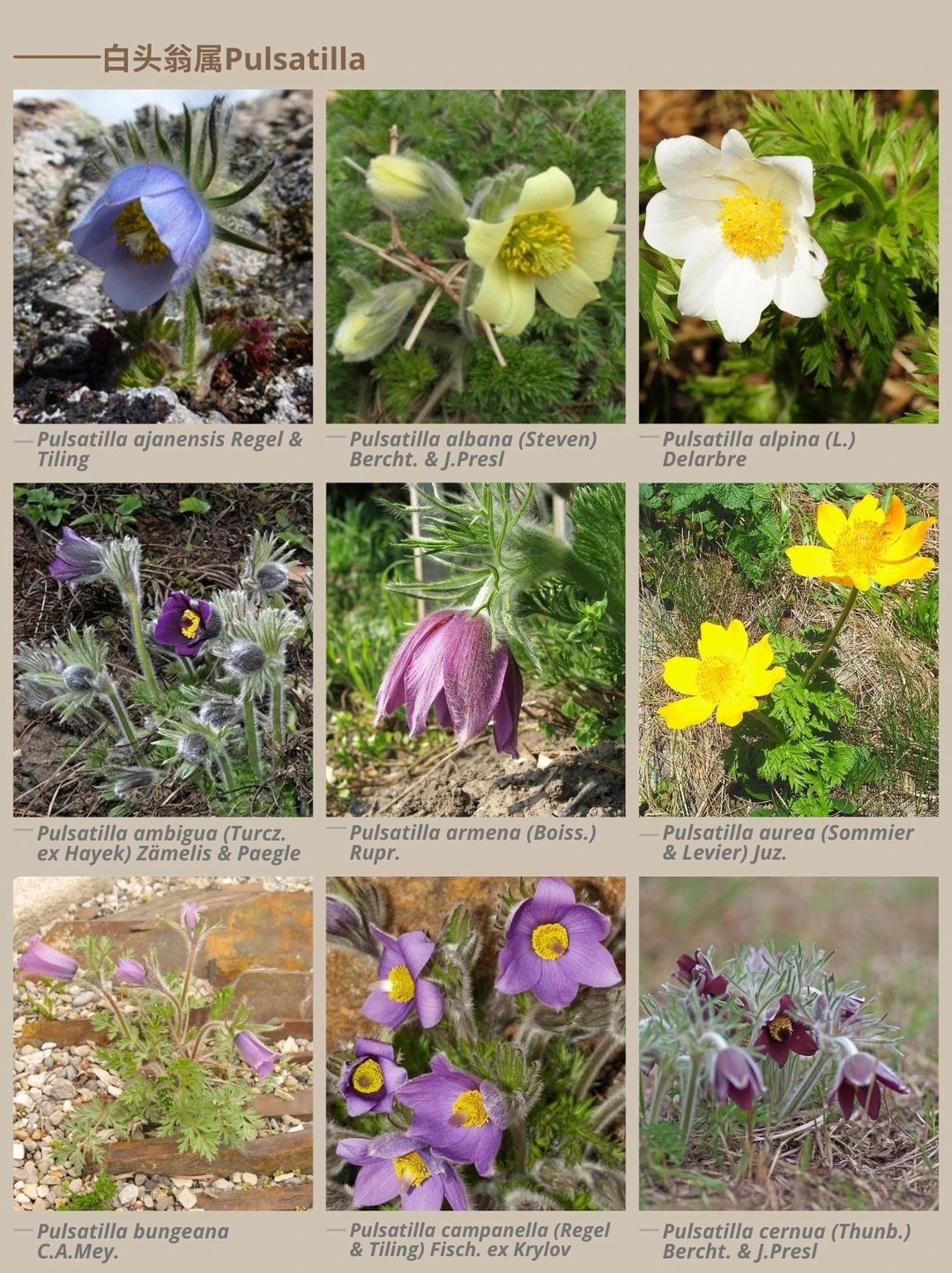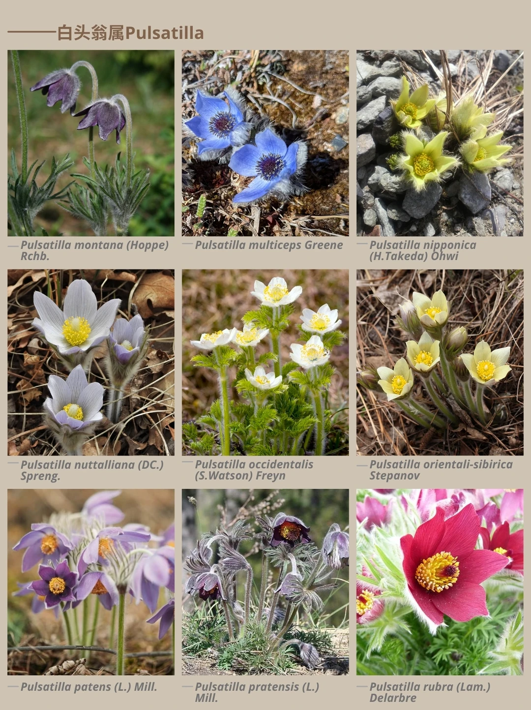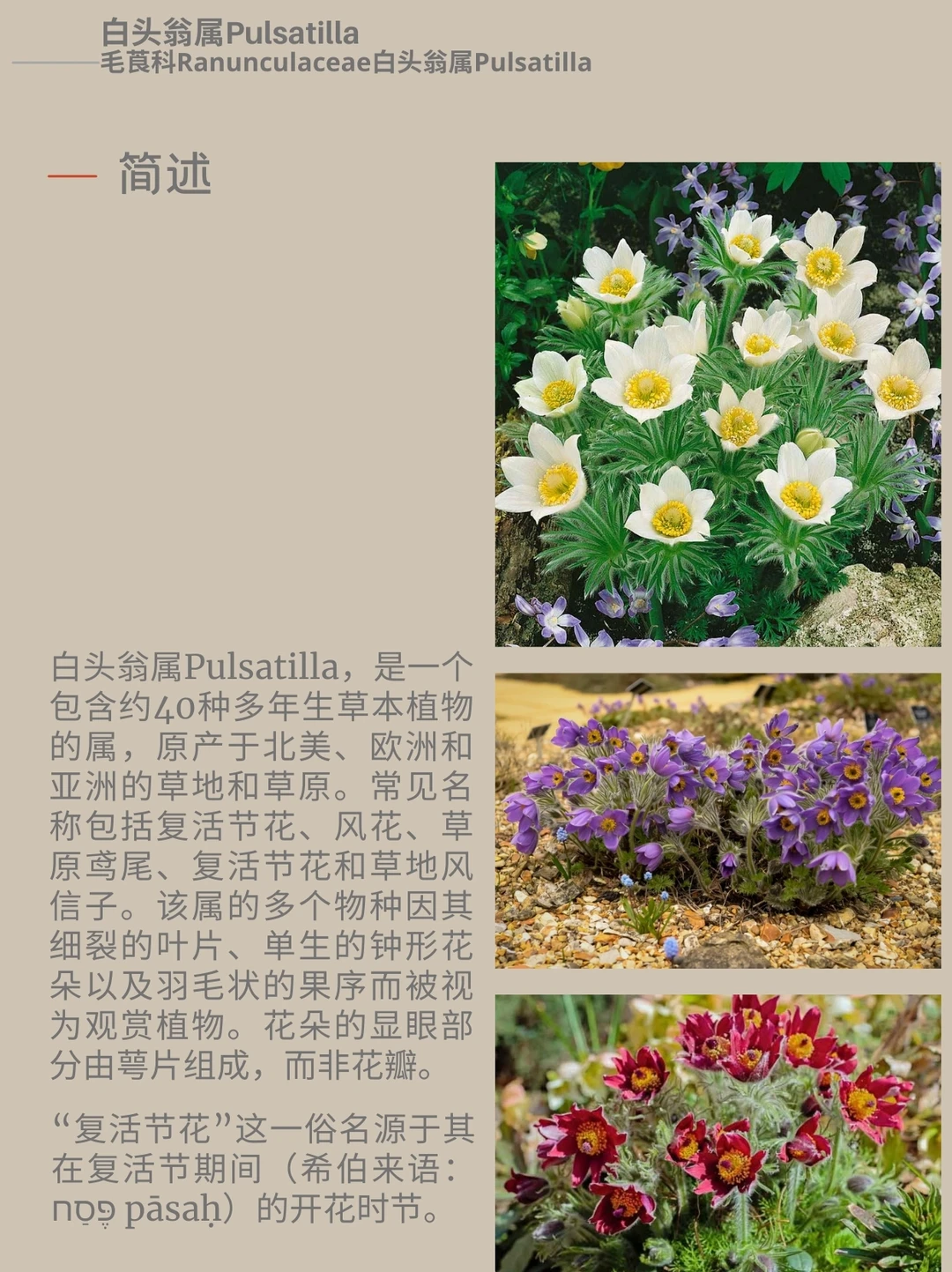 山野草 毛茛科 白头翁属 Pulsatilla 多年生草本植物 花园植物 盆栽 白头翁属Pulsatilla,是一个包含约40种多年生草本植物的属,原产于北美、欧洲和亚洲的草地和草原。常见名称包括复活节花、风花、草原鸢尾、复活节花和草地风信子。该属的多个物种因其细裂的叶片、单生的钟形花朵以及羽毛状的果序而被视为观赏植物。花朵的显眼部分由萼片组成,而非花瓣。“复活节花”这一俗名源于其在复活节期间(希伯来语:פֶּסַח pāsaḥ)的开花时节。