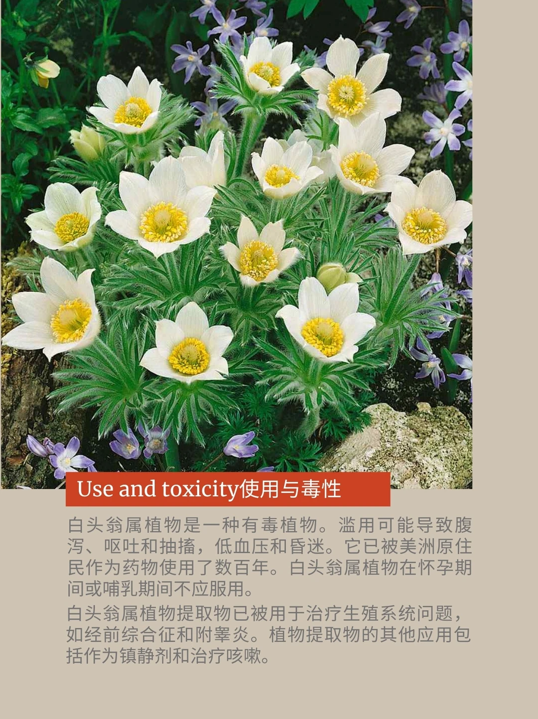 白头翁属植物是一种有毒植物。滥用可能导致腹泻、呕吐和抽搐,低血压和昏迷。它已被美洲原住民作为药物使用了数百年。白头翁属植物在怀孕期间或哺乳期间不应服用。