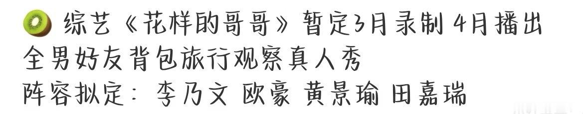 🥝 综艺《花样的哥哥》暂定3月录制 4月播出全男好友背包旅行观察真人秀阵容拟定:李乃文 欧豪 黄景瑜 田嘉瑞