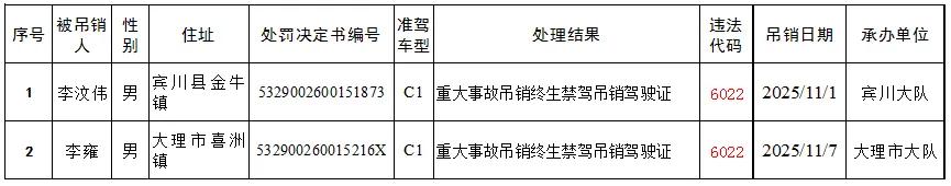 📸违法曝光︱11月大理2人被终身禁驾 2025年11月,大理州公安局交通管理支队对因醉酒驾驶、再次饮酒驾驶机动车、驾驶报废机动车、发生交通事故构成犯罪等违法被终身禁驾吊销驾驶证的2名驾驶人进行曝光,请广大驾驶人引以为戒,守法安全驾驶。 大理交警提示:守法出行,莫存侥幸。机动车驾驶证被吊销、“失驾”后仍驾驶机动车属于严重违法行为,将面临拘留、罚款处罚。请严格遵守道路交通法律法规,安全文明出行。