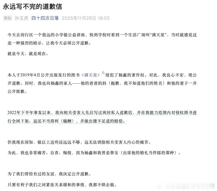 作家抄袭陈伯吹国际儿童文学奖的终审评委、上海九久读书人的副总编辑、全国优秀儿童文学奖得主孙玉虎,2018年抄袭病重好友杨鑫的作品,出版后事发。具体怎么被杨鑫发现的,没有交代。但明显抄袭早在3年前就暴露了。孙玉虎的私人道歉,始于2022年“事发”之后。也就是说,从2019年书出版,到2022年东窗事发,这位“好友”享受着版税和声誉,而病床上的杨鑫对此一无所知。2022年抄袭事发,但2025年11月孙玉虎才公开道歉。这是抄袭,也是对信任的凌迟。反抄袭