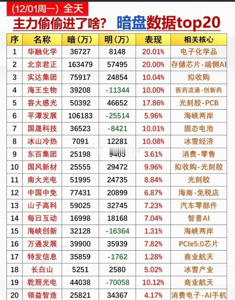 12.1大A明暗盘数据Top20梳理分析!这是当日主力资金“暗盘+明盘”的动向清单,暗盘代表主力隐蔽资金布局,明盘是公开盘面资金。1. 华融化学:暗盘36727万、明盘8148万,涨20.01%,题材电子化学品。暗盘+明盘资金同步加仓,电子化学品赛道获主力重点布局,当日直接拉涨20%,是当日高弹性标的之一。2. 北京君正:暗盘163479万、明盘57495万,涨20%,题材存储芯片-端侧AI。作为存储+端侧AI核心标的,暗盘巨量流入配合明盘资金,直接20%涨停,是科技赛道资金+人气双热标的。3. 实达集团:暗盘75917万、明盘24854万,涨10.04%,题材拟收购。叠加拟收购智算中心的热点,暗盘明盘资金同步流入,当日收涨停,资金对其资本运作+题材的认可度较高。4. 海王生物:暗盘39208万、明盘-11344万,涨10%,题材医药流通-创新药。暗盘流入但明盘流出,仍涨停,属于医药赛道的短期资金脉冲,明盘已有部分资金兑现收益。5. 容大感光:暗盘50392万、明盘46652万,涨17.86%,题材光刻胶-PCB。光刻胶+PCB双题材加持,暗盘明盘资金均大幅流入,涨幅接近20%,是半导体材料赛道核心标的。6. 平潭发展:暗盘106183万、明盘-25514万,涨5.96%,题材海峡两岸。暗盘巨量布局但明盘资金流出,海峡两岸题材下收涨,资金呈现“暗进明出”的分歧态势。7. 国晟科技:暗盘36523万、明盘-8421万,涨10.01%,题材固态电池。固态电池赛道标的,暗盘流入但明盘流出,仍收涨停,属于赛道热度下的资金短期推动,明盘有兑现动作。8. 冰山冷热:暗盘7091万、明盘12281万,涨10.08%,题材冰雪经济。冰雪经济题材,明盘资金流入更明显,当日涨停,是冰雪产业方向的资金聚焦标的,事件驱动属性较强。9. 东百集团:暗盘25198万、明盘9465万,涨3.61%,题材消费-零售。消费零售标的,暗盘明盘均流入但涨幅有限,属于消费赛道的温和资金布局,热度相对一般。10. 国风新材:暗盘25555万、明盘29472万,涨9.96%,题材拟收购-光刻胶。拟收购光学保护膜+光刻胶题材,暗盘明盘资金同步流入,接近涨停,是半导体材料+资本运作的热门标的。11. 南大光电:暗盘51995万、明盘24735万,涨8.84%,题材光刻胶。光刻胶核心标的,暗盘明盘资金持续流入,涨幅近9%,是半导体材料赛道的资金重点布局标的之一。12. 中国中免:暗盘77431万、明盘20899万,涨6.87%,题材海南-免税店。海南免税龙头,暗盘巨量流入+明盘配合,收涨近7%,是消费升级赛道的大票资金布局标的。13. 山子高科:暗盘59025万、明盘32745万,涨7.23%,题材汽车零部件。汽车零部件标的,暗盘明盘资金均流入,涨幅超7%,属于汽车产业链的阶段性资金布局。14. 每日互动:暗盘16998万、明盘18168万,涨7.04%,题材智普AI。智普AI关联标的,暗盘明盘资金同步流入,涨7%左右,是AI应用赛道的关注标的之一。15. 海峡创新:暗盘32128万、明盘-16364万,涨1.31%,题材海峡两岸。同属海峡两岸题材,暗盘流入但明盘大幅流出,仅微涨,资金分歧较大,热度弱于平潭发展。16. 万通发展:暗盘39900万、明盘35939万,涨7.82%,题材PCIe5.0芯片。PCIe5.0芯片标的,暗盘明盘资金均流入,涨近8%,是半导体硬件赛道的资金布局标的。17. 特发信息:暗盘35859万、明盘-1762万,涨1.28%,题材商业航天。商业航天标的,暗盘流入但明盘小幅流出,仅微涨,资金对其短期布局的认可度一般。18. 长白山:暗盘5251万、明盘2580万,涨5.02%,题材冰雪产业。冰雪产业辅助标的,暗盘明盘资金均流入,涨5%左右,是冰雪经济赛道的补充人气标的。19. 乾照光电:暗盘44038万、明盘-70058万,涨10.12%,题材商业航天。商业航天标的,暗盘流入但明盘大幅流出,仍收涨停,属于赛道热度下的资金博弈,明盘兑现力度较大。20. 领益智造:暗盘25821万、明盘34367万,涨4.17%,题材消费电子-AI手机。消费电子+AI手机标的,暗盘明盘资金均流入,涨4%左右,是AI终端硬件链的温和布局标的。