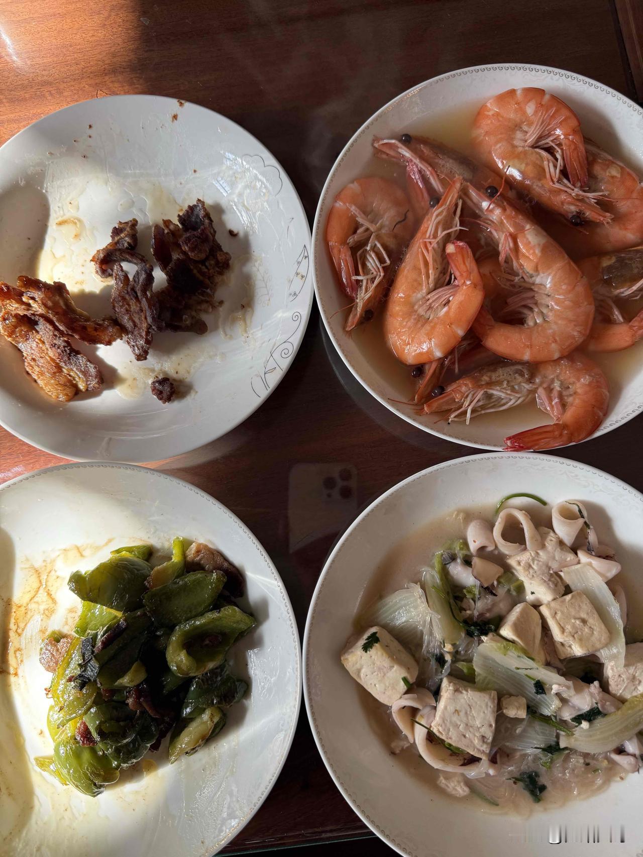 冬日三餐打卡我昨周一给自己放假一天哪里也没有去,在家里修吊灯拆开了一看是贴片线路板,这个需要特殊工具才能修好,我只有电铬铁等解决不了问题的,11点了夫人买回来了地瓜1元一斤、芋头2.5元一斤、活的大虾50元两斤,我也不干啥了洗手做饭了,先洗虾杷线取出来一跳还把我吓一跳,洗好了赶紧下锅里清水煮虾结果还跳出来一只,这次做虾就放一点点盐其他调料都不放原汁原味的出锅即好上桌了,在热剩菜青椒炒肉,豆腐炖笔管鱼,炸五花肉直接上桌好了开饭了,元葱花生米一样也不能少,小酒一杯都有了开始,这就是生活。原创。