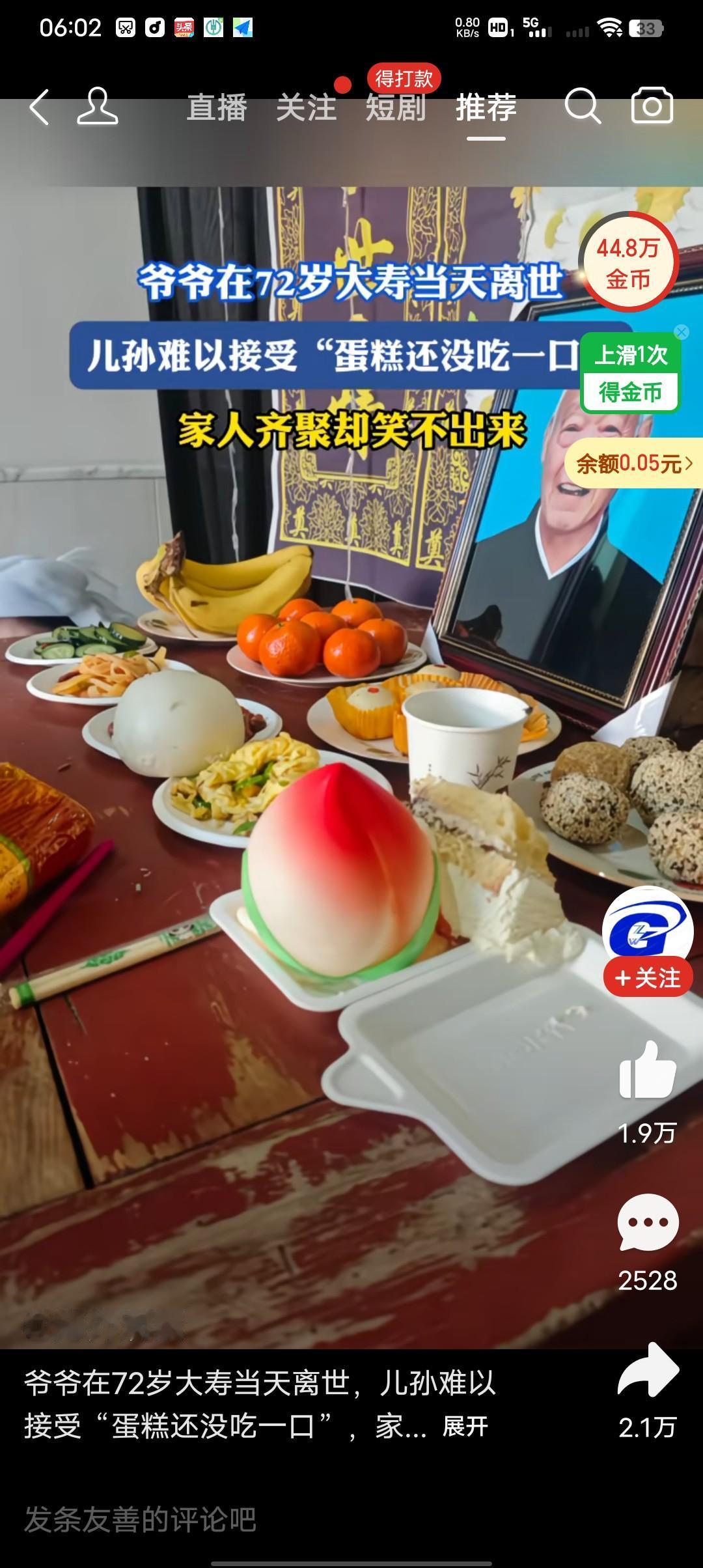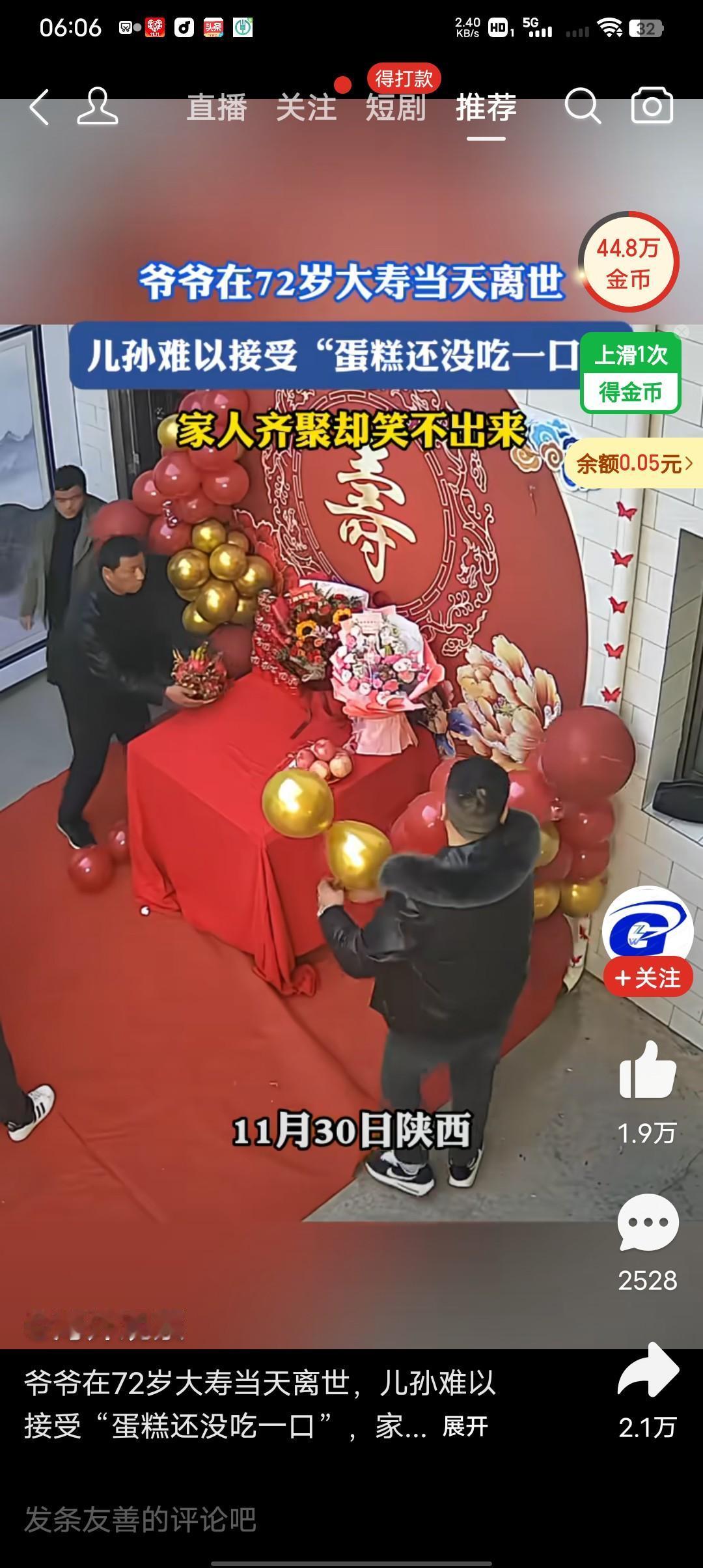 我觉得老人就不该大操大办过生日! 网友的爷爷在72岁生日当天去世,儿孙们用心布置的寿堂还挂着红绸,可转眼间就成了爷爷的灵堂,红绸转瞬间换成了白绸。 爷爷一口蛋糕都还没吃,子孙后辈给爷爷准备的礼物爷爷还没看一眼,这是所有孙辈们盼了好久的聚一聚,这次所有人脸上却没了笑意。 有网友说,老人过了70岁就安安静静的,别过什么生日,寿命寿命,过寿就会把寿命过没了,咋滴,你怕阎王爷忘了你多大年龄了?好多子孙辈都是为了自己那点可怜的自尊心。就是为了别人口中的那句,你看谁谁家的孩子给老人办的生日真排场,人家孩子真孝顺,这老家伙有福气啊,有这样孝顺的孩子! 其实人老了就喜欢安安静静的,不喜欢热闹,本来人老了精力就不够用,还要在那么多人面前装着很高兴的样子,有好多老人都是死在自己的宴会生日宴会上。 平时多陪陪老人就很好,别弄一个孝顺的人设呢,还要消费老人的好人设,放过老人吧,安安静静的对老人好,让老人按着自己的心意活多陪陪老人,尽量少违背老人的意思,愿所有的老人能安安静静的过好余生!