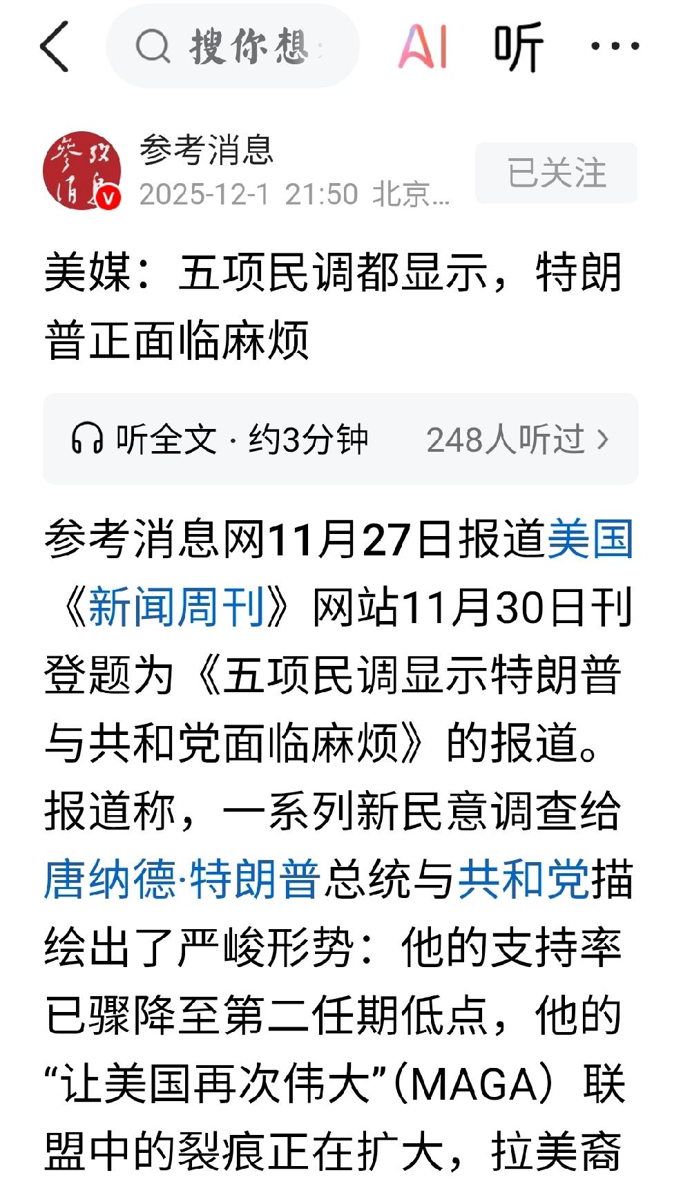 此刻美国民意,抛弃了谁? 个人观点:美国民意的转向,代表着什么? 首先,美国民意因为近期美国总统特朗普关于移民政策的三个决定产生了骤然的变化。 这种变化正在向着美国总统特朗普不愿意看到的方向发展,非常不利于特朗普。 个人认为,特朗普的思想逻辑认为:再拿钱买回来,这些摇摆的民意。感恩节飞机上的合照,告诉了全球民众,世界上最大强权代理人与世界上最有钱的人,正在一起过感恩节,吃大餐。 所以此刻美国民心的变化,代表着特朗普更加强势和未来严厉的对待非白人措施。 同时,这也意味着当前美国领导层要把注意力不再放在国际事务中,重点放在国内。 可以说,非常高兴的看到加勒比海高压态势—委内瑞拉,暂时得到缓解。至于微不足道的日本,妄想拉美国参战,一起开战中国,短时间内是不可能。 这就是美媒民调带给个人的思考。