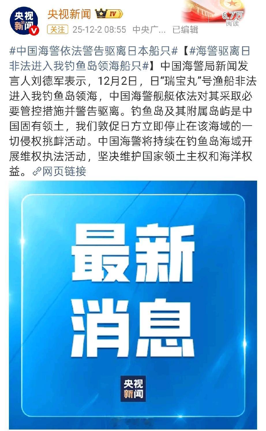 今天,12月2日,日本渔船又跑到钓鱼岛领海来“找事”,直接被我们海警依法警告驱离了。 钓鱼岛是咱们中国的地盘,这是板上钉钉的事,哪能容别人随便闯?咱海警守在这儿,就是给咱老百姓看住家门,谁也别想在咱的地盘上撒野! 钓鱼岛不是日本的“后花园”,中国主权,寸土不让! 中国海警依法警告驱离日本船只