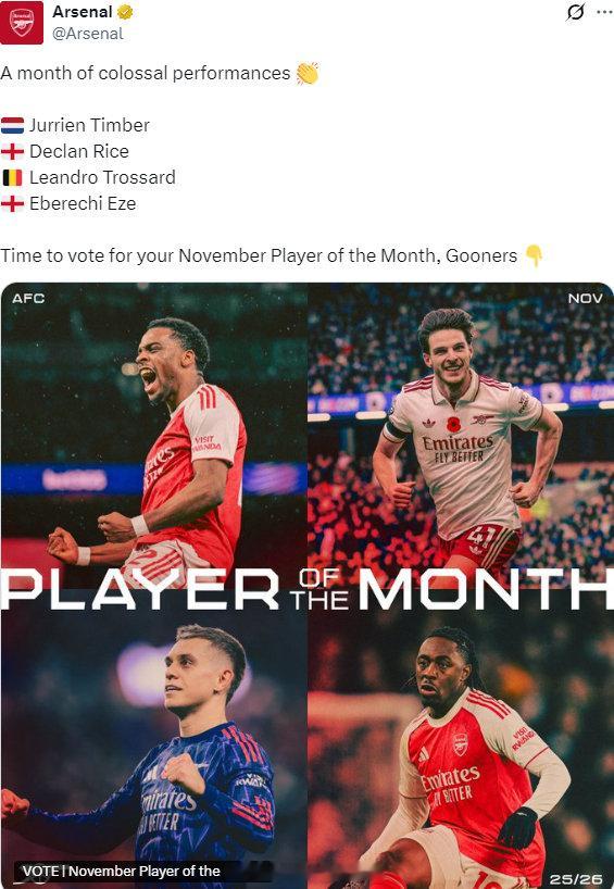 枪迷们,是时候投票选出你们心目中的十一月最佳球员了! 金秋观赛季 阿森纳著名教授