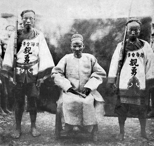 1884-1885年清法战争期间,台湾台南地方武装领袖陈辉煌与他的“亲勇”队伍的合影,照片中间就坐者为陈辉煌,两侧队员配备的火枪、刀具,是当时民间抗法力量的典型装备。 清法战争期间,法军重点进攻台湾北部的基隆、淡水等地,试图侵占台湾。作为台南士绅的陈辉煌,主动组织亲勇北上支援基隆抗法作战——这类地方自发武装,与清军正规部队配合,共同构成了台湾军民抵御法军的防线,是当时台湾民众保家卫国意志的生动体现。