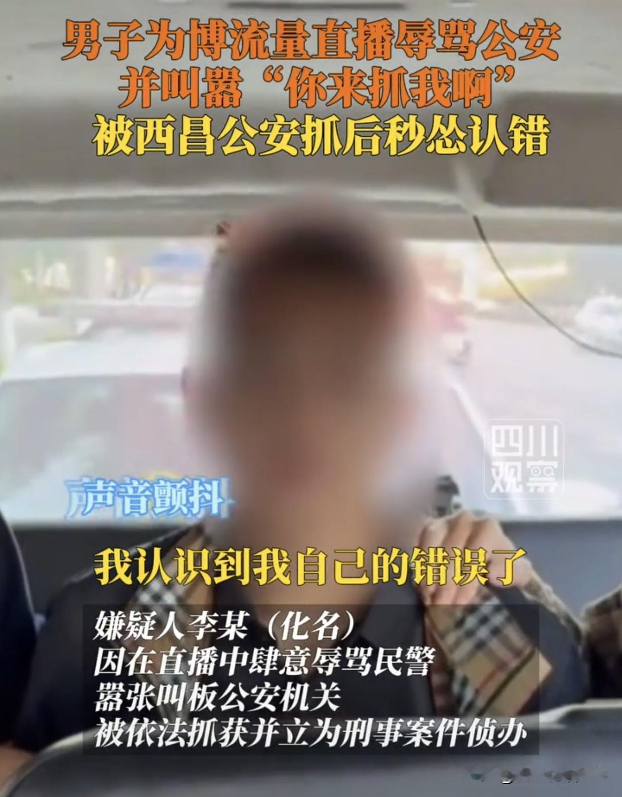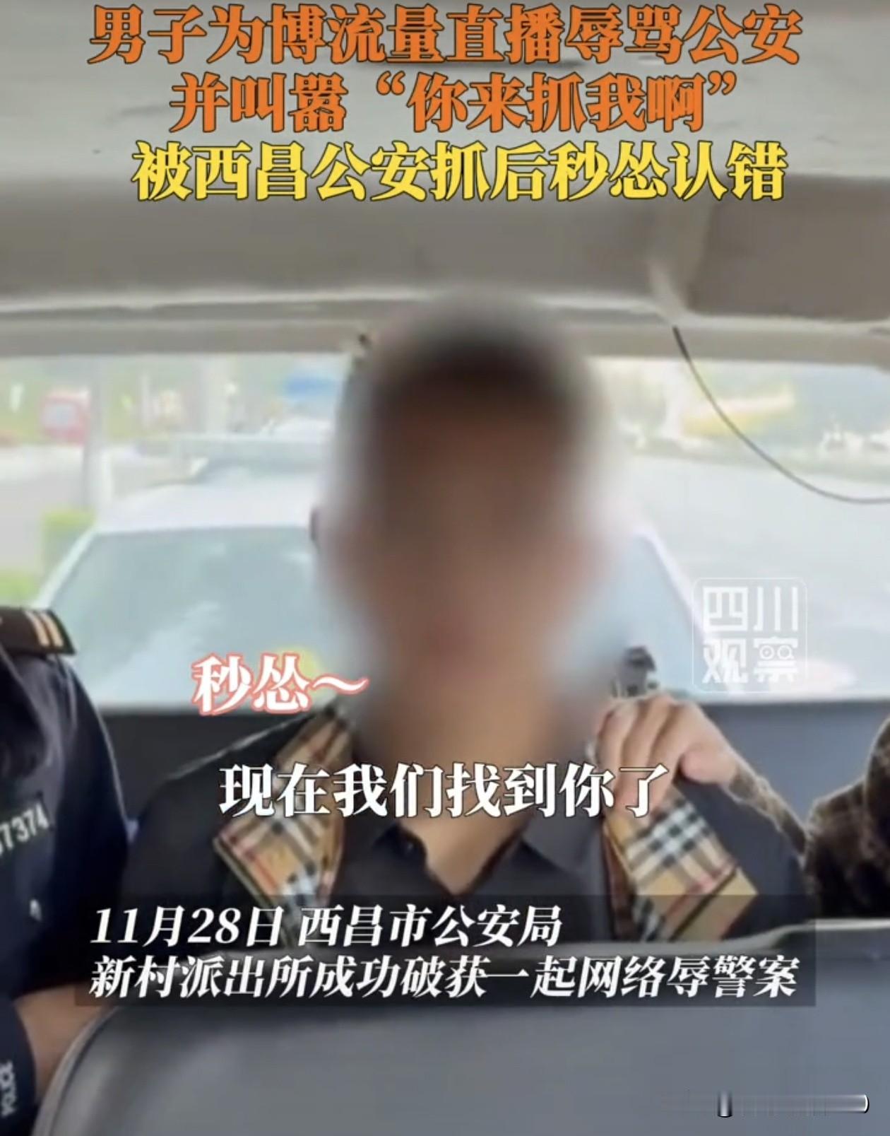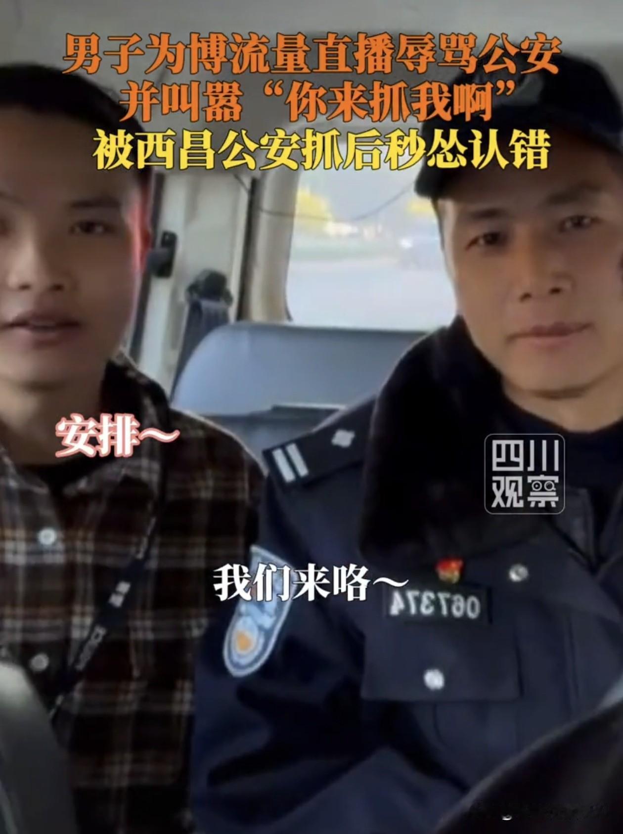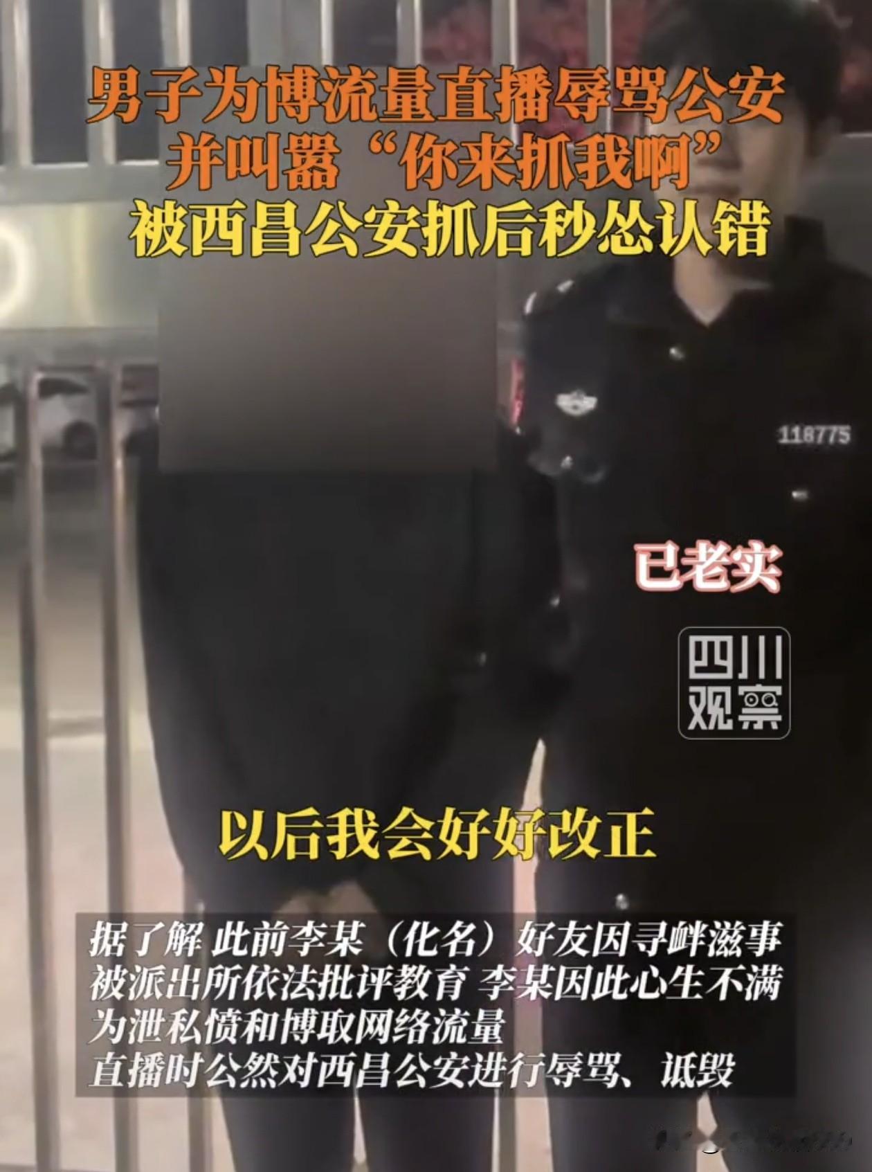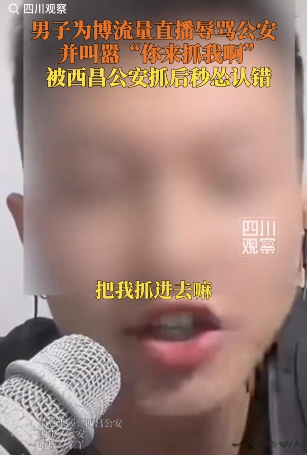 万万没想到!西昌,一男子为博流量直播辱骂公安,并叫嚣“西昌的派出所来抓我嘛,把我抓进去嘛,你们来嘛”。结果,他的愿望实现了,西昌的公安找到了他,并说:现在我们找到你了,你有啥子想说的不。 被抓后男子秒怂认错,声音颤抖的说,我认识到我自己的错误了,以后我会好好改正的。 不得不说,像男子这样的要求,我还是第一次在现实中见到。以前只是在电视中看到过,真的是电视来源于生活。有些人为了成为网红,为了博流量,真的是毫无底线。 有网友调侃,这个愿望实现的也太快了,比那些烧香拜佛的还快。 网络绝非法外之地!你怎么看待这种博流量的荒唐行为?