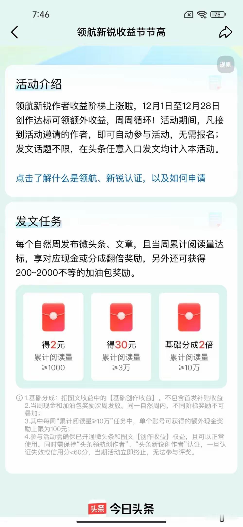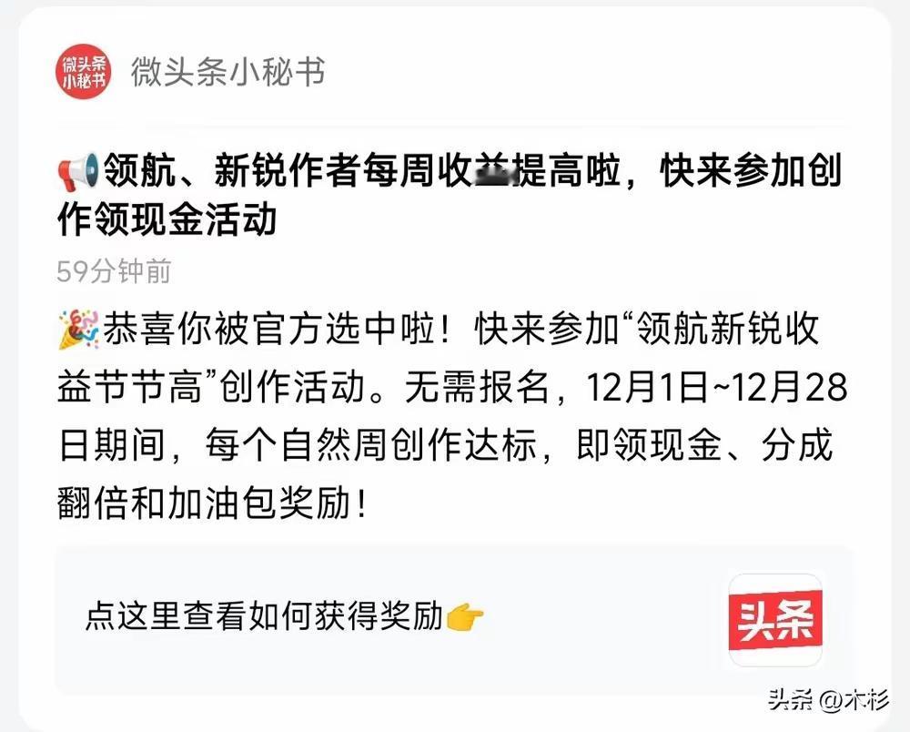 没收到这个涨薪通知呢,可能是这两天我的活跃度不够,所以被平台“抛弃”了吧[捂脸] 今天有好多条友收到了小秘书发的领航、新锐作者每周发文收益提高的创作奖励通知,我真的为他们高兴。这次创作阅读量要求虽然比以往有所提高,但只要在阶段内发文累计达到所要求的阅读量,奖励额也比以往提高了很多。 以往几次,我都参加了,而且也都领到了奖励。这次没收到,肯定与这段时间本人的活跃度有关。 我很理解平台的做法,你努力程度不够,总不能白养憨头郎儿。 努力吧,争取下一阶段能得到小秘书的垂爱!