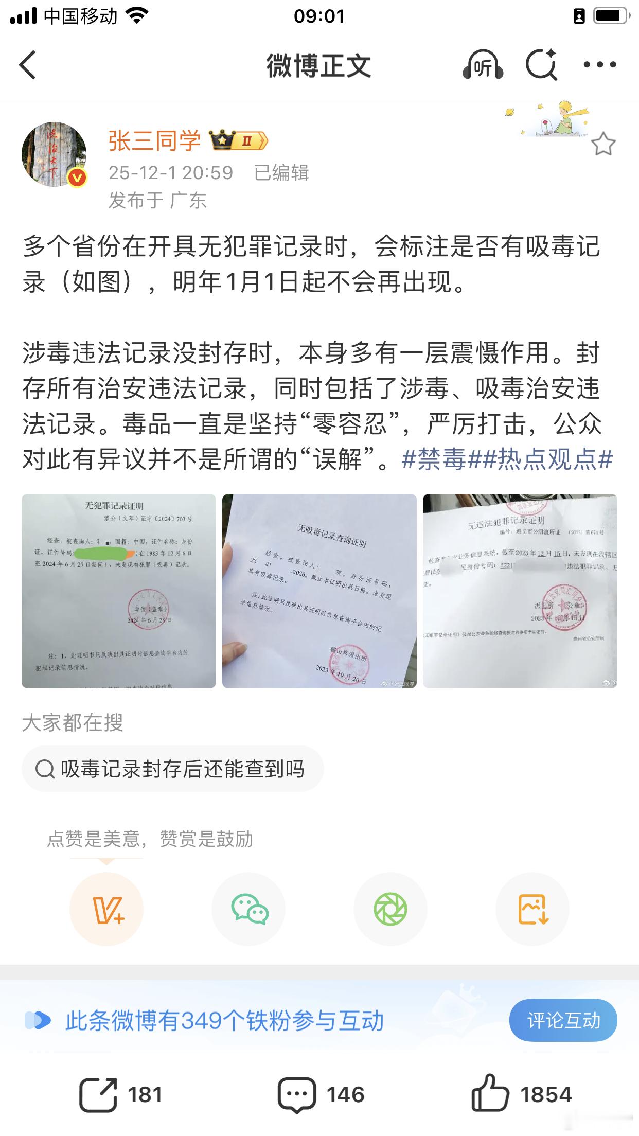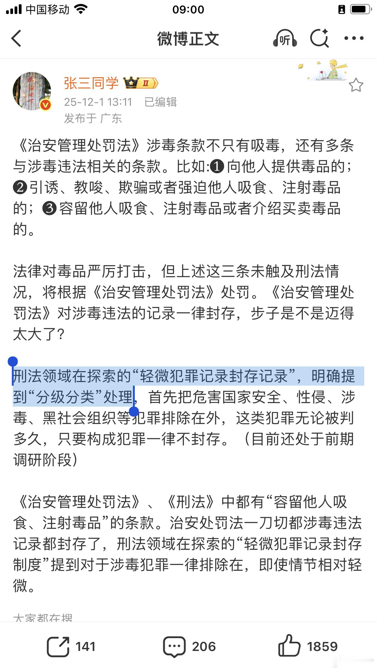张三同学:刑法领域在探索的“轻微犯罪记录封存记录”,明确提到“分级分类”处理;治安处罚法一刀切都涉毒违法记录都封存了。