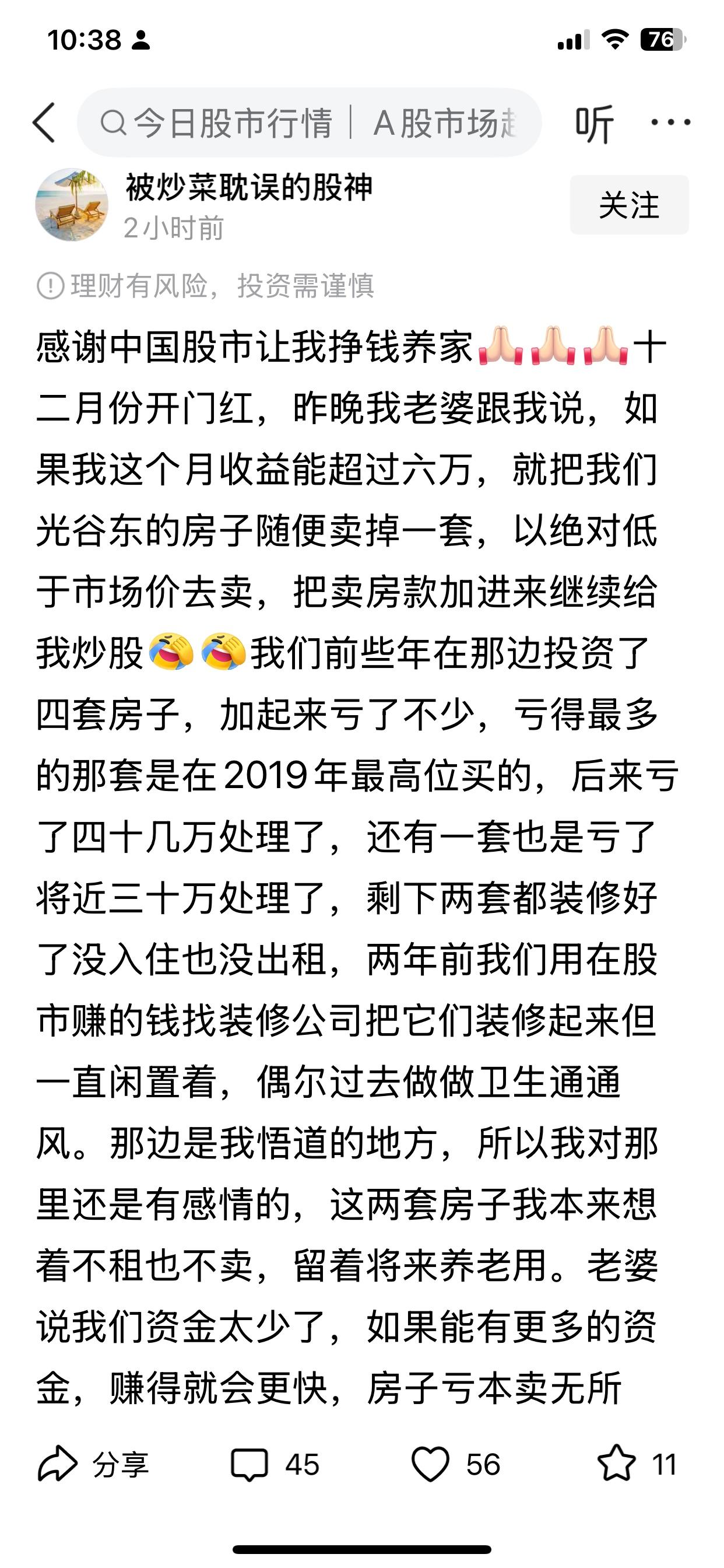 一直没有弄明白房价一直下跌的原因,今天看到一个帖子,明白了许多。当然也不是全部原因,但肯定是原因之一。这两年,股市行情启动,很多人没有现钱,就赶紧把房子卖了,用于炒股,而且这两年也确实赚了不少钱。其他人见到,也蠢蠢欲动,没有资金,便想到了卖房子。 如果是您,会把房子卖掉去炒股吗?