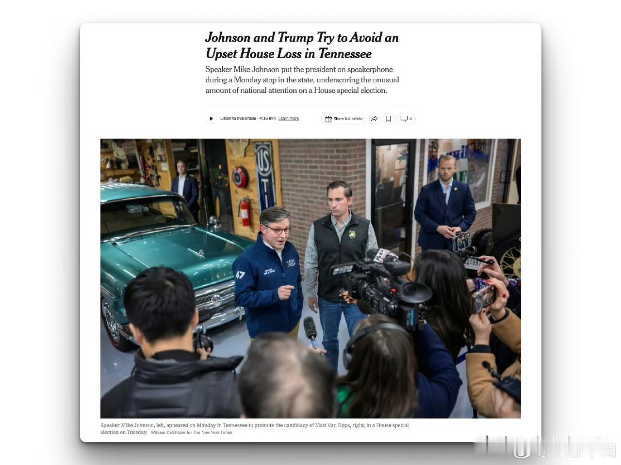 特朗普和约翰逊对一个深红选区的特别选举给予了高度关注。 周二,在田纳西州第七国会选区将举行特别选举。去年大选中,特朗普在这个选区拿到了超过20个点的领先优势。但目前民调显示,共和党候选人仅以微弱的优势领先民主党候选人,这让共和党感受到了压力。 周一,从华盛顿飞抵选区的众议院议长迈克·约翰逊致电特朗普,并打开了免提功能。特朗普在电话那头表示:“全世界都在关注田纳西州,也在关注你的选区,”这次选举“必须证明共和党比以往任何时候都更加强大”。
