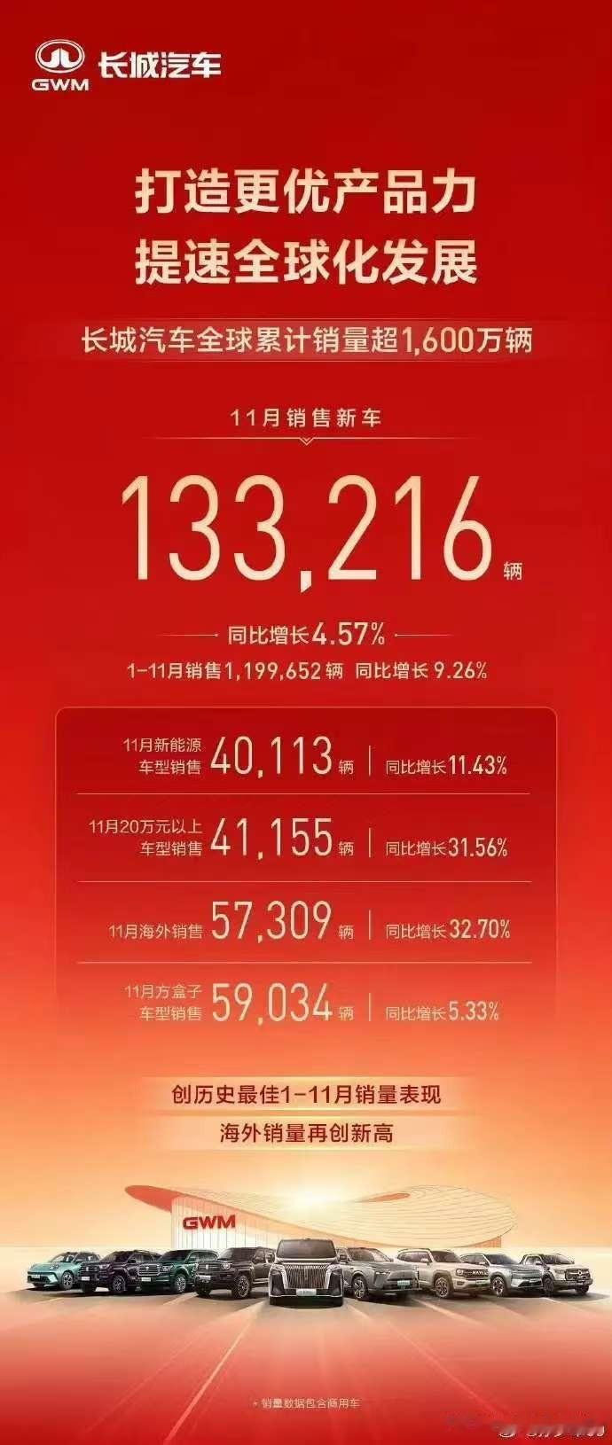 长安与长城也公布了11月销量数据。长安汽车总计售出283000辆(包含合资与商用车),值得欣喜的是,其出口量也达到了55000辆。而长城汽车上个月共售出133216辆,同比增长4.57%。原本的国产五虎——比亚迪、吉利、奇瑞、长安的销量都稳定在25万+,长城算是彻底掉队了。