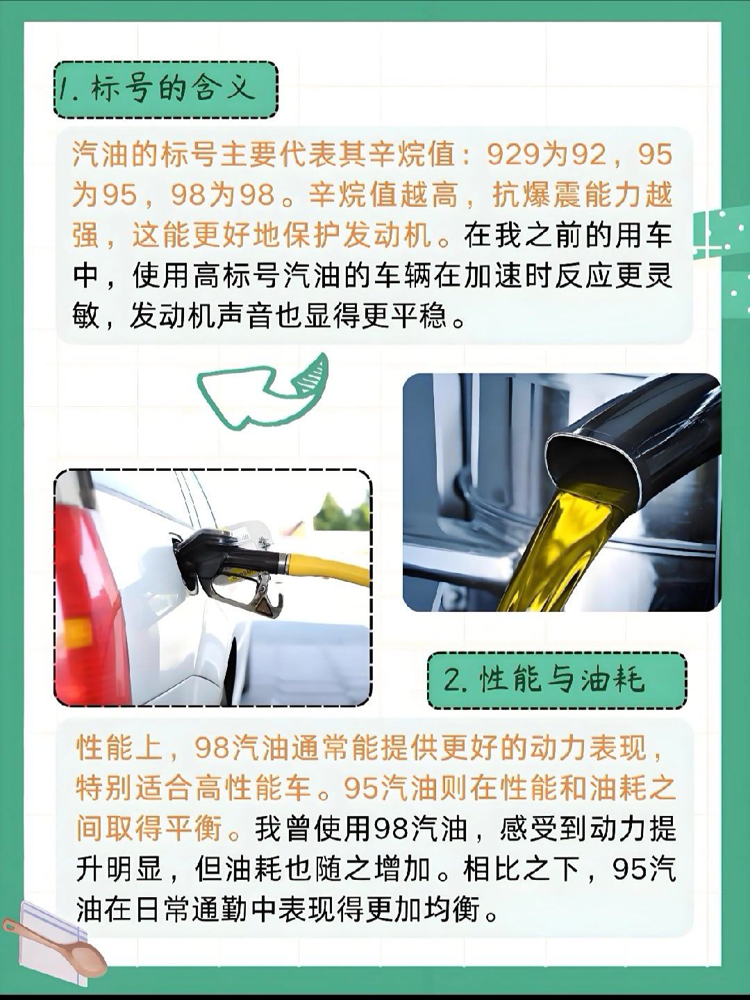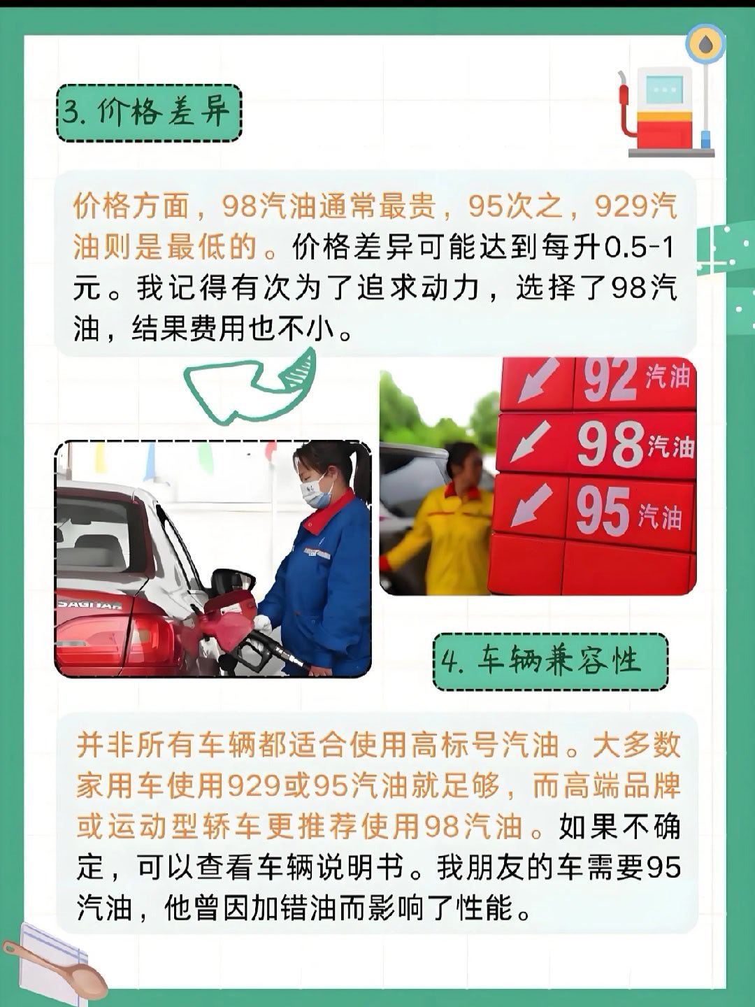 92/95/98号汽油怎么选?加错油=毁车+费钱🚗🔍 三种油的核心区别1️⃣ 92号汽油2️⃣ 95号汽油3️⃣ 98号汽油⚠️ 重点提醒!你的车该加什么油?具体如图👇🌟 小贴士1️⃣ 油价调整日:每月10/20号调价,涨价前加满!2️⃣ 加油枪跳枪后:别再硬加!会损坏碳罐3️⃣ 加油站优惠:周三/周五会员日直降0.5元/L我与汽车的日常大v聊车