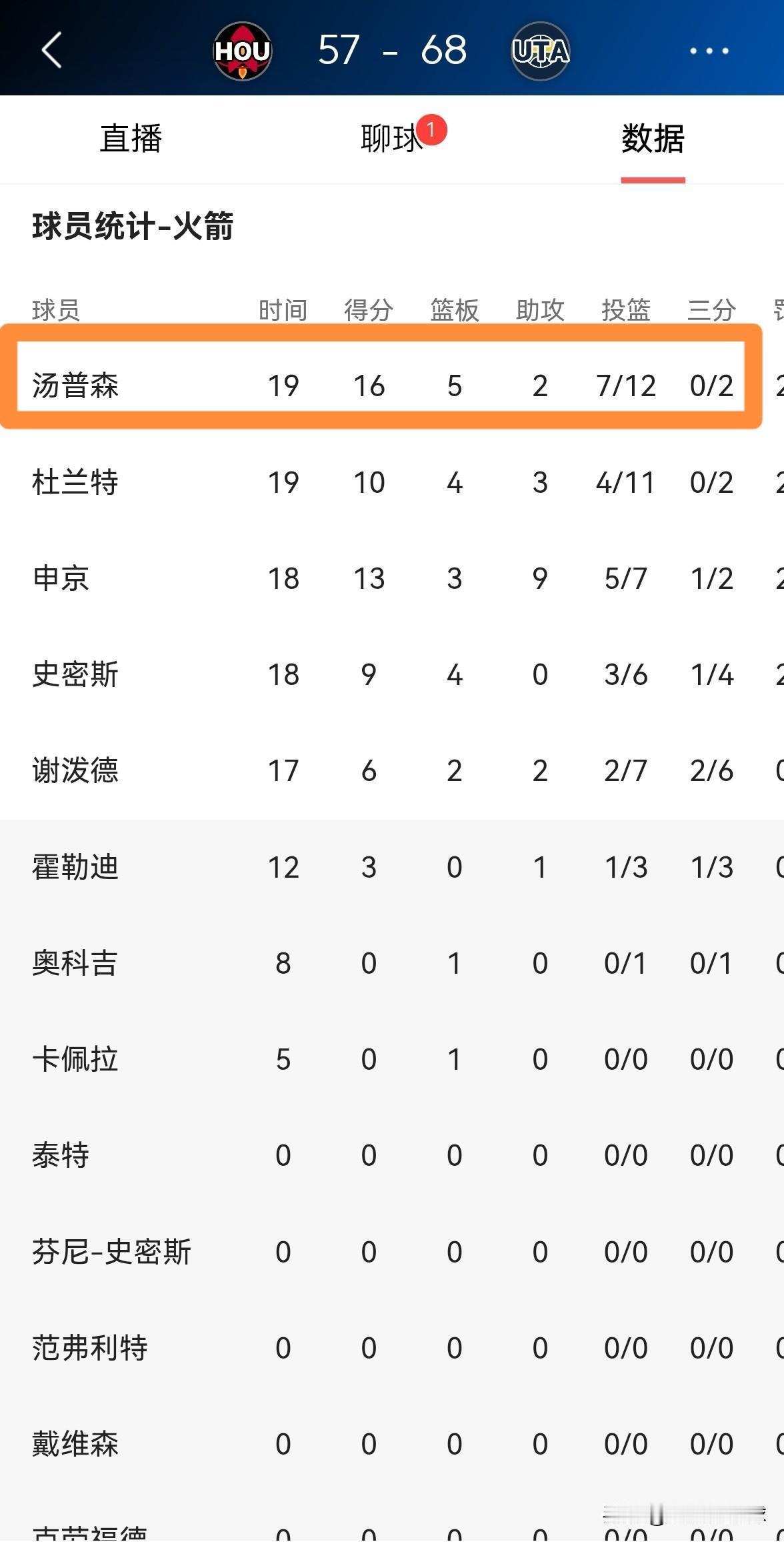 火箭超级新星阿门-汤普森真是太神勇了!在今天火箭客场挑战爵士的上半场比赛中,阿门在老大哥杜兰特表现不佳的情况下独挑大梁,他在首发出战的19分钟里,投篮12中7,其中罚球3中2得到16分5篮板2助攻2盖帽,没有出现任何的失误。 虽然目前火箭以57:68落后于爵士,但是阿门在前两节比赛中的表现堪称神勇。