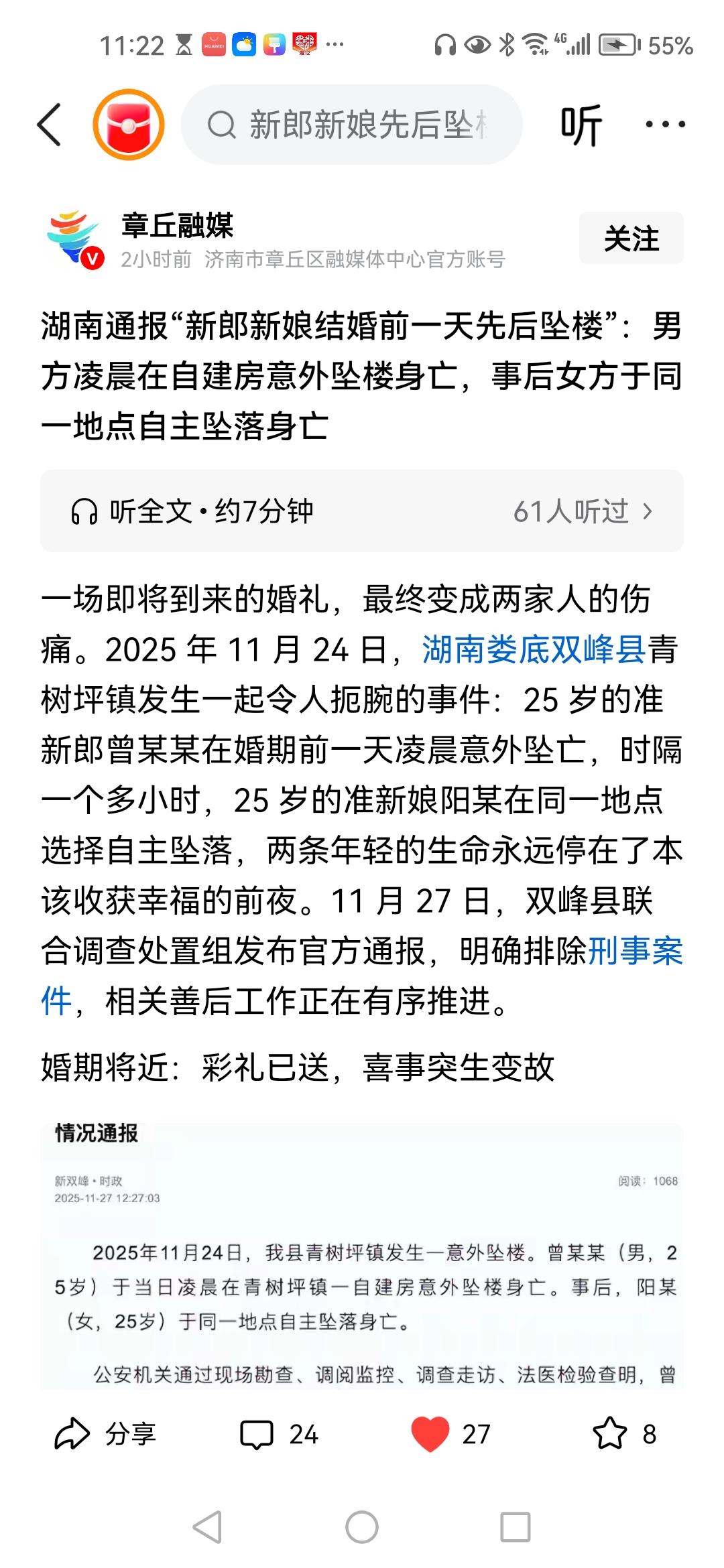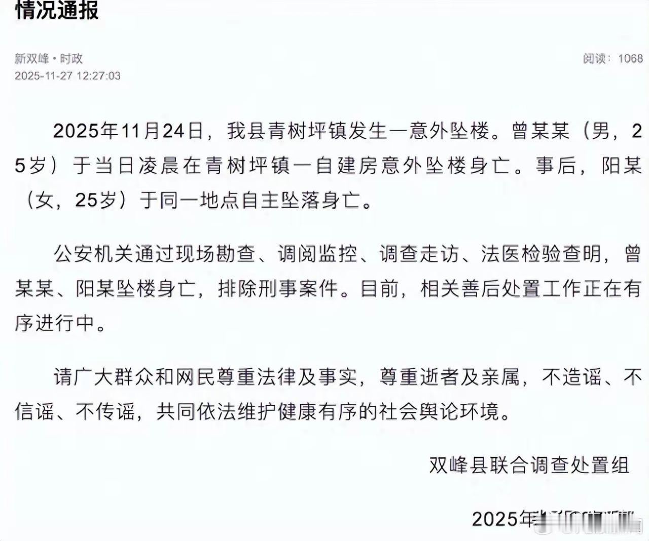湖南双峰县针对情侣先后坠亡事件发布调查公告,公告中肯定了男方是意外坠亡,而一小时之后女方的坠亡为自主。 这一事件我觉得最可惜的是女方坠亡,为什么这么说呢? 男方昨夜有饮酒,但未到醉酒状态。其住在4楼,窗户距地有1米高,据推测是其误以为窗户是厕所门,其推开去小便,才意外坠亡。 在得知男友坠亡后,女方极度悲伤,几近崩溃,其一小时后进入男方住的4楼房间,选择了自主坠亡。 女方太可惜了!再其精神不稳定的情况下,如果家人能派人跟随保护,女方的去世完全是可以避免的啊! 这也告诉我们,如果遇到此类问题,一定要看管好精神不稳定的人员,防止悲剧二次发生!