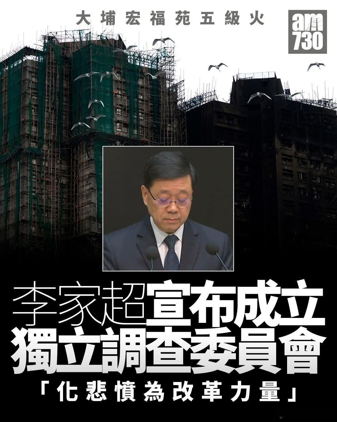 特首:不论涉及任何人都问责到底,制度不足要改革香港行政长官李家超今天(2日)出席行会前会见传媒,公布将成立由法官主持的「独立委员会」,审视起火、迅速蔓延原因及相关问题,「我要求调查到底,认真改革,化悲愤为改革力量,不论涉及任何人都问责到底,追责到底」。他表示多个环节失误问题,要系统性改革,包括第一楼宇维修工程施工安全、日常维护,第二有否相连利益、合谋串联,第三用料清单是否全面,检测是否有效,第四角色的承担,包括政府及专业人员,第五招标问题,第六大厦消防系统运作的监督,第七大火的相关责任,第八法律惩罚的足够性。他指调查进行时,会同时成立法官组成的独立委员会,要研究详细工作范围,政府提供所需资料,以提供更多支持,向他提出建议及报告。香港火灾女子拍门救4人自己遇难警方发言人哽咽称有遗体已化成灰烬