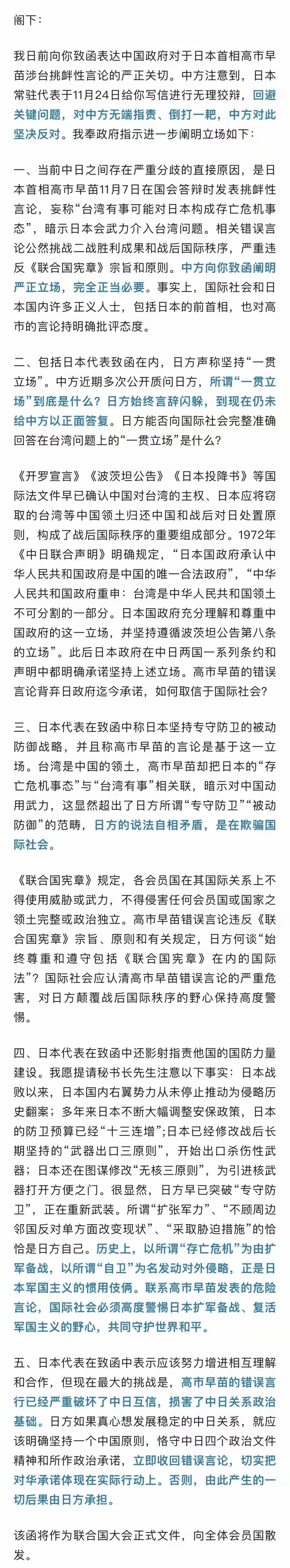 中方对日再出重拳! 12月1日,中方再次致电联合国批驳日方错误言论,以及罪恶行径,从历史法理、正义善行、罪行罪状、后果忧患和劝其知返5个纬度以“痛打落水狗”的方式重申我方关注关切正义立场。 对恶的宽容可能会成为对善的背叛。 “痛打落水狗”必须国仇家恨一起找,把同胞受的苦、流的泪、受的伤等全部拉单列表,让其买单,跪地谢罪! “痛打落水狗”必须新账旧账一起算,把弄虚作假、篡改真实历史,不思悔改,还企图挑起台海事端等罪恶行径全部背书,让世界看清丑恶嘴脸,断其交往。 “痛打落水狗”必须外毒腐肉一起挖,把违规扩充武装力量,勾连外部力量捆绑“战车”,蛊惑“台独”分子对抗大陆的行径全部揭发,必要时军事震慑按在地上使劲摩擦。 “痛打落水狗”必须伸张正义一起揍,联合曾经被侵略受伤的国家,从国际政治、经济和外交等各个途径围堵,全部施压,破其经济疲软,国民愤慨,不留喘息之力。 如今,东方大国不再饥寒交迫,受人欺凌任人宰割,胆敢犯我中华者必诛之!