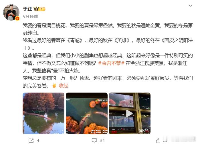 顶级剧本金吾不禁获于正认可,梦想让平凡的生活有了光芒,坚定信念不断前行,终能抵达向往的远方。于正说金吾不禁顶级剧本于正梦想总是要有的万一呢