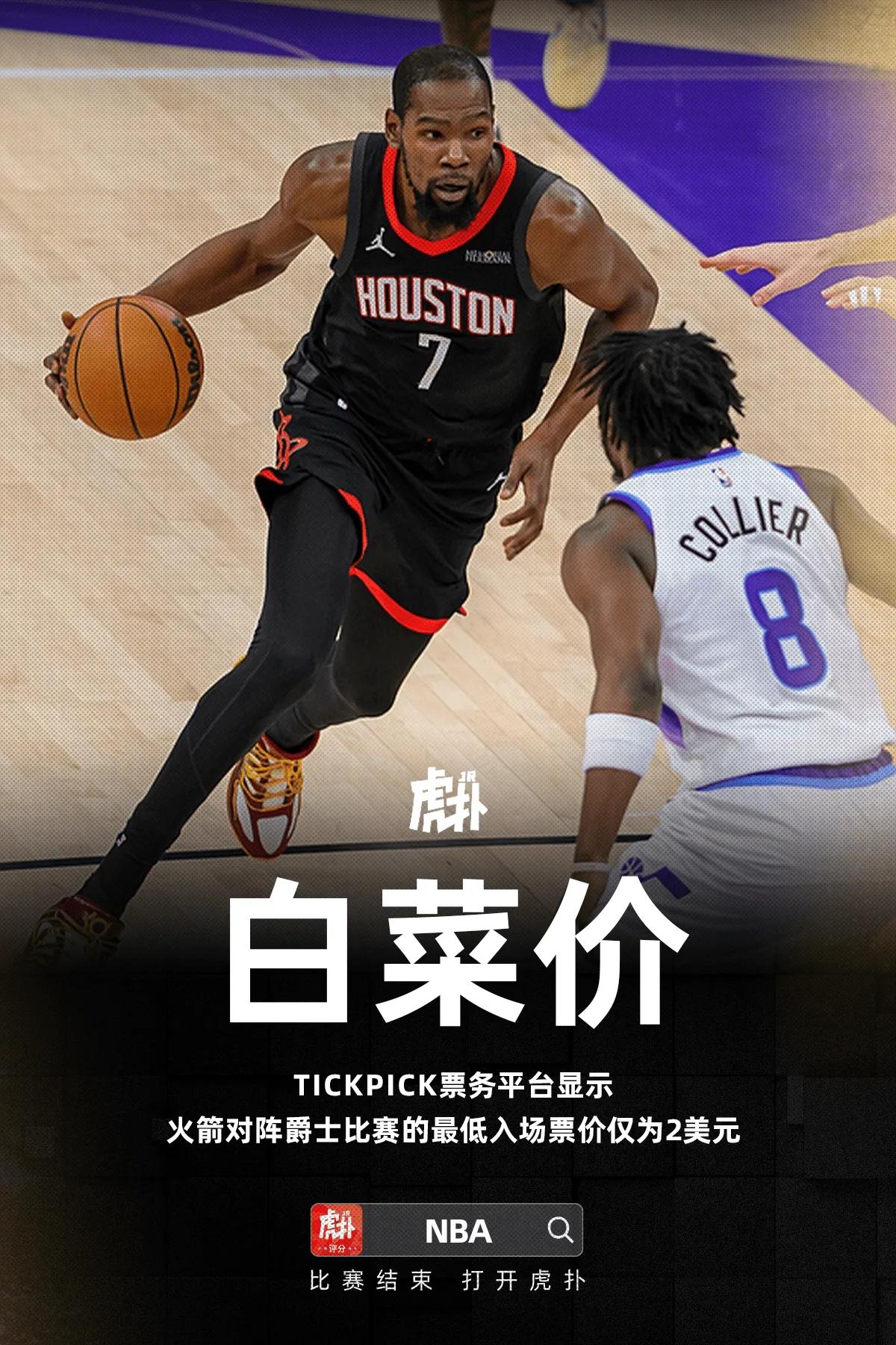 这真是白菜价了! 今天火箭和爵士的这场比赛,最低票价居然只要2美元,换算成人民币也就是14块钱。 这也太便宜了吧,不到十五块钱,就能现场看杜兰特打球了。 就算这是爵士的主场,但好歹对手也是火箭这样的流量队啊,怎么还这么便宜啊,而且看比赛直播,确实前排都没坐满……